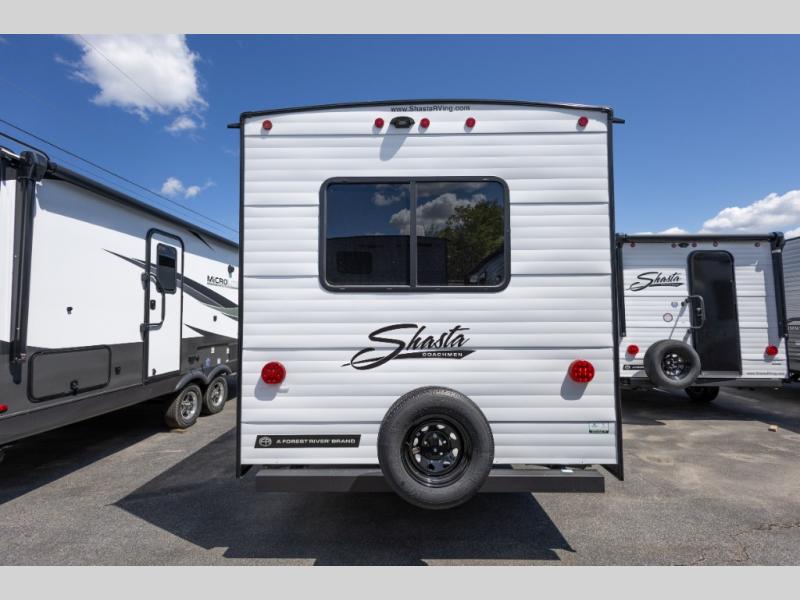 In any Shasta i-5 Edition travel trailer, you will find quality craftsmanship along with an affordable price tag. These units each feature four stabilizer jacks to make setting up easier and an enclosed underbelly for added protection as you travel. The Base Camp Package provides each unit with black tank flush, a monitor panel for quick access to the functions of your unit, a 13.5K A/C unit, and a tankless water heater for added convenience. Inside, you'll find seamless countertops, sink covers, a portable Bluetooth speaker, and more comforts!