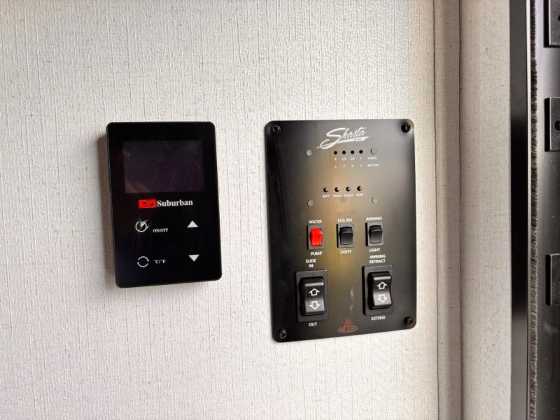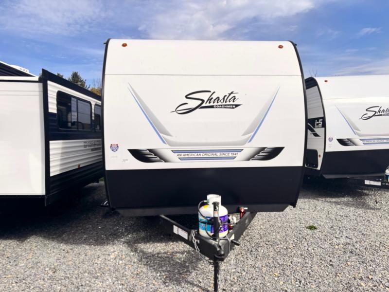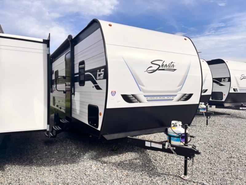 In any Shasta i-5 Edition travel trailer, you will find quality craftsmanship along with an affordable price tag. These units each feature four stabilizer jacks to make setting up easier and an enclosed underbelly for added protection as you travel. The Base Camp Package provides each unit with black tank flush, a monitor panel for quick access to the functions of your unit, a 13.5K A/C unit, and a tankless water heater for added convenience. Inside, you'll find seamless countertops, sink covers, a portable Bluetooth speaker, and more comforts!