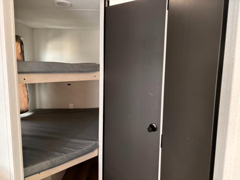 Enjoy camping with family and friends in this Shasta i-5 Edition bunk model! There are double-size bunks in the rear roadside corner and a full bath with a shower, vanity, and toilet in the opposite rear corner. There is ample counter space in the kitchen, plus there is an outside kitchen when you want to cook outdoors. You will also love the pantry in this unit that is washer/dryer ready if you want to add those appliances. A booth dinette within the large slide will provide a place to dine and play games together, and there is a TV mount across the room if you want to add entertainment. You'll love having a front bedroom with a 60" x 74" bed and dual wardrobes to keep your things picked up!