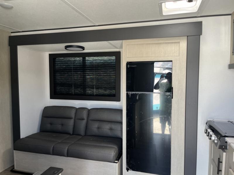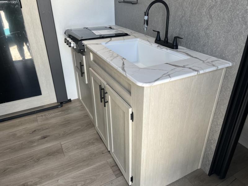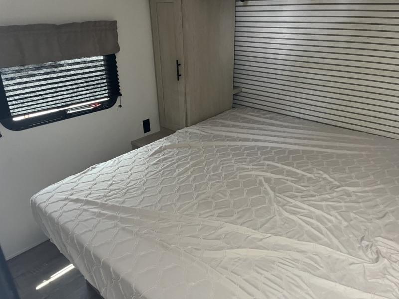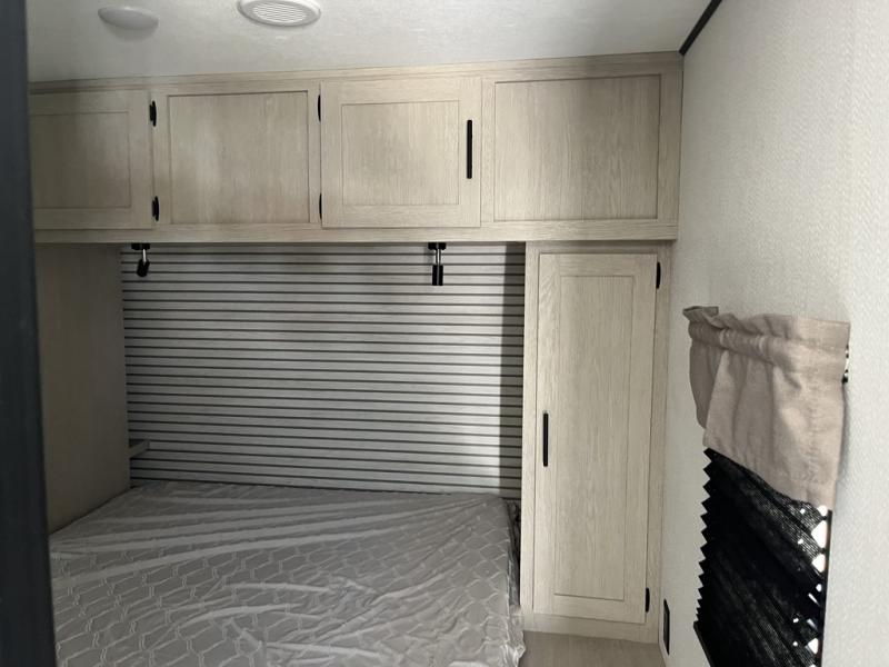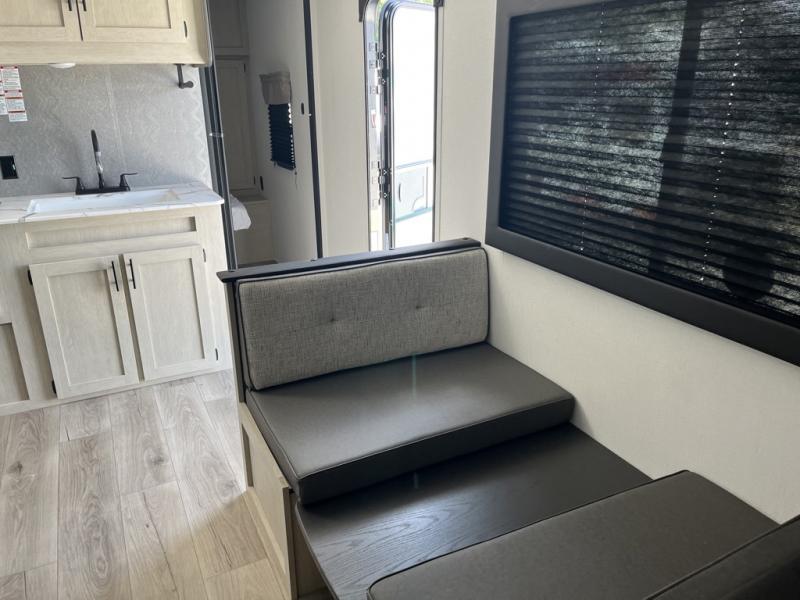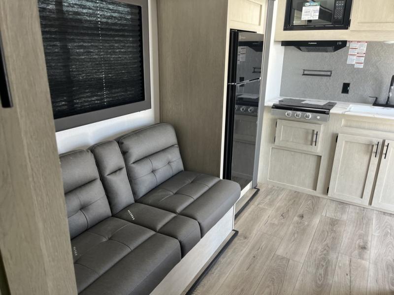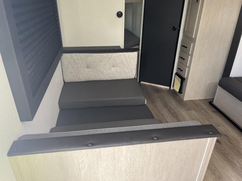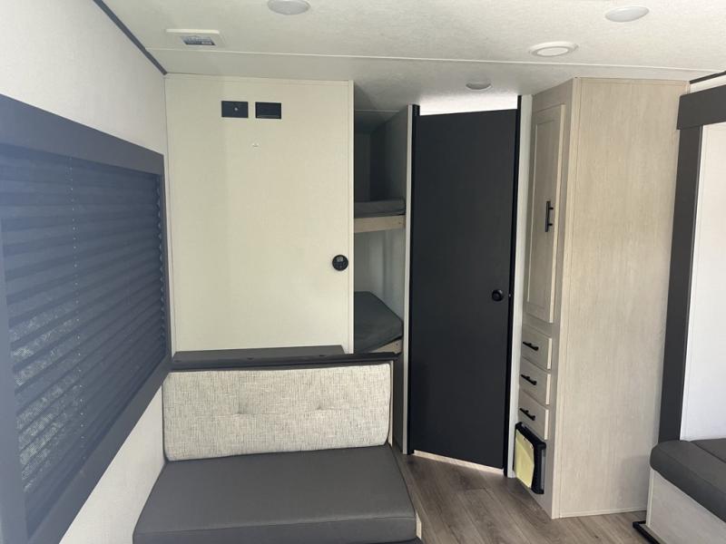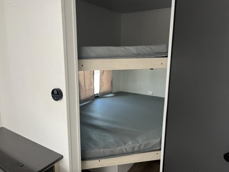 Your kids will love this travel trailer's double-size bunks that provide a cozy spot for children or guests, while the full bathroom offers convenience and comfort. The booth dinette is perfect for sharing meals with family or friends, and the pantry keeps your essentials organized. An entertainment center and sofa create a relaxing atmosphere to enjoy your favorite shows, and a refrigerator keeps your favorite snacks and drinks fresh. The front bedroom features a spacious queen bed, a dual wardrobe, and shelves for ample storage. On the exterior, the pass-through storage provides additional space for gear or equipment, and an outside kitchen offers the perfect spot for alfresco cooking and entertaining.