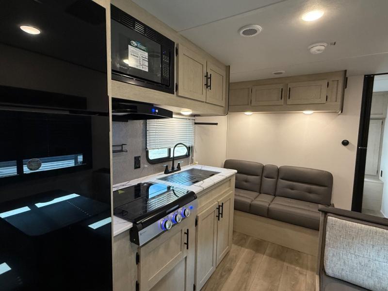 In any Shasta i-5 Edition travel trailer, you will find quality craftsmanship along with an affordable price tag. These units each feature four stabilizer jacks to make setting up easier and an enclosed underbelly for added protection as you travel. The Base Camp Package provides each unit with black tank flush, a monitor panel for quick access to the functions of your unit, a 13.5K A/C unit, and a tankless water heater for added convenience. Inside, you'll find seamless countertops, sink covers, a portable Bluetooth speaker, and more comforts!