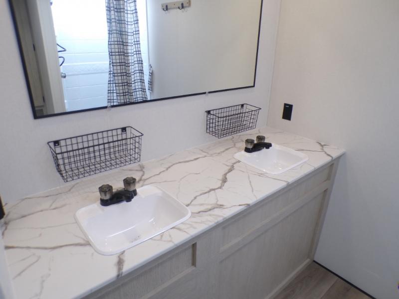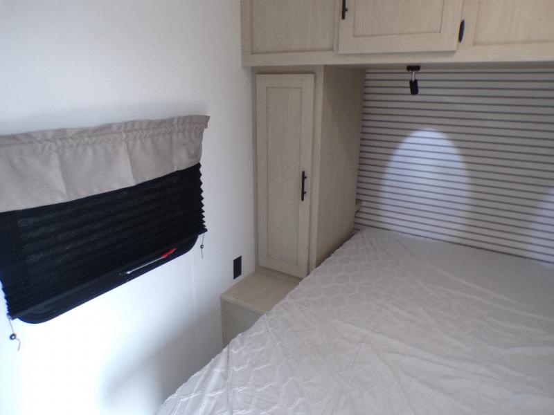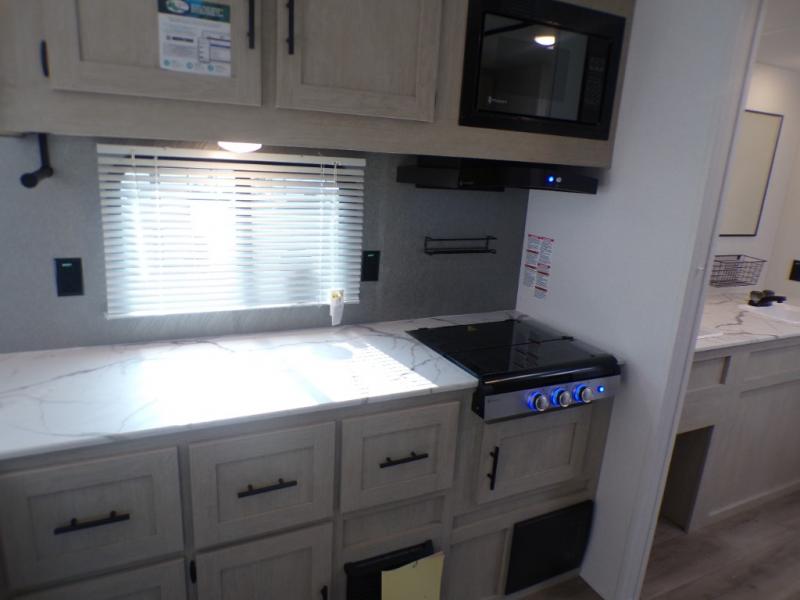You'll feel right at home in this spacious travel trailer thanks to the large slide out, front bedroom, and full rear bath. There is a 24" x 40" tub, a toilet with partitions, and dual bath sinks with a mirror which allow you both to get ready for bed at once. The fully-equipped interior kitchen includes generous counter space to prep meals, and the outside kitchen will be perfect when the weather is nice. A large pantry will give you a place to store food, paper products, and more, plus this space is washer/dryer ready if you choose to add those appliances.