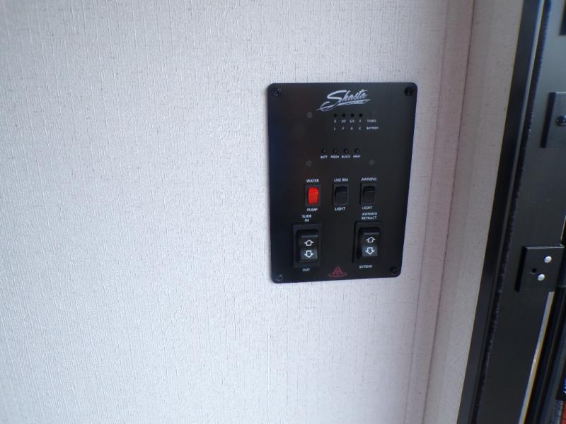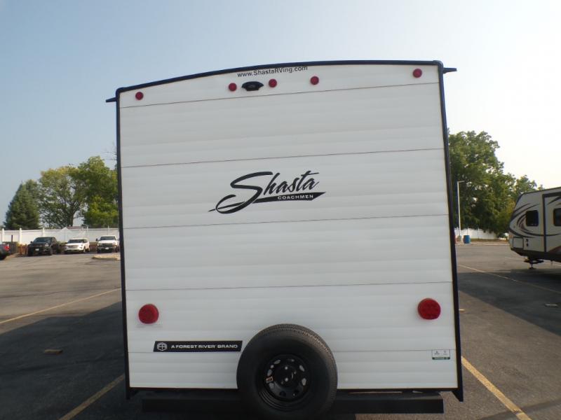 In any Shasta i-5 Edition travel trailer, you will find quality craftsmanship along with an affordable price tag. These units each feature four stabilizer jacks to make setting up easier and an enclosed underbelly for added protection as you travel. The Base Camp Package provides each unit with black tank flush, a monitor panel for quick access to the functions of your unit, a 13.5K A/C unit, and a tankless water heater for added convenience. Inside, you'll find seamless countertops, sink covers, a portable Bluetooth speaker, and more comforts!