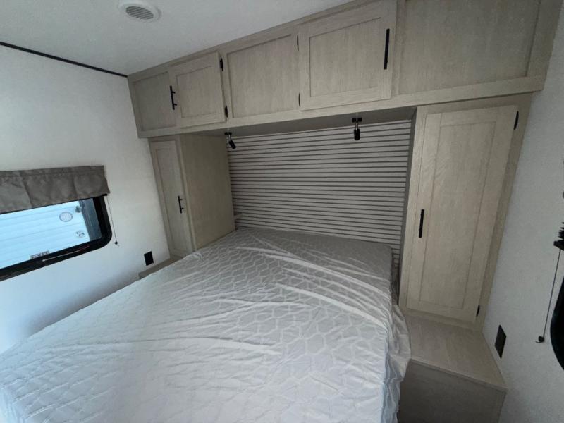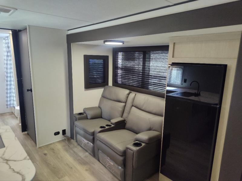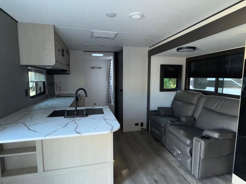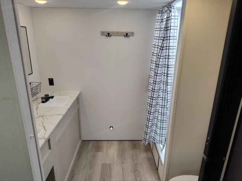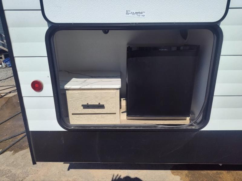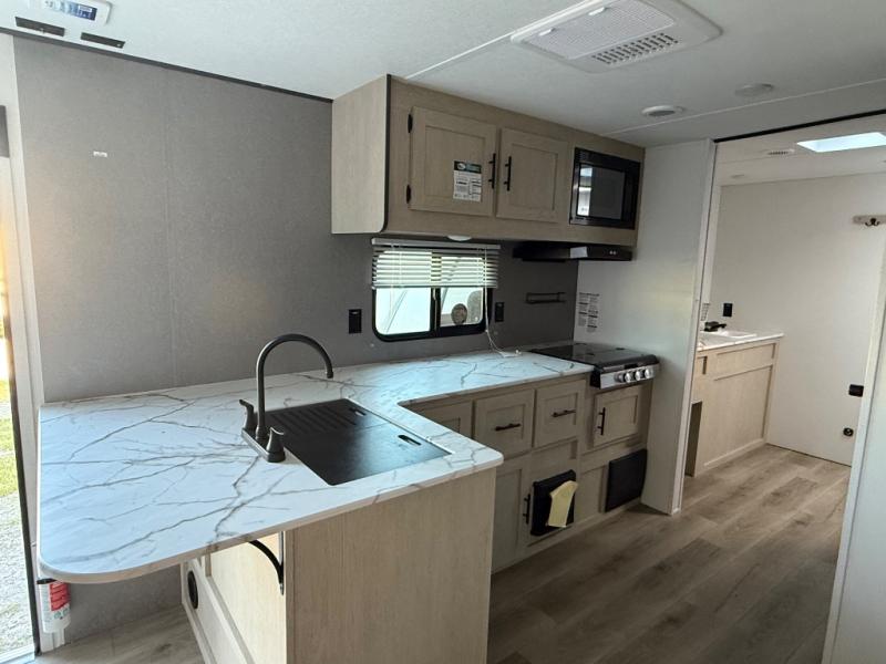 You'll feel right at home in this spacious travel trailer thanks to the large slide out, front bedroom, and full rear bath. There is a large walk-in shower, a toilet with partitions, and dual bath sinks with a mirror which allow you both to get ready for bed at once. The fully equipped interior kitchen includes generous counter space to prep meals, and the outside kitchen will be perfect when the weather is nice. A large pantry will give you a place to store food, paper products, and more, plus this space is washer/dryer ready if you choose to add those appliances.