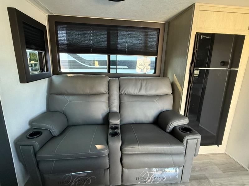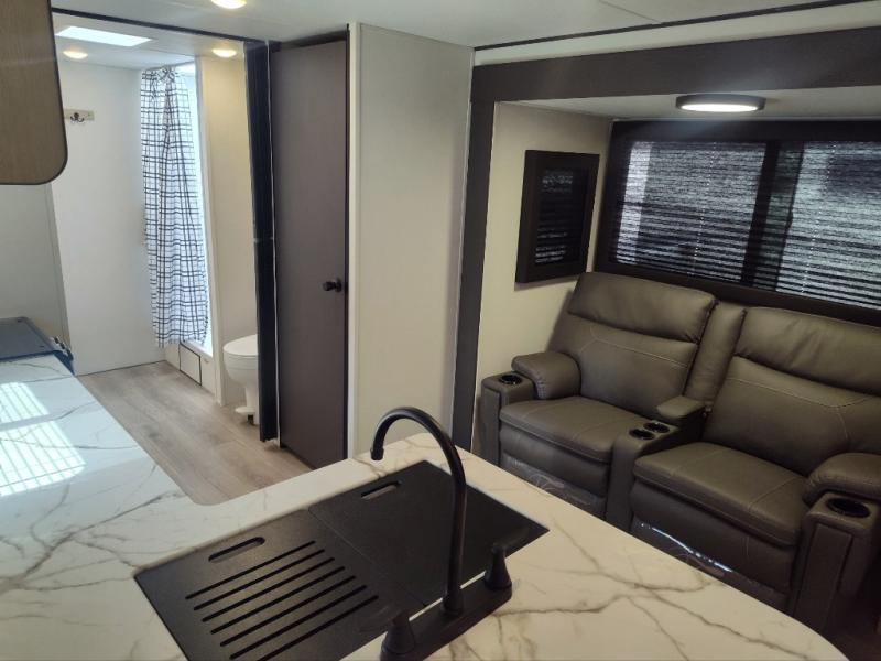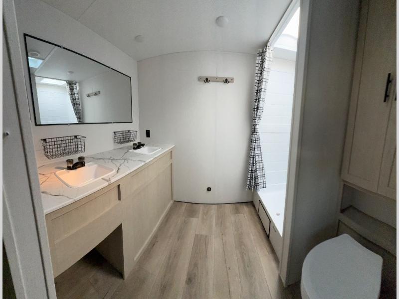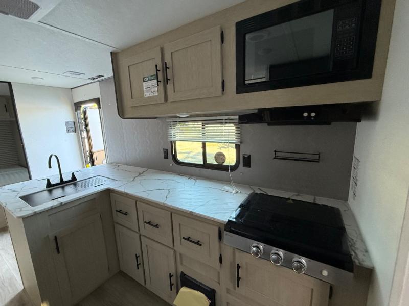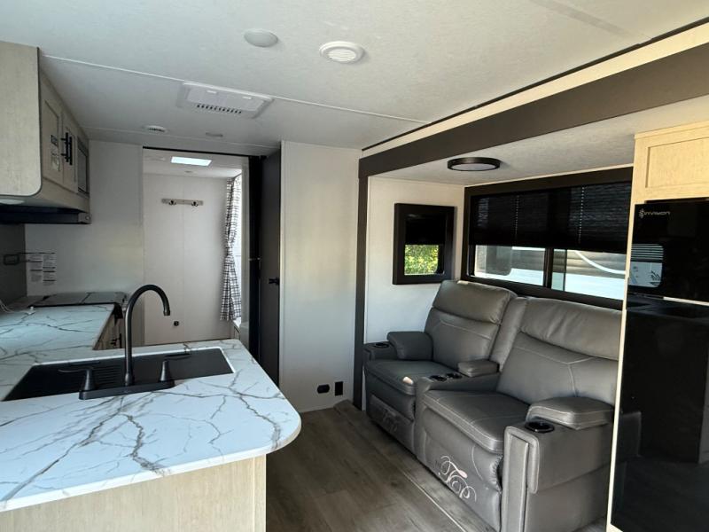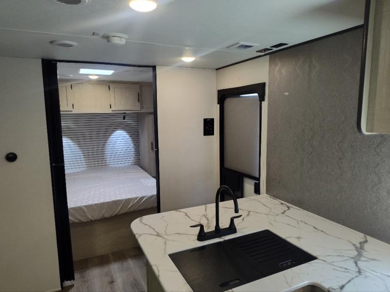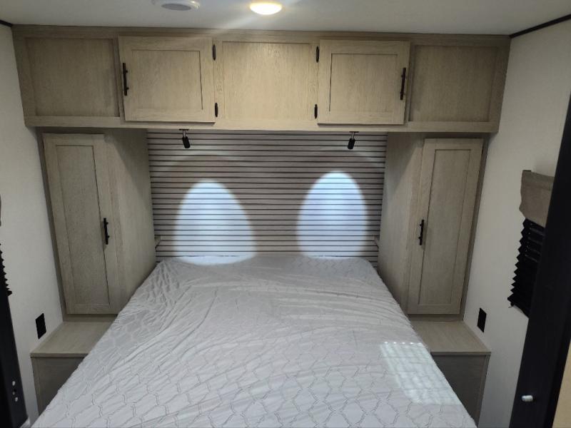 You'll feel right at home in this spacious travel trailer thanks to the large slide out, front bedroom, and full rear bath. There is a large walk-in shower, a toilet with partitions, and dual bath sinks with a mirror which allow you both to get ready for bed at once. The fully equipped interior kitchen includes generous counter space to prep meals, and the outside kitchen will be perfect when the weather is nice. A large pantry will give you a place to store food, paper products, and more, plus this space is washer/dryer ready if you choose to add those appliances.