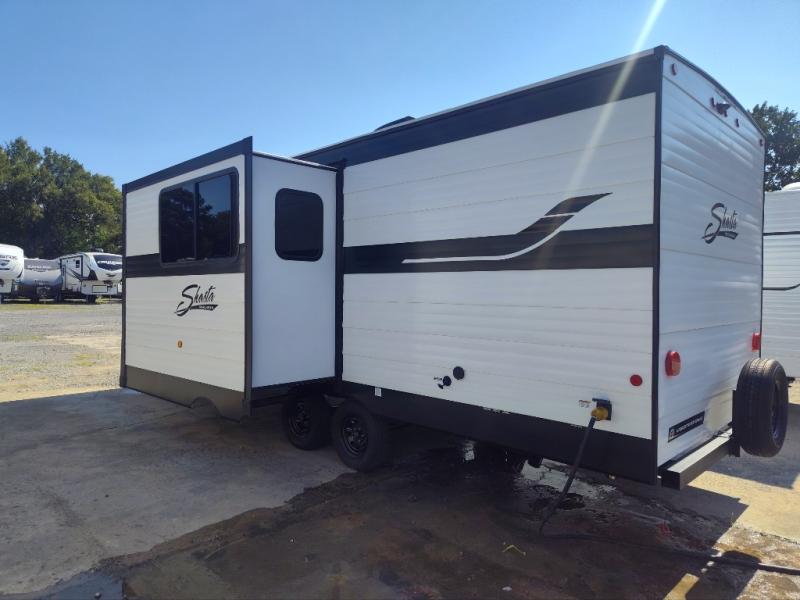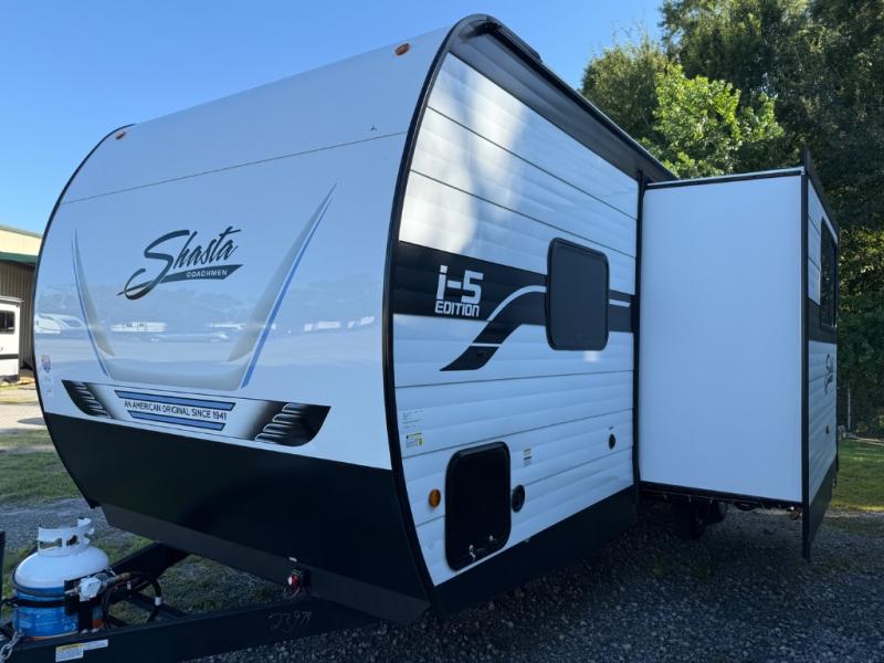 In any Shasta i-5 Edition travel trailer, you will find quality craftsmanship along with an affordable price tag. These units each feature four stabilizer jacks to make setting up easier and an enclosed underbelly for added protection as you travel. The Base Camp Package provides each unit with black tank flush, a monitor panel for quick access to the functions of your unit, a 13.5K A/C unit, and a tankless water heater for added convenience. Inside, you'll find seamless countertops, sink covers, a portable Bluetooth speaker, and more comforts!