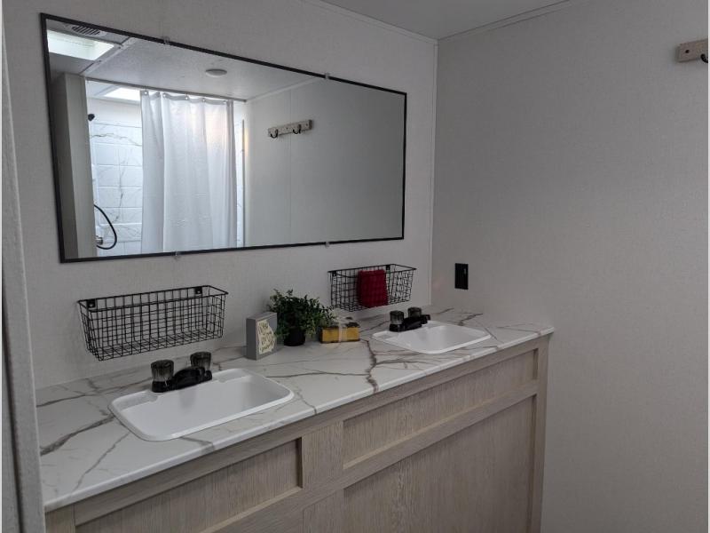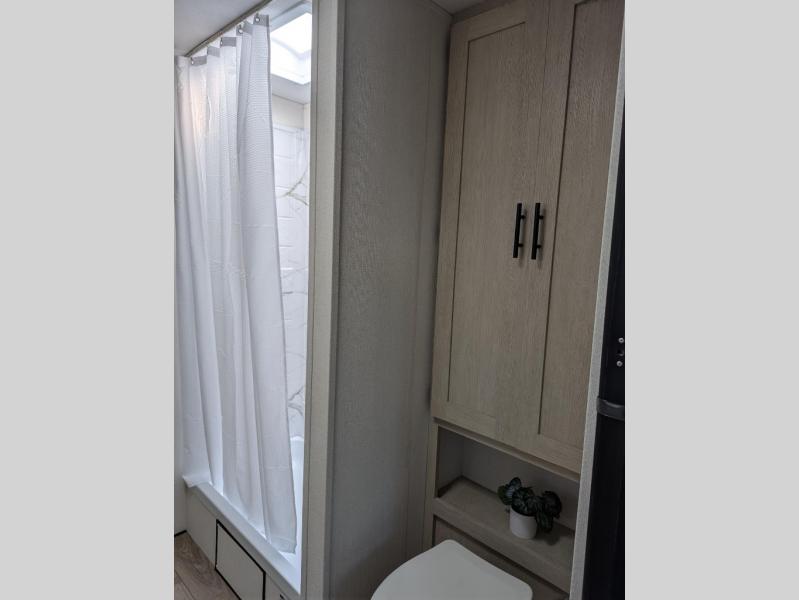 You'll feel right at home in this spacious travel trailer thanks to the large slide out, front bedroom, and full rear bath. There is a 24" x 40" tub, a toilet with partitions, and dual bath sinks with a mirror which allow you both to get ready for bed at once. The fully-equipped interior kitchen includes generous counter space to prep meals, and the outside kitchen will be perfect when the weather is nice. A large pantry will give you a place to store food, paper products, and more, plus this space is washer/dryer ready if you choose to add those appliances.