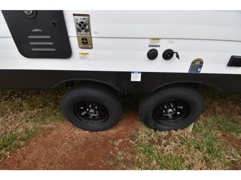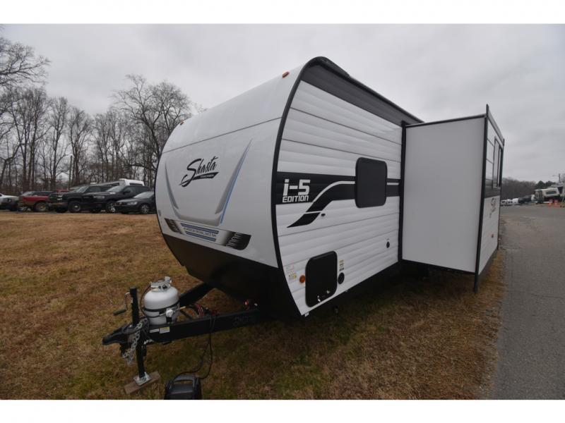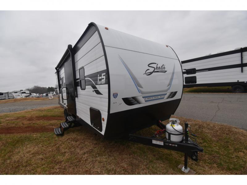 In any Shasta i-5 Edition travel trailer, you will find quality craftsmanship along with an affordable price tag. These units each feature four stabilizer jacks to make setting up easier and an enclosed underbelly for added protection as you travel. The Base Camp Package provides each unit with black tank flush, a monitor panel for quick access to the functions of your unit, a 13.5K A/C unit, and a tankless water heater for added convenience. Inside, you'll find seamless countertops, sink covers, a portable Bluetooth speaker, and more comforts!