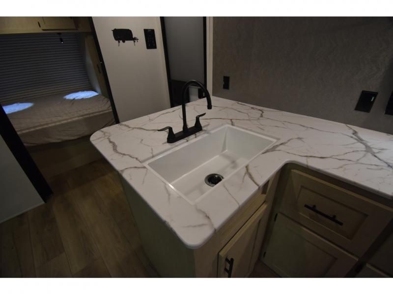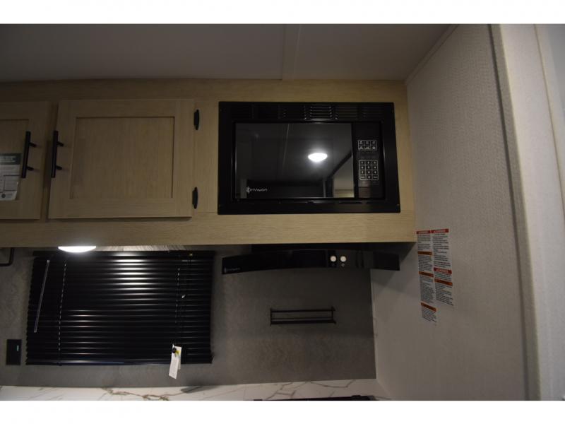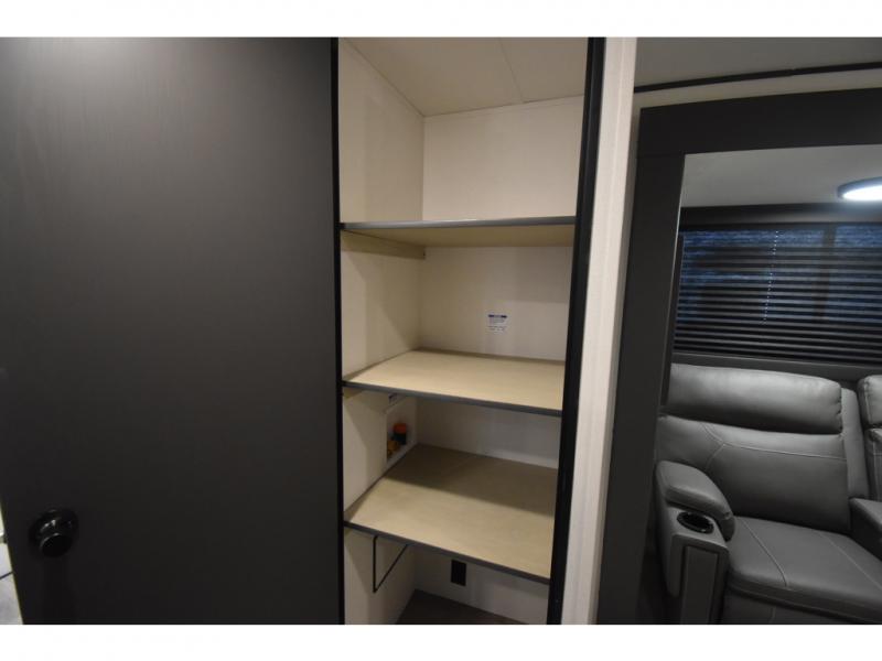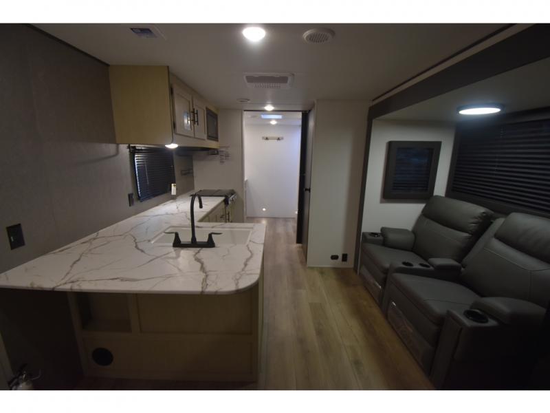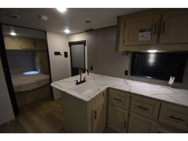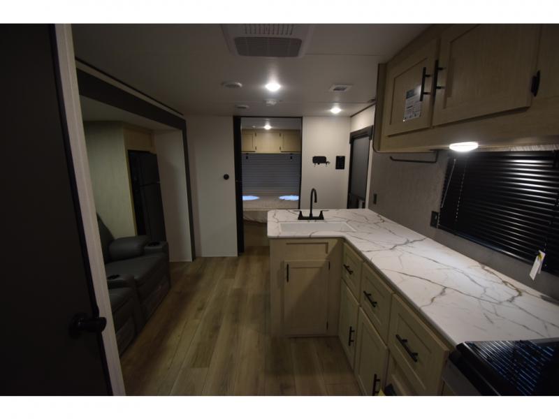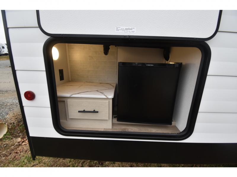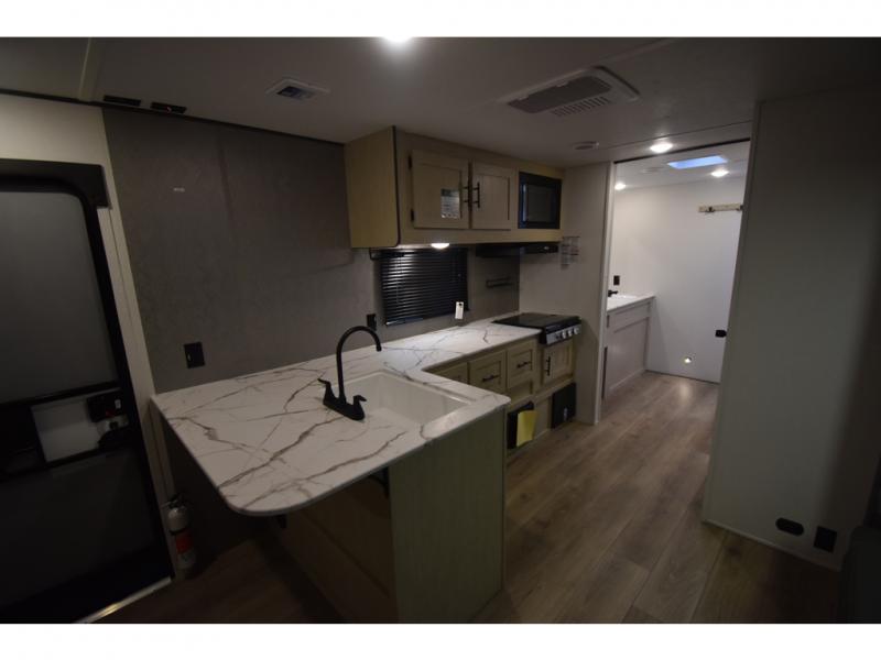You'll feel right at home in this spacious travel trailer thanks to the large slide out, front bedroom, and full rear bath. There is a 24" x 40" tub, a toilet with partitions, and dual bath sinks with a mirror which allow you both to get ready for bed at once. The fully-equipped interior kitchen includes generous counter space to prep meals, and the outside kitchen will be perfect when the weather is nice. A large pantry will give you a place to store food, paper products, and more, plus this space is washer/dryer ready if you choose to add those appliances.