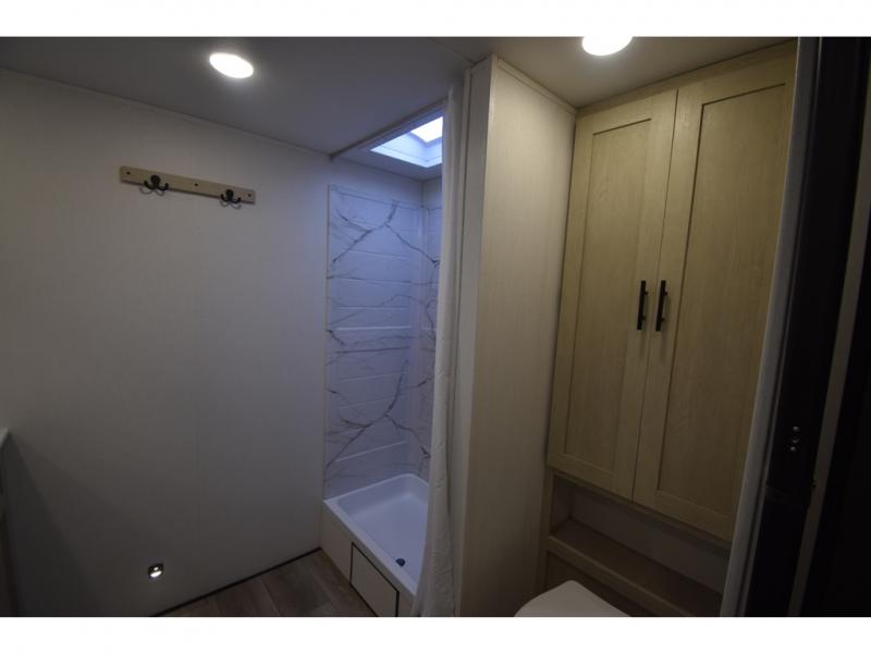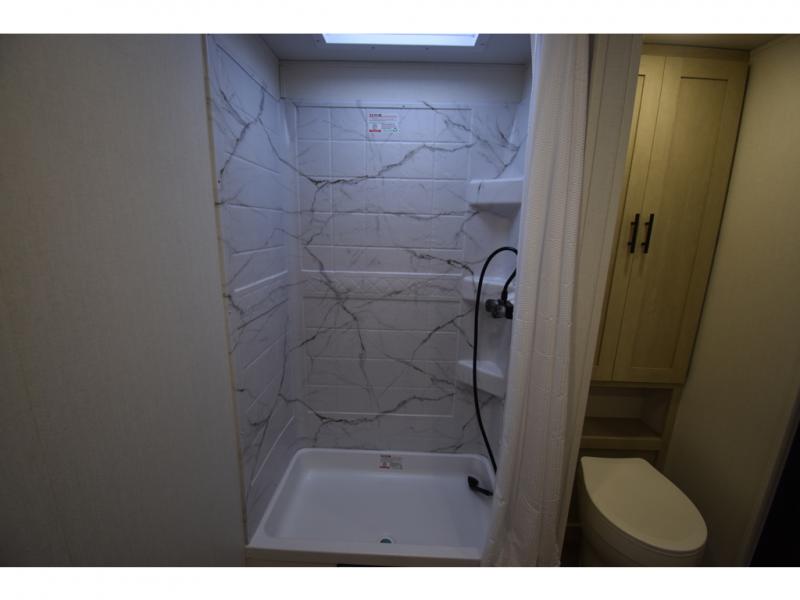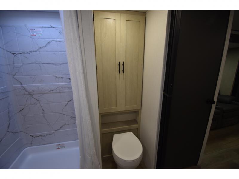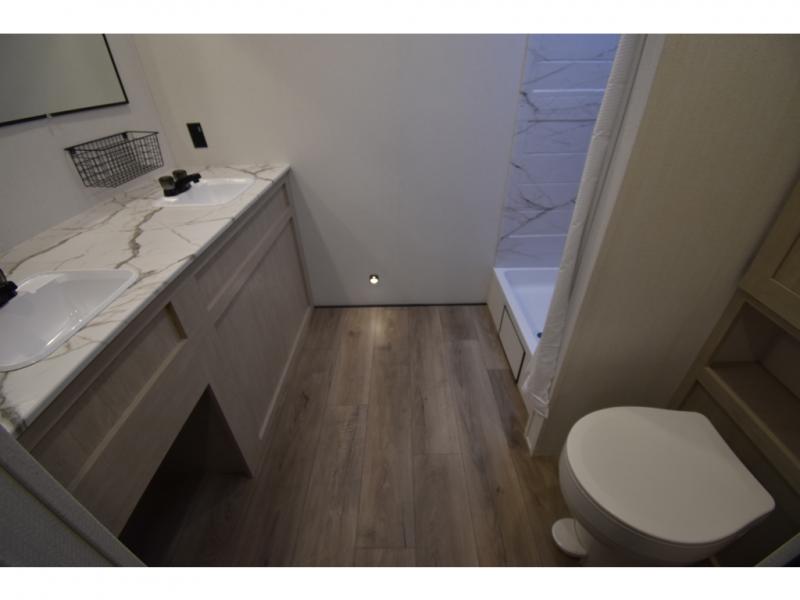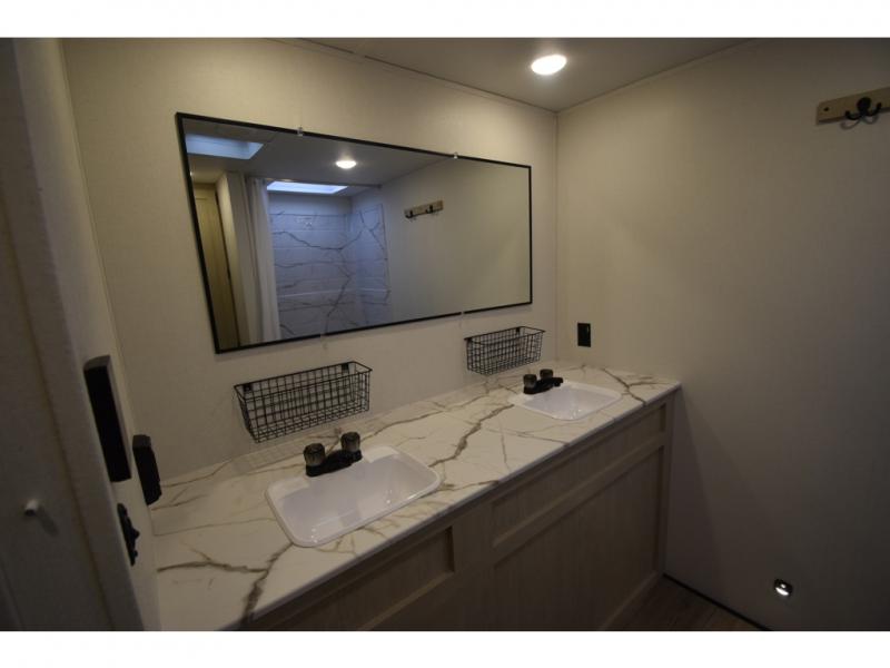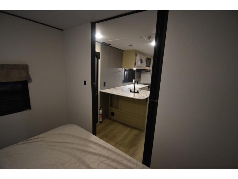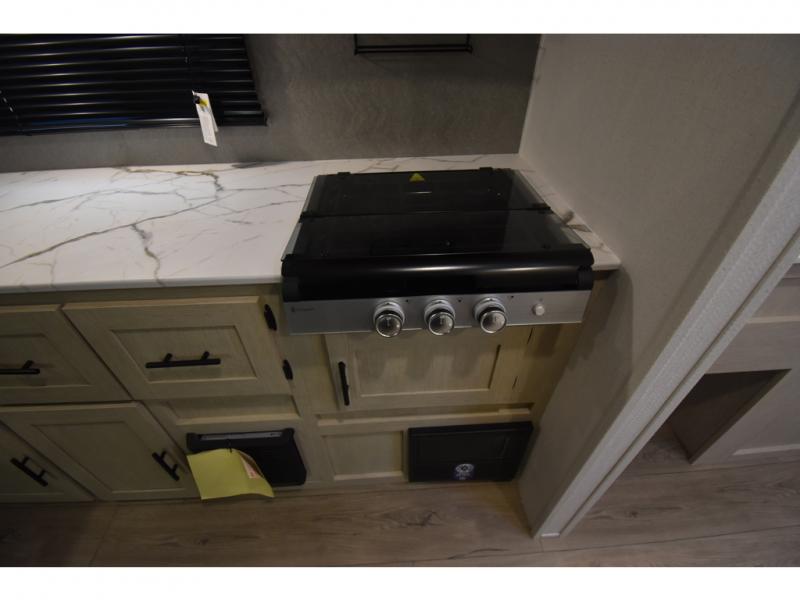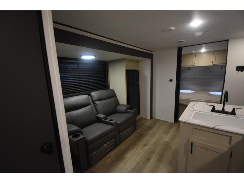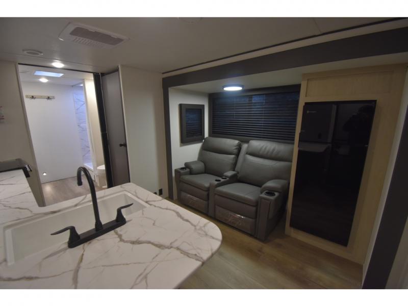 You'll feel right at home in this spacious travel trailer thanks to the large slide out, front bedroom, and full rear bath. There is a 24" x 40" tub, a toilet with partitions, and dual bath sinks with a mirror which allow you both to get ready for bed at once. The fully-equipped interior kitchen includes generous counter space to prep meals, and the outside kitchen will be perfect when the weather is nice. A large pantry will give you a place to store food, paper products, and more, plus this space is washer/dryer ready if you choose to add those appliances.