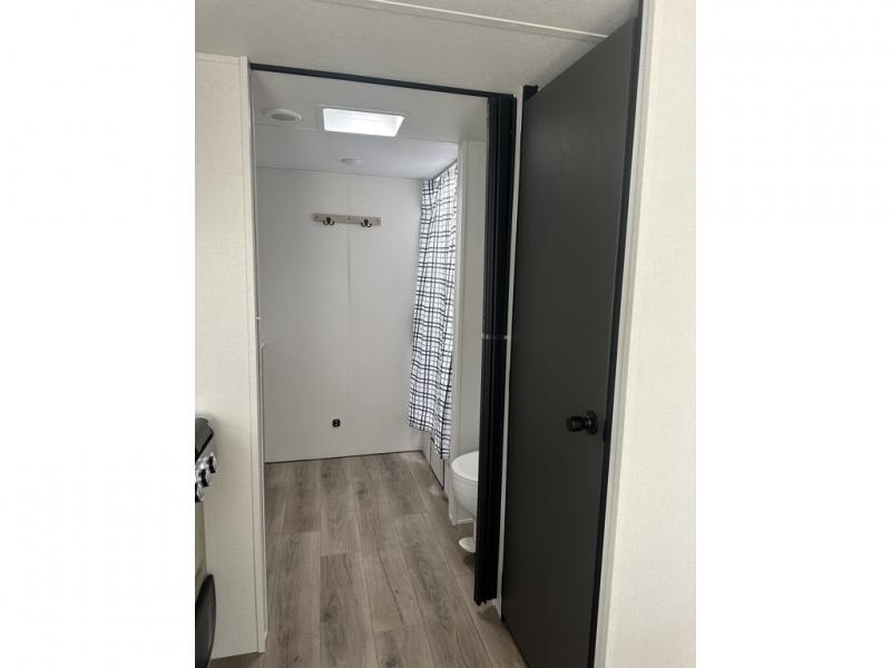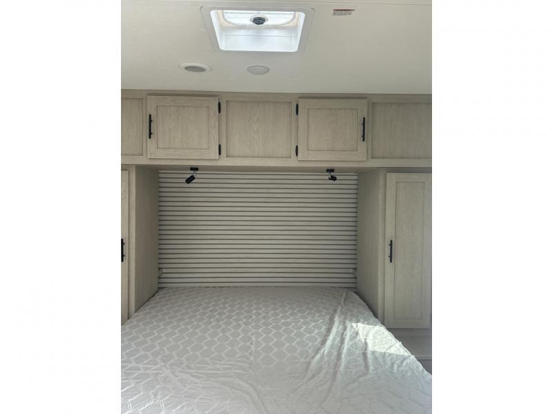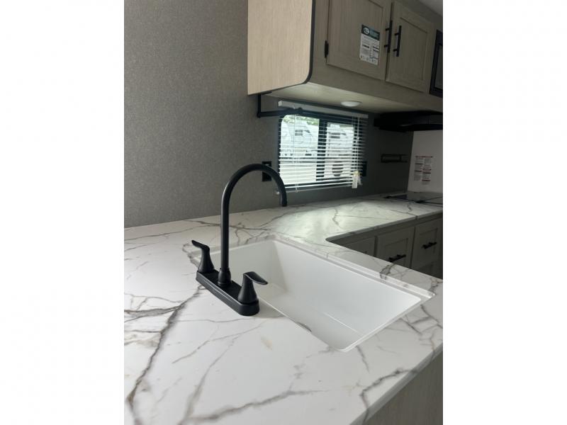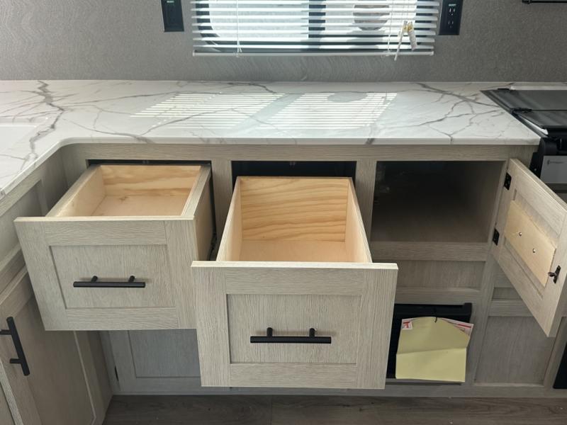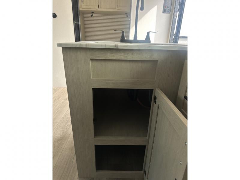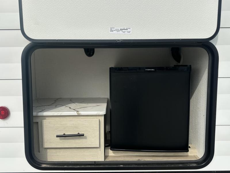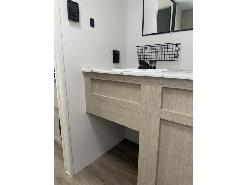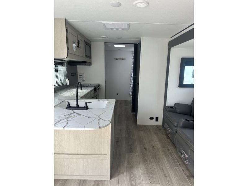 You'll feel right at home in this spacious travel trailer thanks to the large slide out, front bedroom, and full rear bath. There is a 24" x 40" tub, a toilet with partitions, and dual bath sinks with a mirror which allow you both to get ready for bed at once. The fully-equipped interior kitchen includes generous counter space to prep meals, and the outside kitchen will be perfect when the weather is nice. A large pantry will give you a place to store food, paper products, and more, plus this space is washer/dryer ready if you choose to add those appliances.