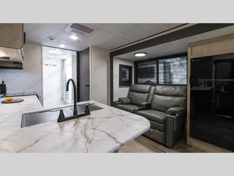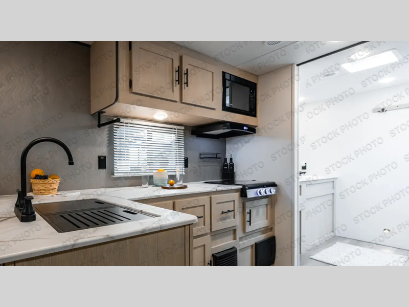 You'll feel right at home in this spacious travel trailer thanks to the large slide out, front bedroom, and full rear bath. There is a 24" x 40" tub, a toilet with partitions, and dual bath sinks with a mirror which allow you both to get ready for bed at once. The fully-equipped interior kitchen includes generous counter space to prep meals, and the outside kitchen will be perfect when the weather is nice. A large pantry will give you a place to store food, paper products, and more, plus this space is washer/dryer ready if you choose to add those appliances.