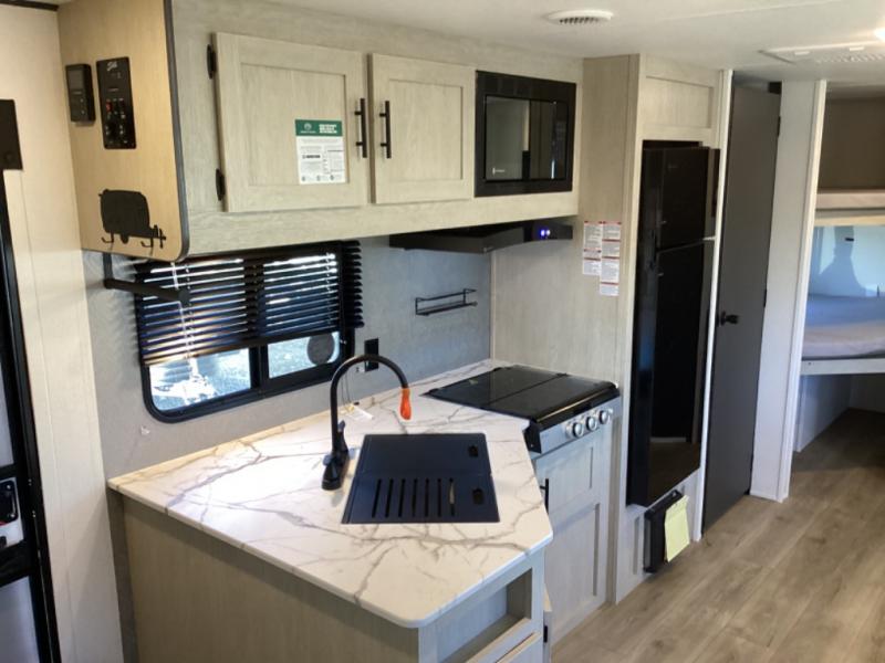 Enjoy camping with family and friends in this Shasta i-5 Edition bunk model! There are double-size bunks in the rear roadside corner and a full bath with shower, vanity, and toilet in the opposite rear corner. The kitchen is fully equipped for your camping trips featuring a three burner cooktop, a microwave, a large sink, and an 8 cu. ft. residential-style refrigerator. You will also love the pantry for all of your canned goods and snacks. To make for a spacious trailer find a large slide that features a dinette and jack knife sofa to relax and serves as two great sleeping spaces. In the front of this unit, a private bedroom with a curtain provides a quiet retreat from the rest of the unit.