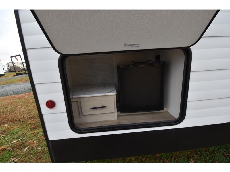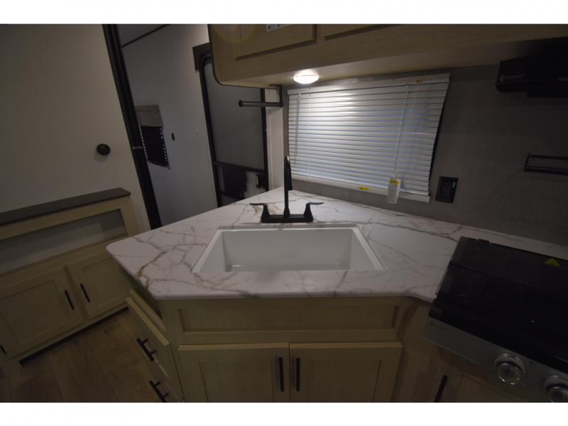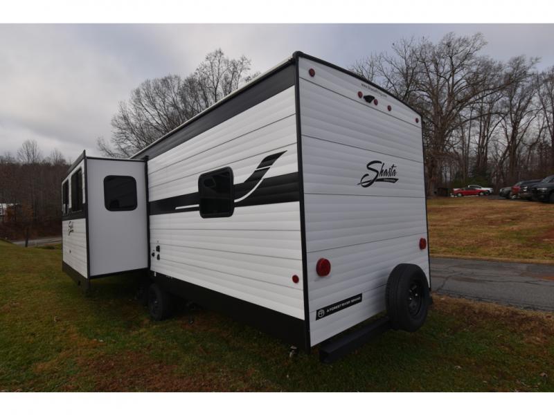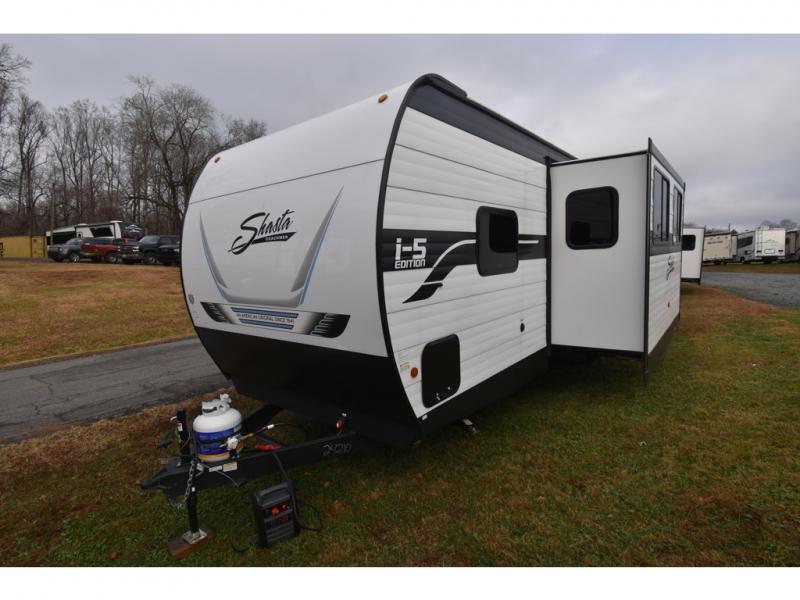 In any Shasta i-5 Edition travel trailer, you will find quality craftsmanship along with an affordable price tag. These units each feature four stabilizer jacks to make setting up easier and an enclosed underbelly for added protection as you travel. The Base Camp Package provides each unit with black tank flush, a monitor panel for quick access to the functions of your unit, a 13.5K A/C unit, and a tankless water heater for added convenience. Inside, you'll find seamless countertops, sink covers, a portable Bluetooth speaker, and more comforts!