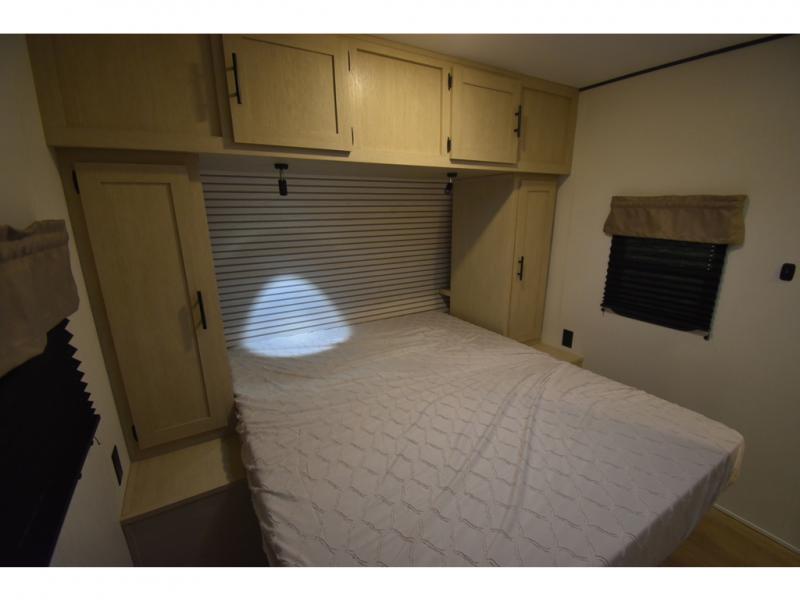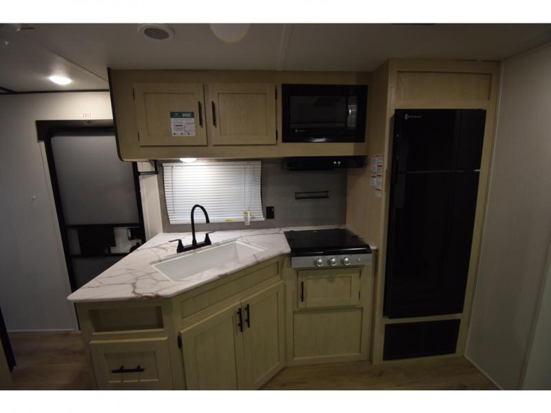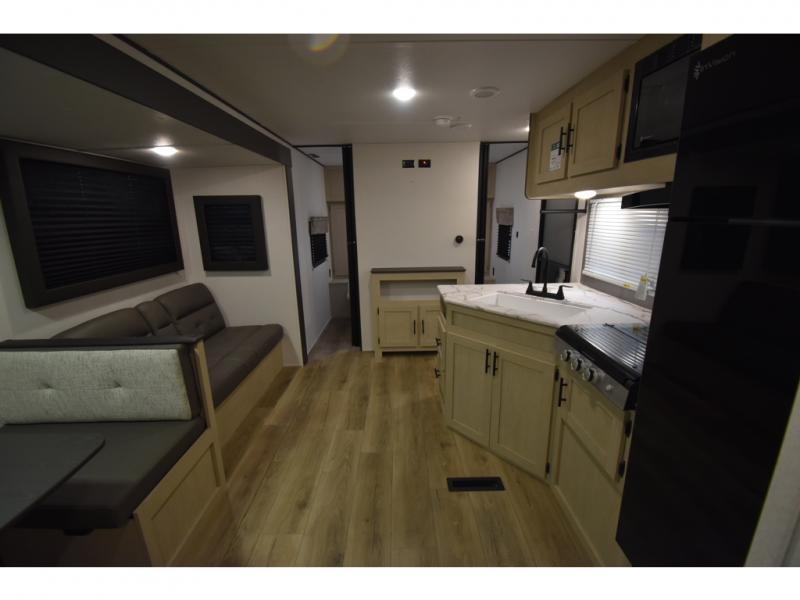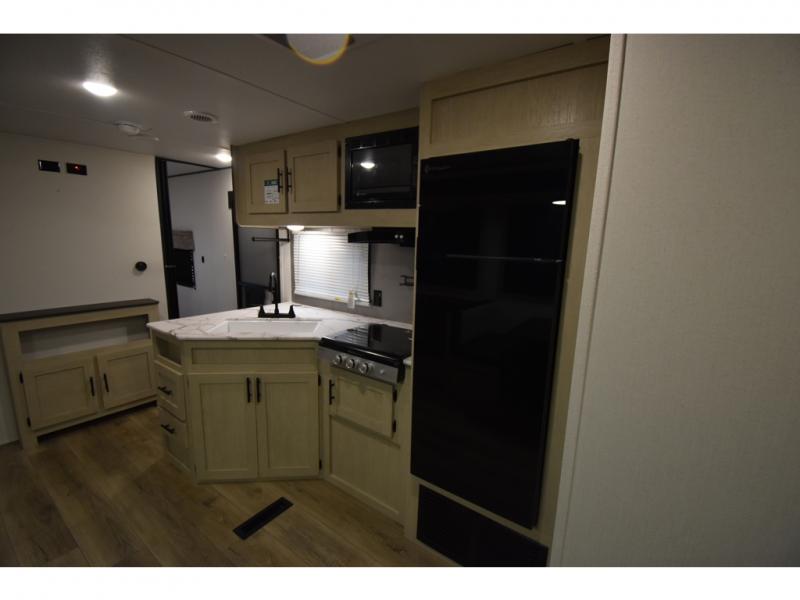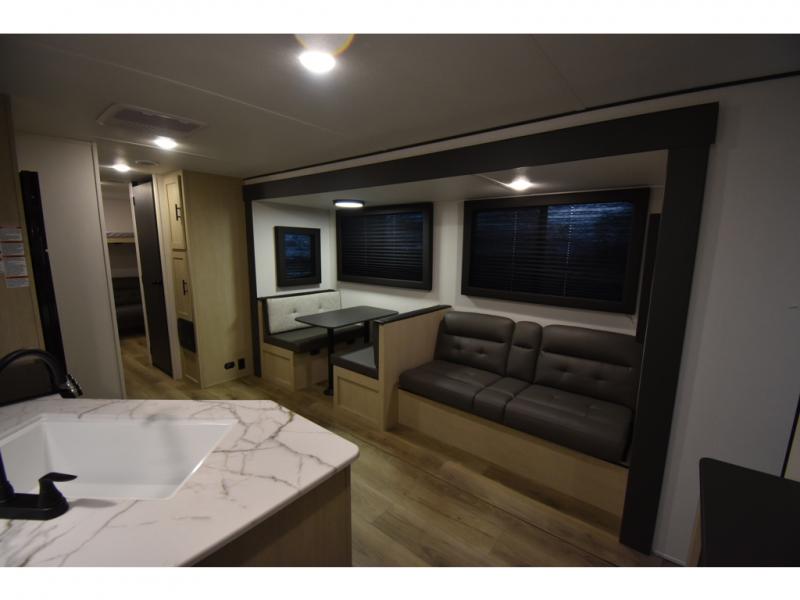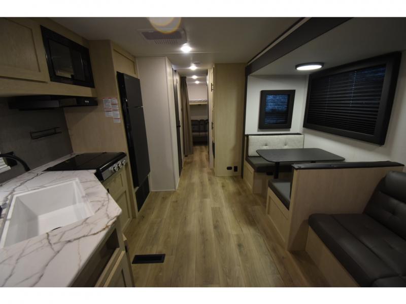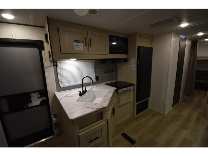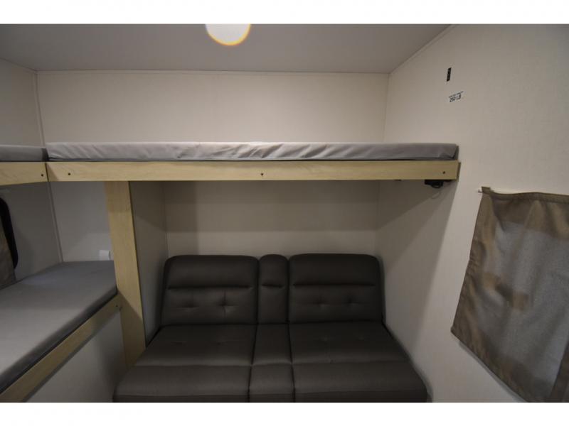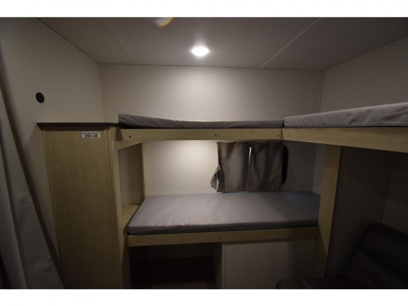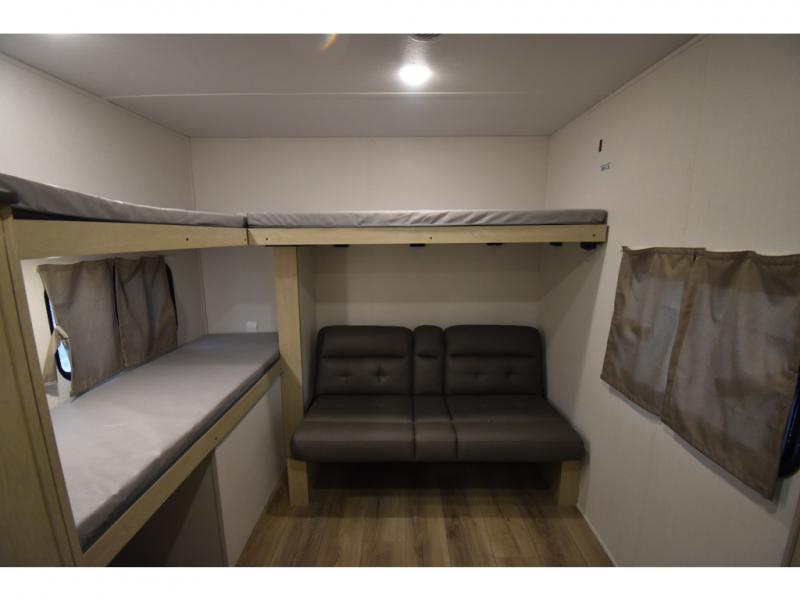 The little ones or your guests will love the bunkhouse in this spacious trailer. There area a set of 26" x 74" bunks, along with a flip-up bunk above a sofa they can sleep and relax. You'll find your own space in the front bedroom that includes a walk-around queen bed and dual wardrobes. Everyone can meet in the middle living area and kitchen to dine around the booth dinette or relax on the sofa. The chef will be able to create delicious meals each day on the three burner cooktop, and there is a residential style refrigerator for perishables. And the mid-coach full bath is sure to come in handy after a day of swimming or hiking!