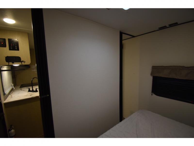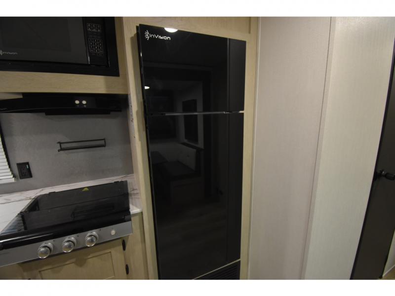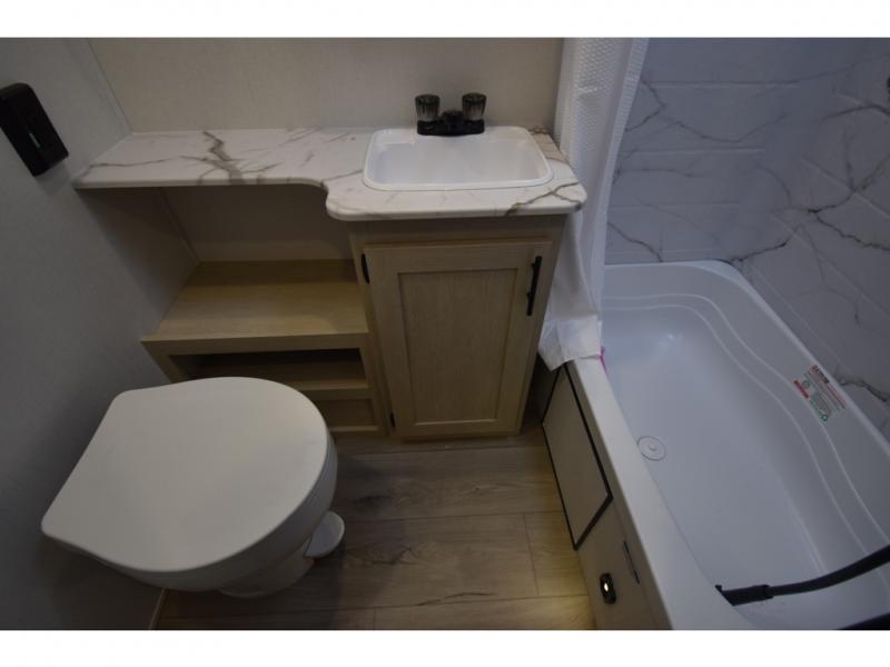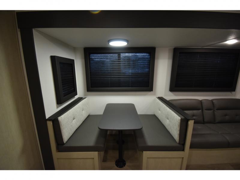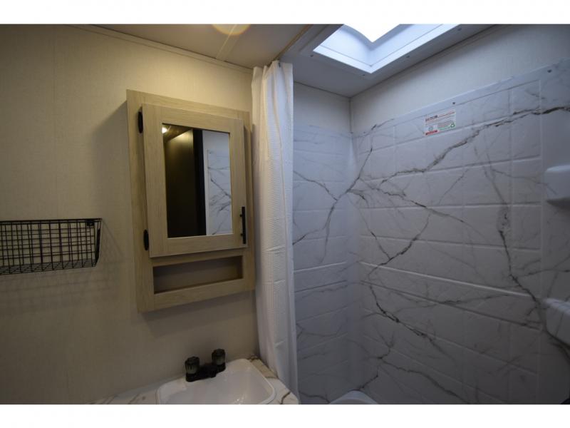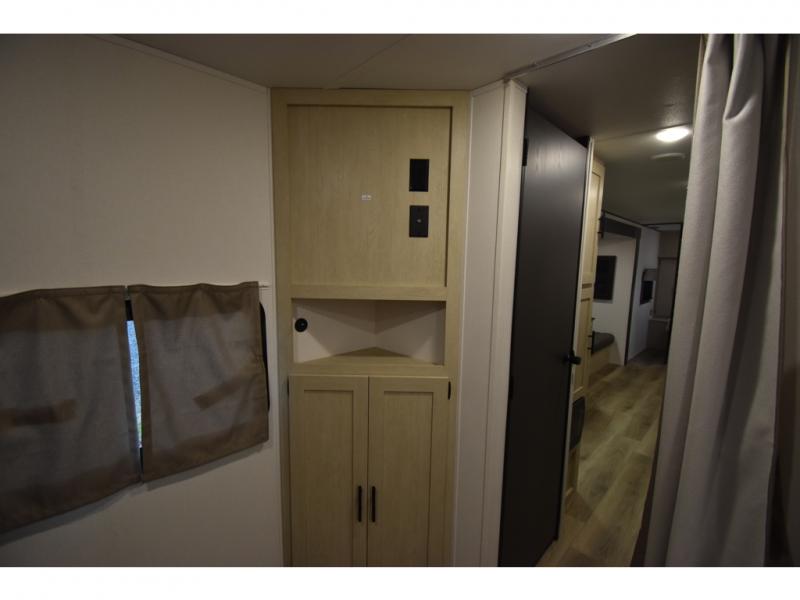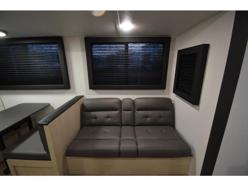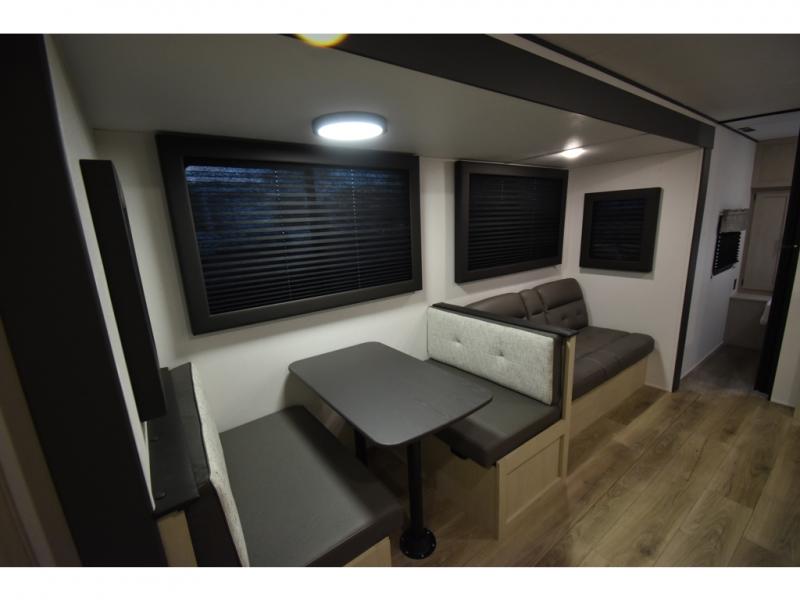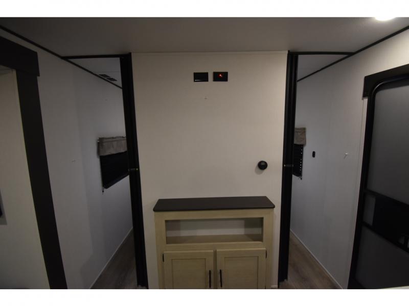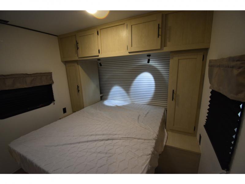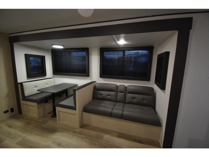 The little ones or your guests will love the bunkhouse in this spacious trailer. There area a set of 26" x 74" bunks, along with a flip-up bunk above a sofa they can sleep and relax. You'll find your own space in the front bedroom that includes a walk-around queen bed and dual wardrobes. Everyone can meet in the middle living area and kitchen to dine around the booth dinette or relax on the sofa. The chef will be able to create delicious meals each day on the three burner cooktop, and there is a residential style refrigerator for perishables. And the mid-coach full bath is sure to come in handy after a day of swimming or hiking!