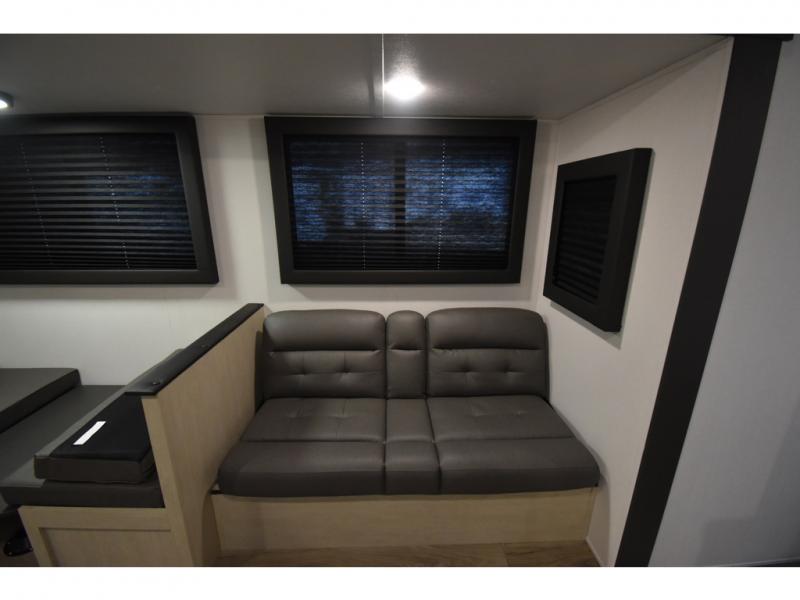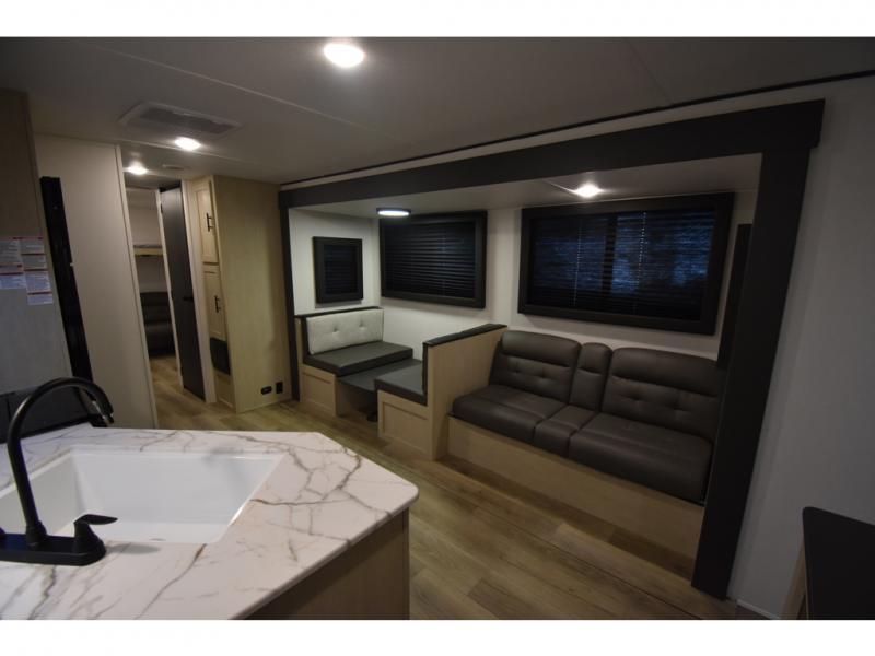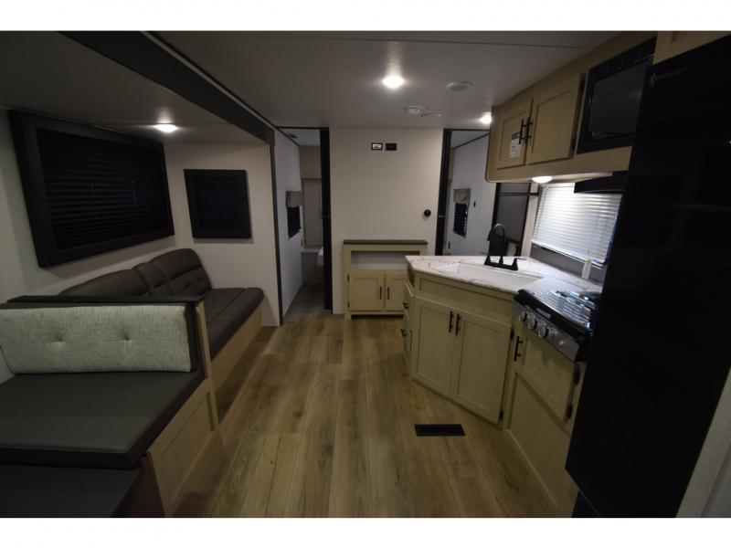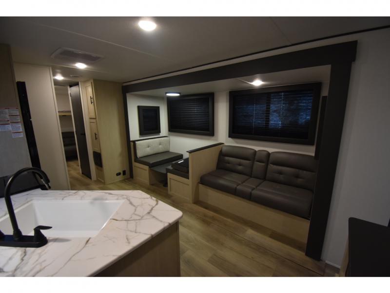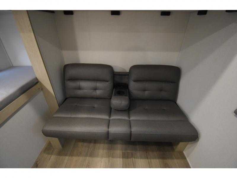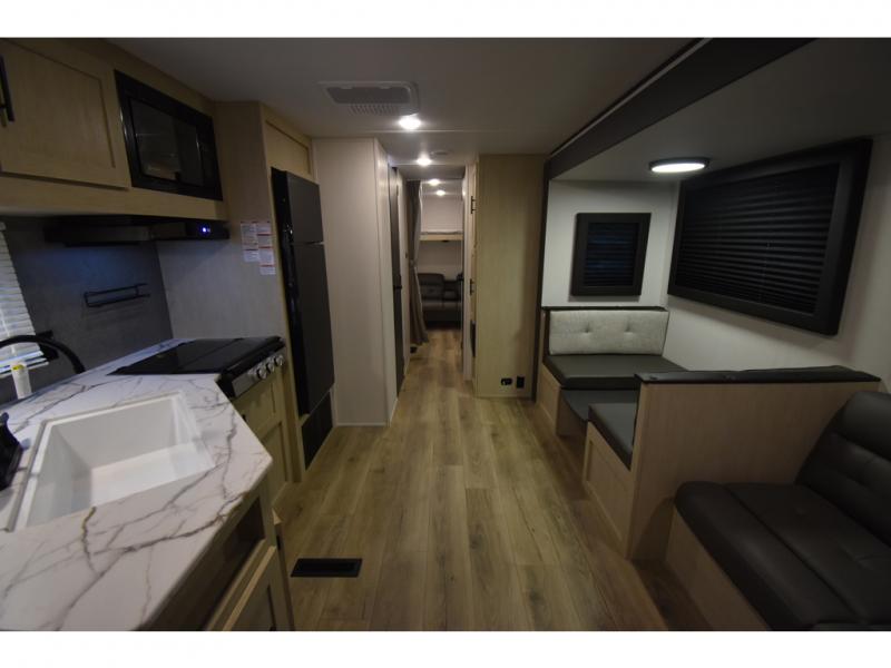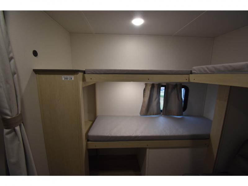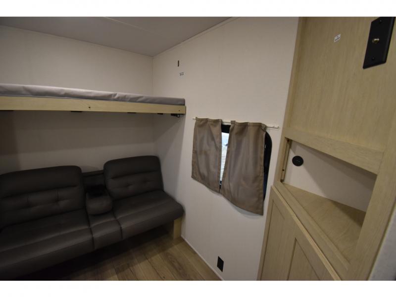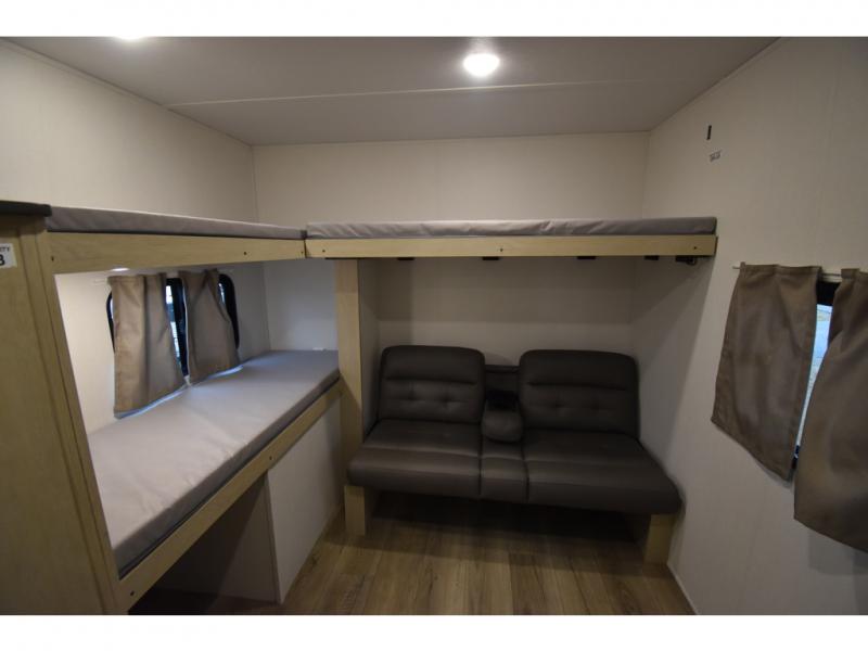 The little ones or your guests will love the bunkhouse in this spacious trailer. There area a set of 26" x 74" bunks, along with a flip-up bunk above a sofa they can sleep and relax. You'll find your own space in the front bedroom that includes a walk-around queen bed and dual wardrobes. Everyone can meet in the middle living area and kitchen to dine around the booth dinette or relax on the sofa. The chef will be able to create delicious meals each day on the three burner cooktop, and there is a residential style refrigerator for perishables. And the mid-coach full bath is sure to come in handy after a day of swimming or hiking!