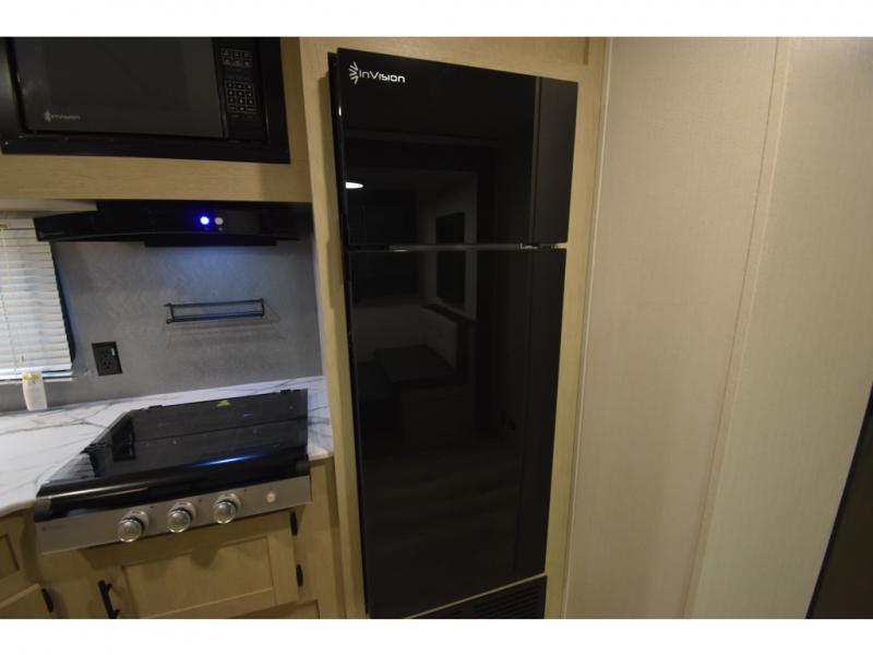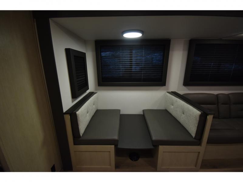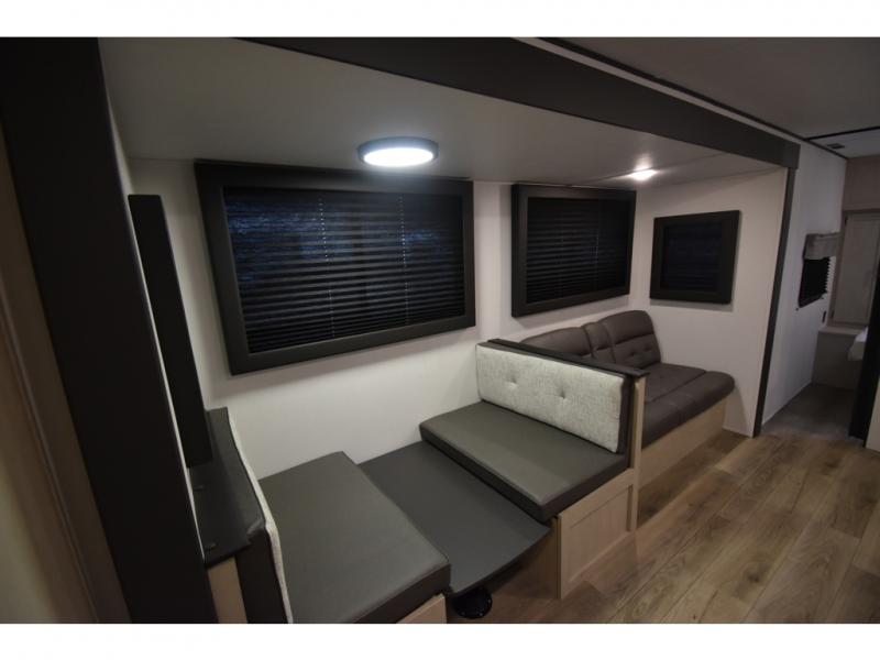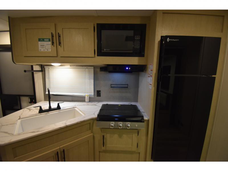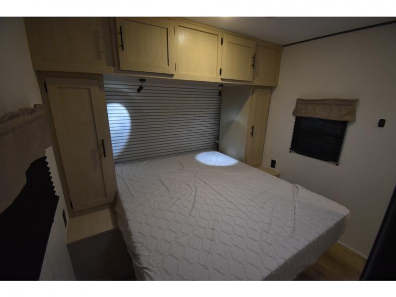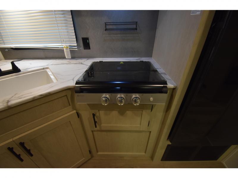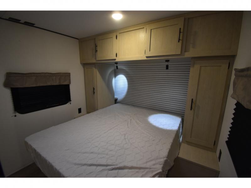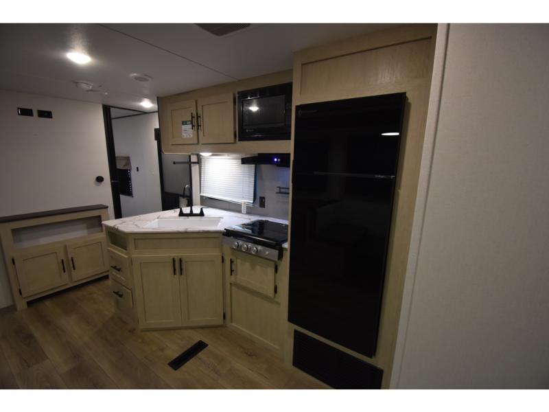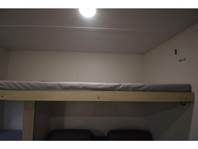 The little ones or your guests will love the bunkhouse in this spacious trailer. There area a set of 26" x 74" bunks, along with a flip-up bunk above a sofa they can sleep and relax. You'll find your own space in the front bedroom that includes a walk-around queen bed and dual wardrobes. Everyone can meet in the middle living area and kitchen to dine around the booth dinette or relax on the sofa. The chef will be able to create delicious meals each day on the three burner cooktop, and there is a residential style refrigerator for perishables. And the mid-coach full bath is sure to come in handy after a day of swimming or hiking!