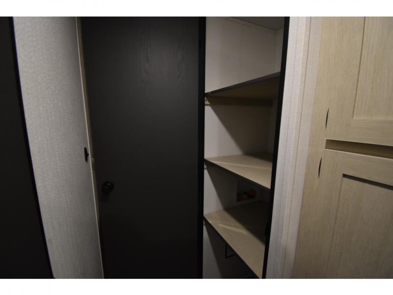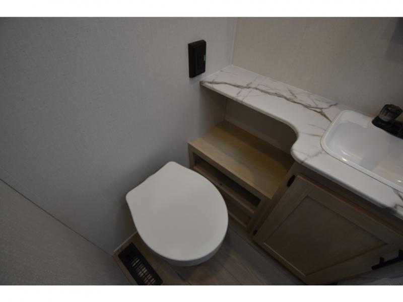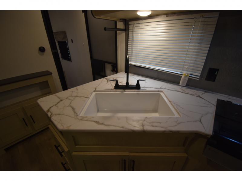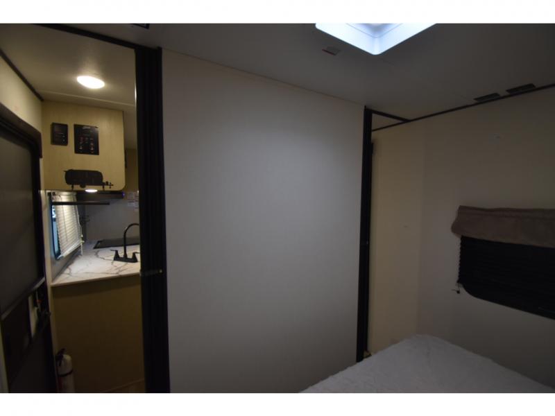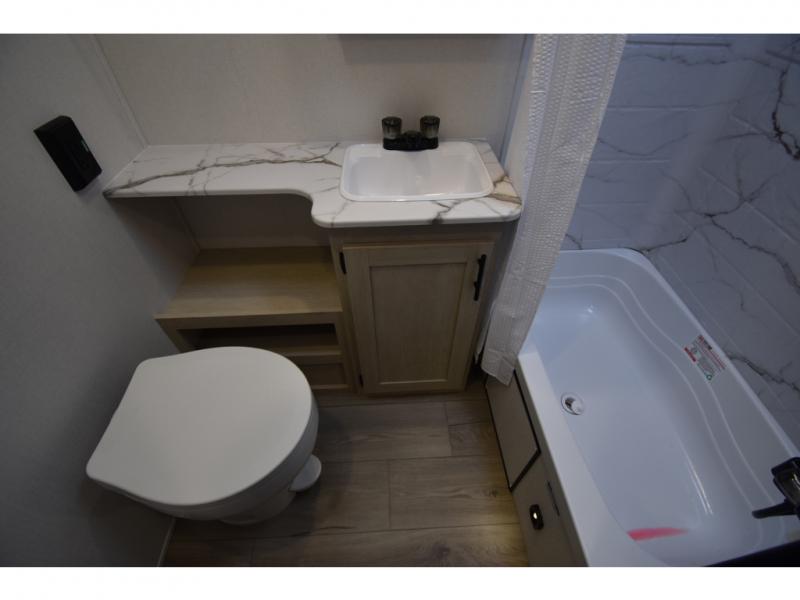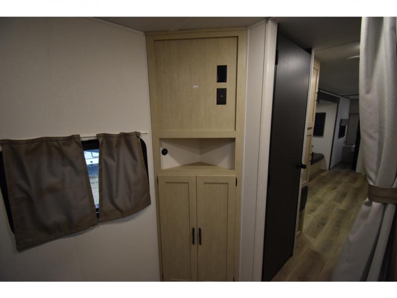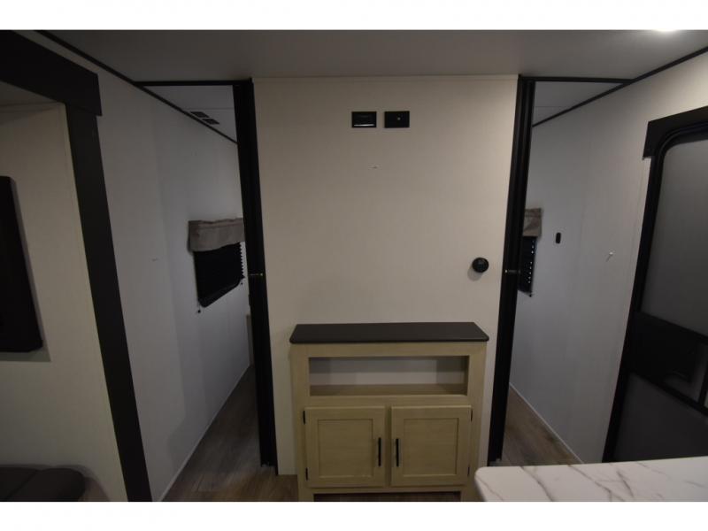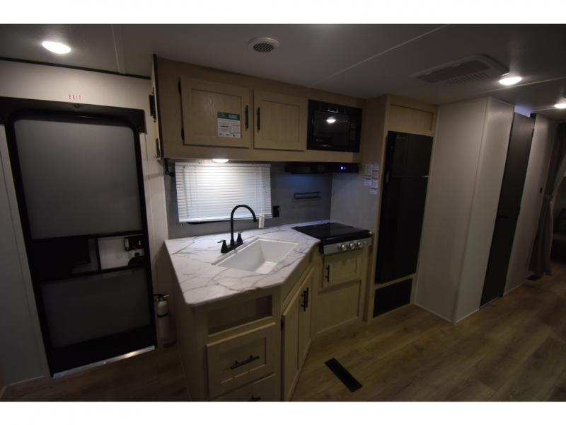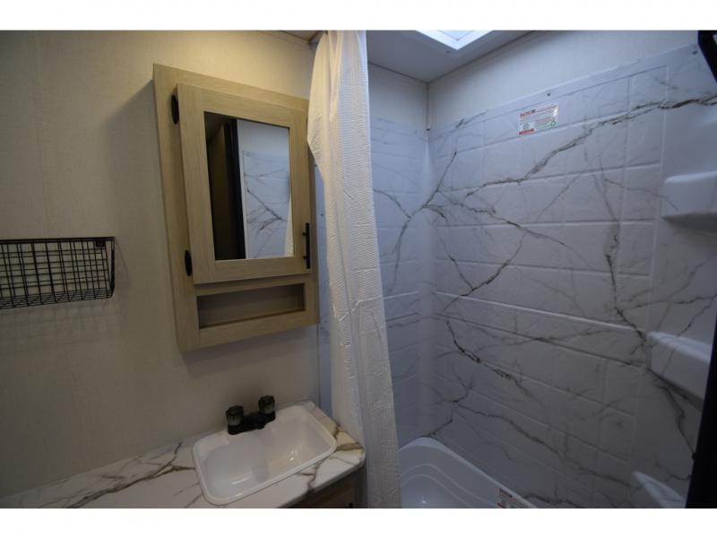 The little ones or your guests will love the bunkhouse in this spacious trailer. There area a set of 26" x 74" bunks, along with a flip-up bunk above a sofa they can sleep and relax. You'll find your own space in the front bedroom that includes a walk-around queen bed and dual wardrobes. Everyone can meet in the middle living area and kitchen to dine around the booth dinette or relax on the sofa. The chef will be able to create delicious meals each day on the three burner cooktop, and there is a residential style refrigerator for perishables. And the mid-coach full bath is sure to come in handy after a day of swimming or hiking!