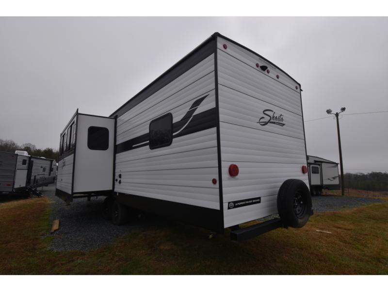 In any Shasta i-5 Edition travel trailer, you will find quality craftsmanship along with an affordable price tag. These units each feature brawn built sidewalls for sturdiness and an enclosed underbelly for added protection as you travel. The Base Camp Package provides each unit with black tank flush, a monitor panel for quick access to the functions of your unit, a 13.5K A/C unit, and a tankless water heater for added convenience. Inside, you'll find pocket-bored and screwed cabinets, skylights, a portable Bluetooth speaker, and more comforts!