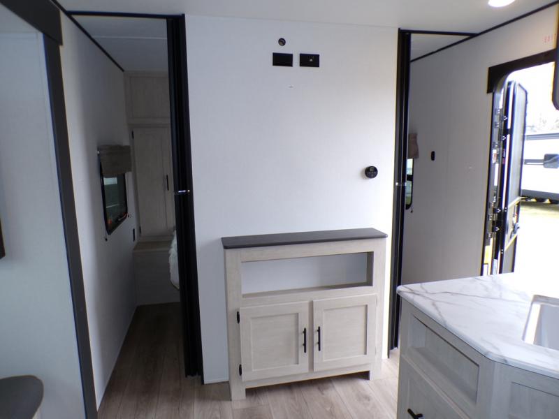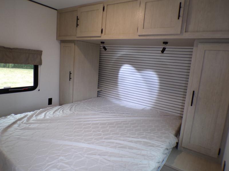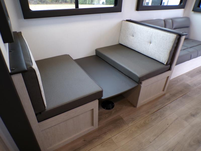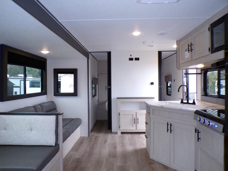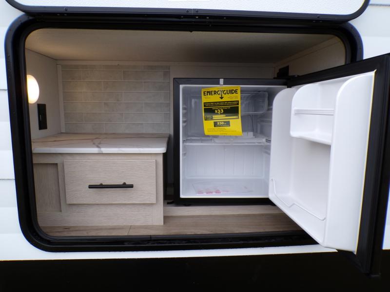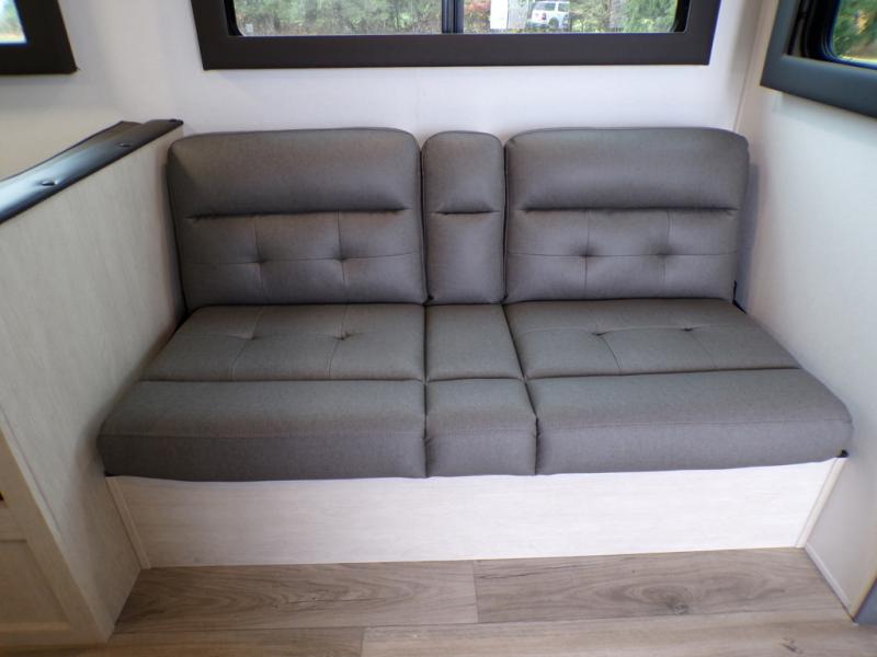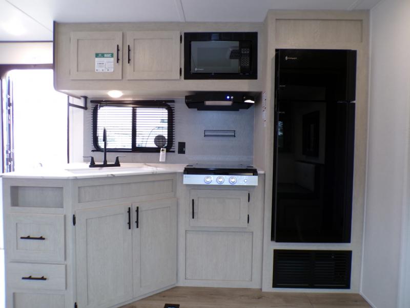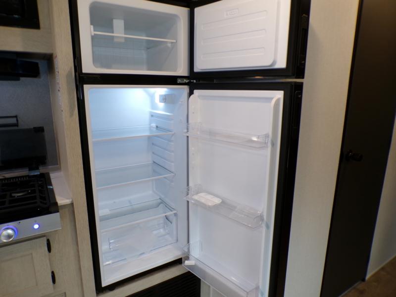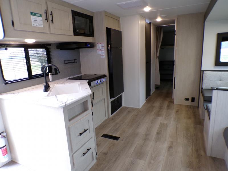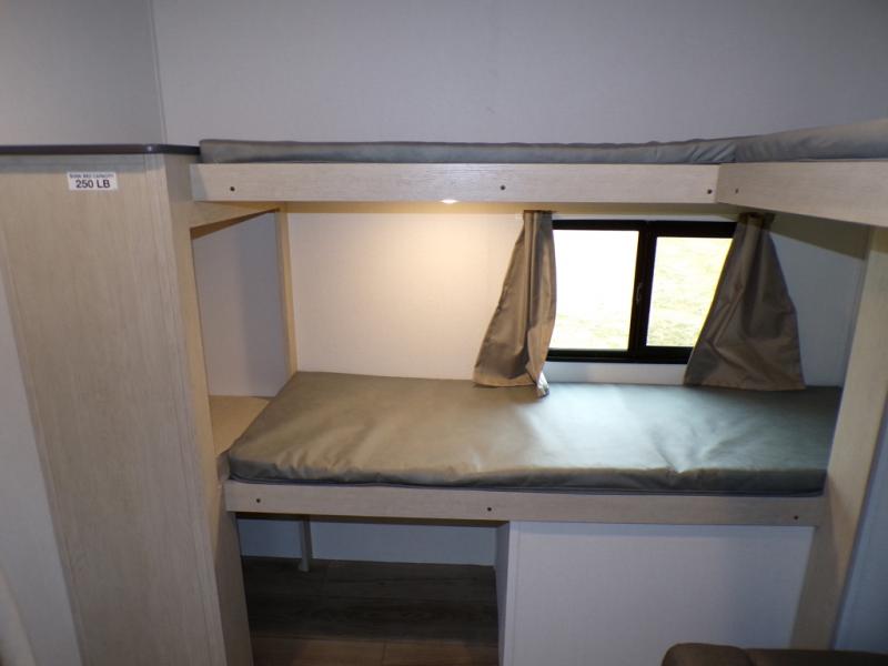 The little ones or your guests will love the bunkhouse in this spacious trailer. There area a set of 26" x 74" bunks, along with a flip-up bunk above a sofa they can sleep and relax. You'll find your own space in the front bedroom that includes a walk-around queen bed and dual wardrobes. Everyone can meet in the middle living area and kitchen to dine around the booth dinette or relax on the sofa. The chef will be able to create delicious meals each day on the three burner cooktop, and there is a residential style refrigerator for perishables. And the mid-coach full bath is sure to come in handy after a day of swimming or hiking!