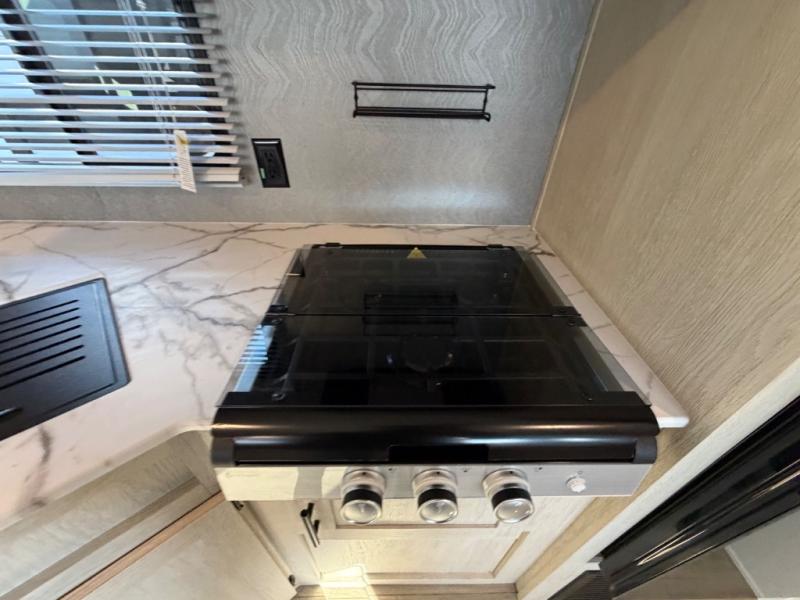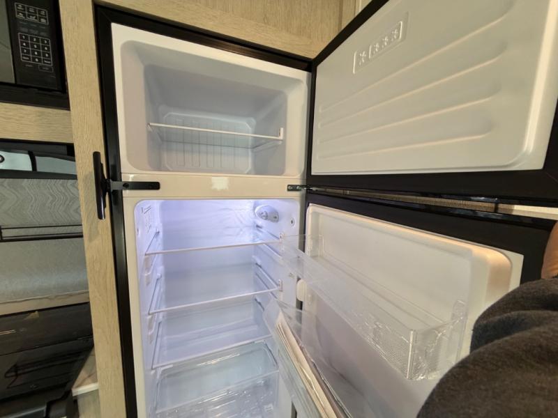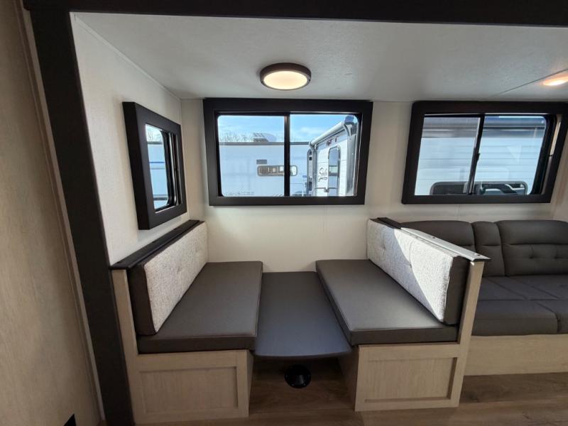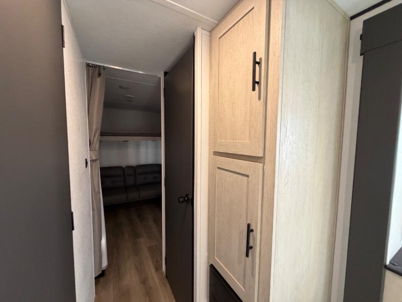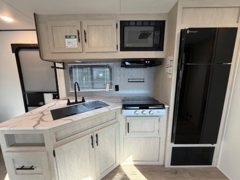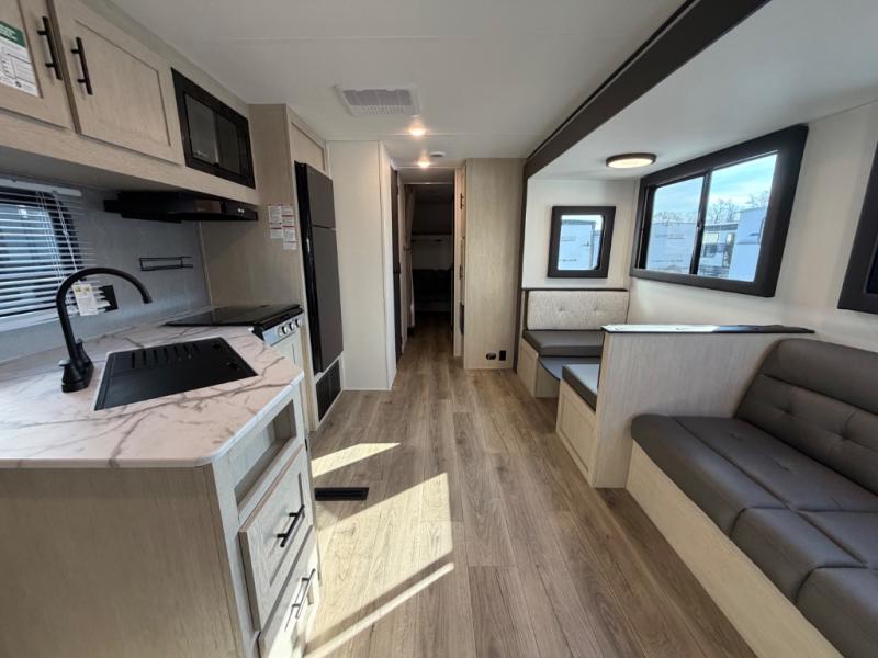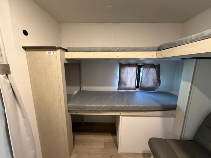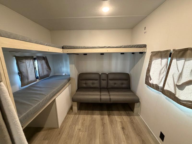 The little ones or your guests will love the bunkhouse in this spacious trailer. There are a set of 26" x 74" bunks, along with a flip-up bunk above a sofa they can sleep and relax. You'll find your own space in the front bedroom that includes a walk-around queen bed and dual wardrobes. Everyone can meet in the middle living area and kitchen to dine around the booth dinette or relax on the sofa. The chef will be able to create delicious meals each day on the three-burner cooktop, and there is a refrigerator for perishables. And the mid-coach full bath is sure to come in handy after a day of swimming or hiking!