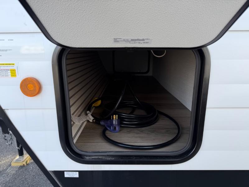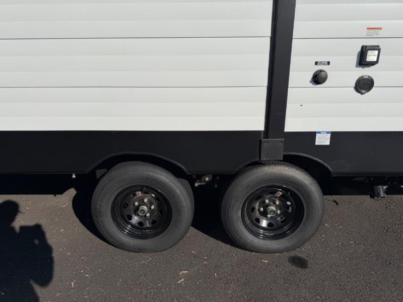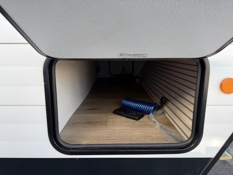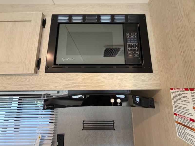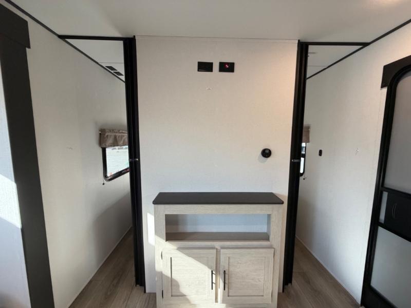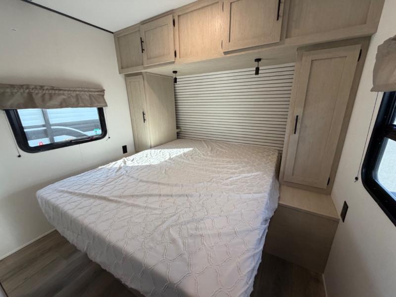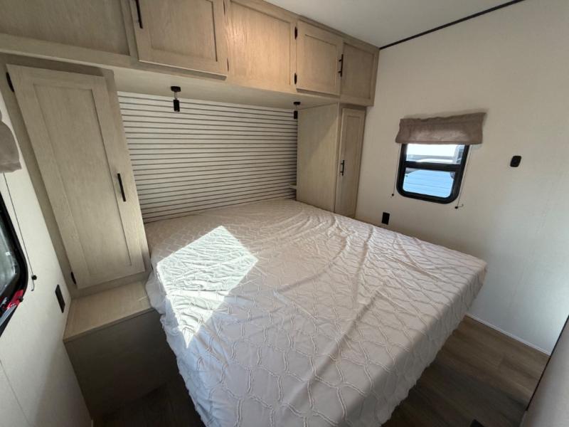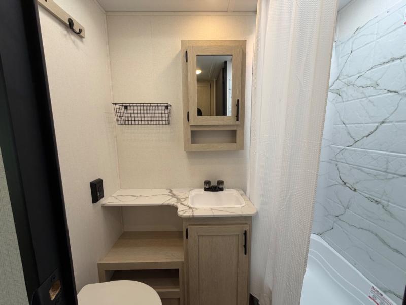 The little ones or your guests will love the bunkhouse in this spacious trailer. There are a set of 26" x 74" bunks, along with a flip-up bunk above a sofa they can sleep and relax. You'll find your own space in the front bedroom that includes a walk-around queen bed and dual wardrobes. Everyone can meet in the middle living area and kitchen to dine around the booth dinette or relax on the sofa. The chef will be able to create delicious meals each day on the three-burner cooktop, and there is a refrigerator for perishables. And the mid-coach full bath is sure to come in handy after a day of swimming or hiking!