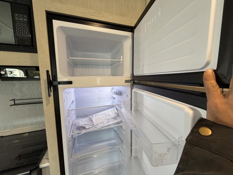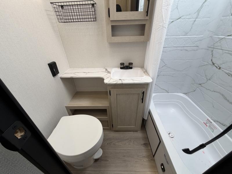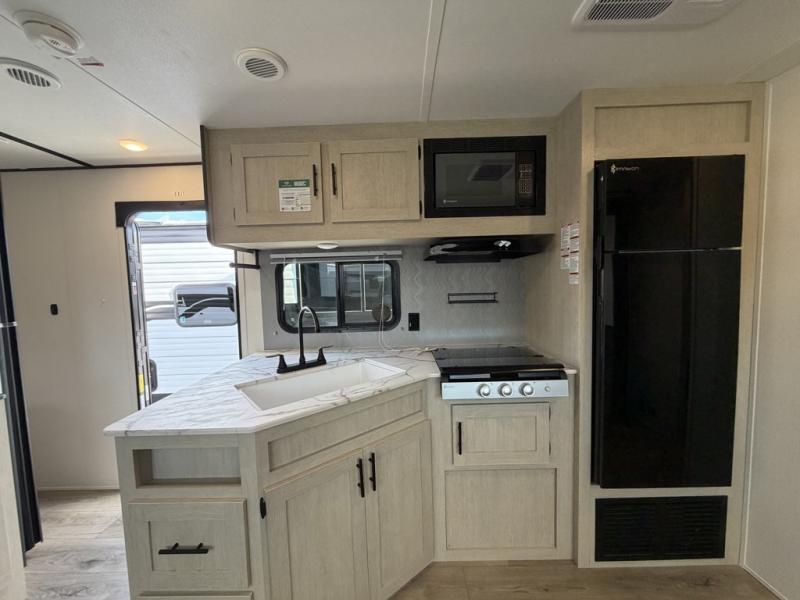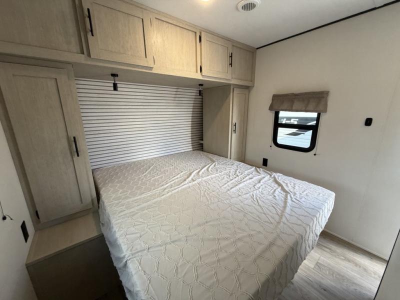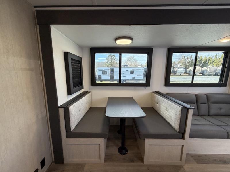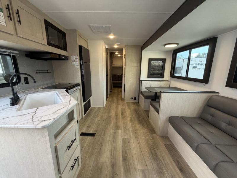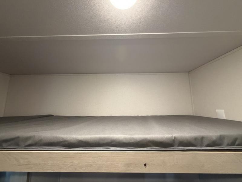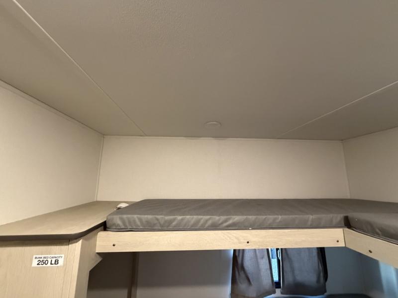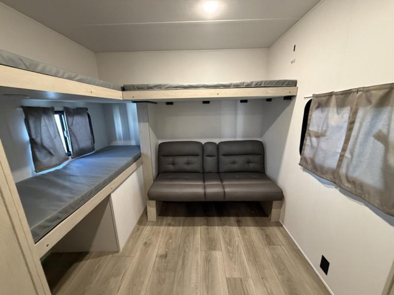 The little ones or your guests will love the bunkhouse in this spacious trailer. There area a set of 26" x 74" bunks, along with a flip-up bunk above a sofa they can sleep and relax. You'll find your own space in the front bedroom that includes a walk-around queen bed and dual wardrobes. Everyone can meet in the middle living area and kitchen to dine around the booth dinette or relax on the sofa. The chef will be able to create delicious meals each day on the three burner cooktop, and there is a residential style refrigerator for perishables. And the mid-coach full bath is sure to come in handy after a day of swimming or hiking!