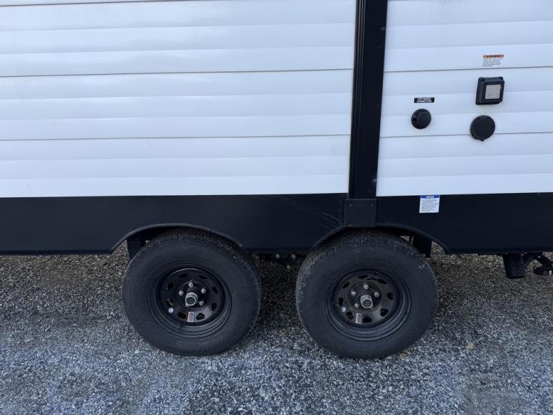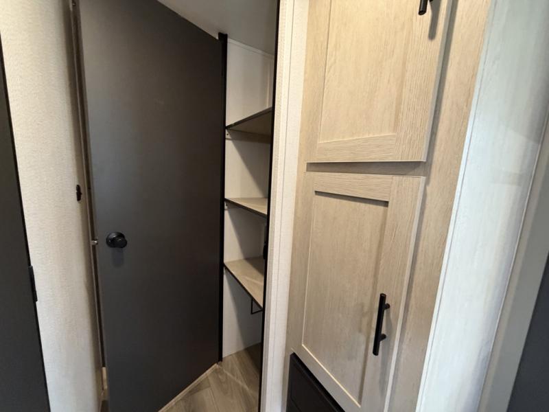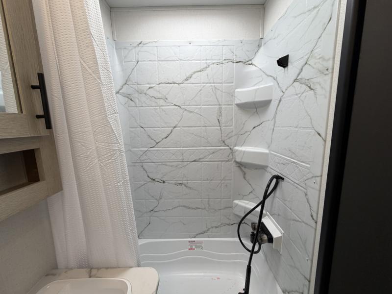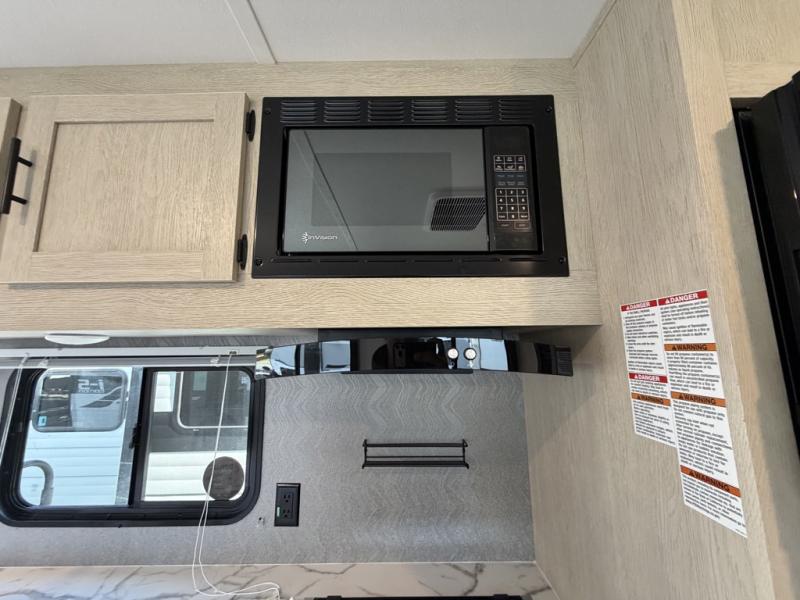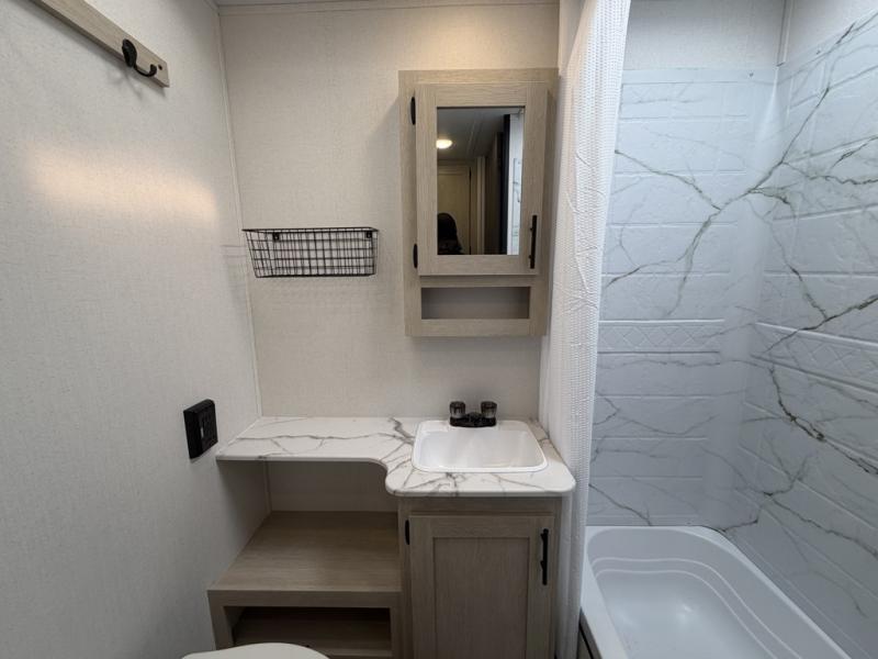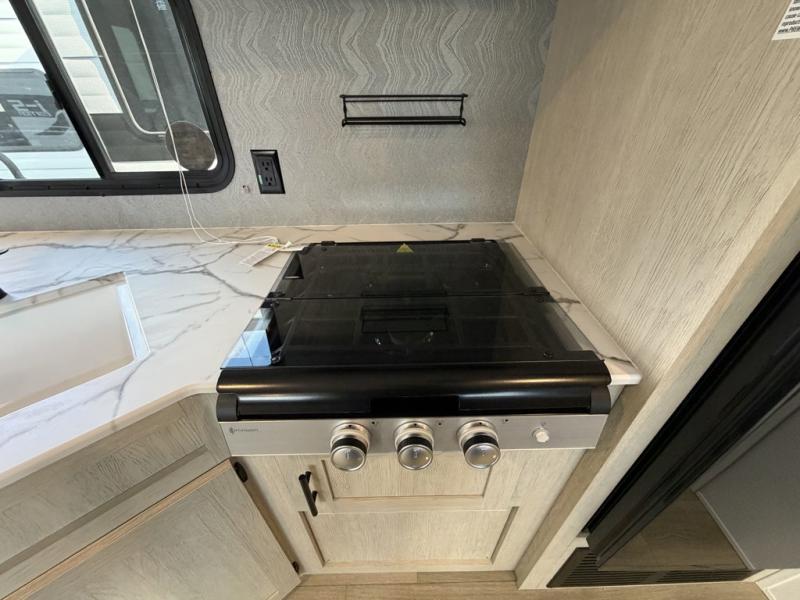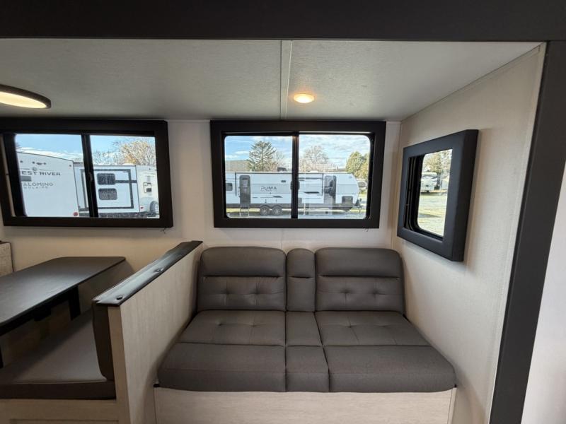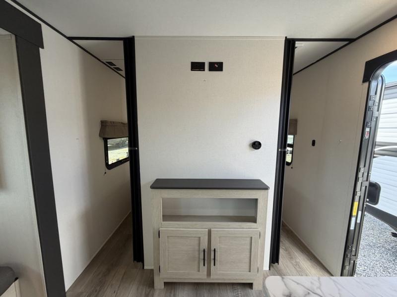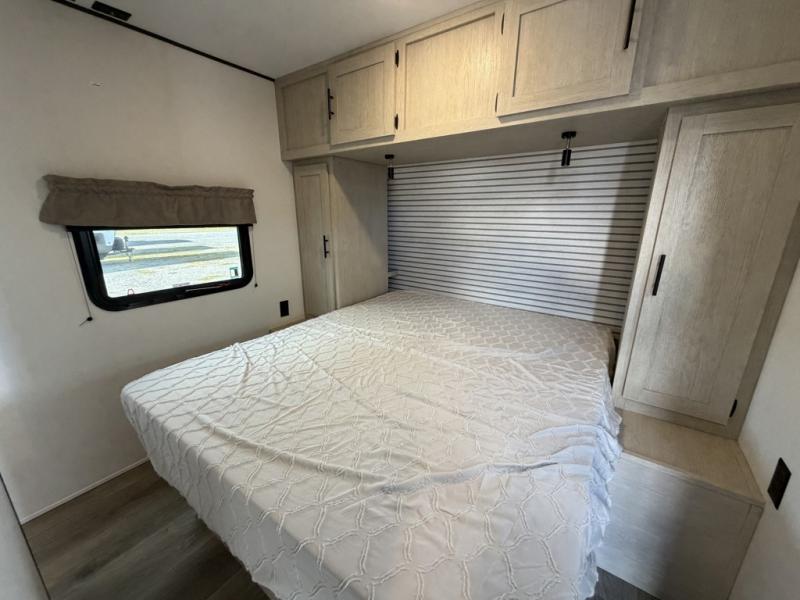 The little ones or your guests will love the bunkhouse in this spacious trailer. There area a set of 26" x 74" bunks, along with a flip-up bunk above a sofa they can sleep and relax. You'll find your own space in the front bedroom that includes a walk-around queen bed and dual wardrobes. Everyone can meet in the middle living area and kitchen to dine around the booth dinette or relax on the sofa. The chef will be able to create delicious meals each day on the three burner cooktop, and there is a residential style refrigerator for perishables. And the mid-coach full bath is sure to come in handy after a day of swimming or hiking!