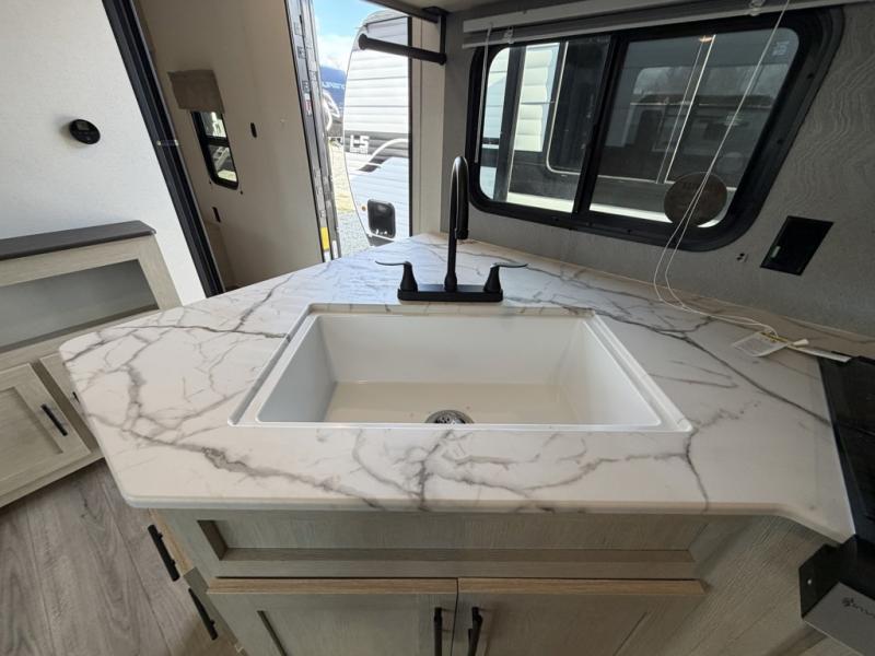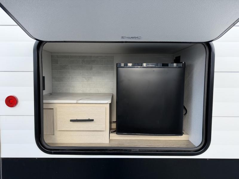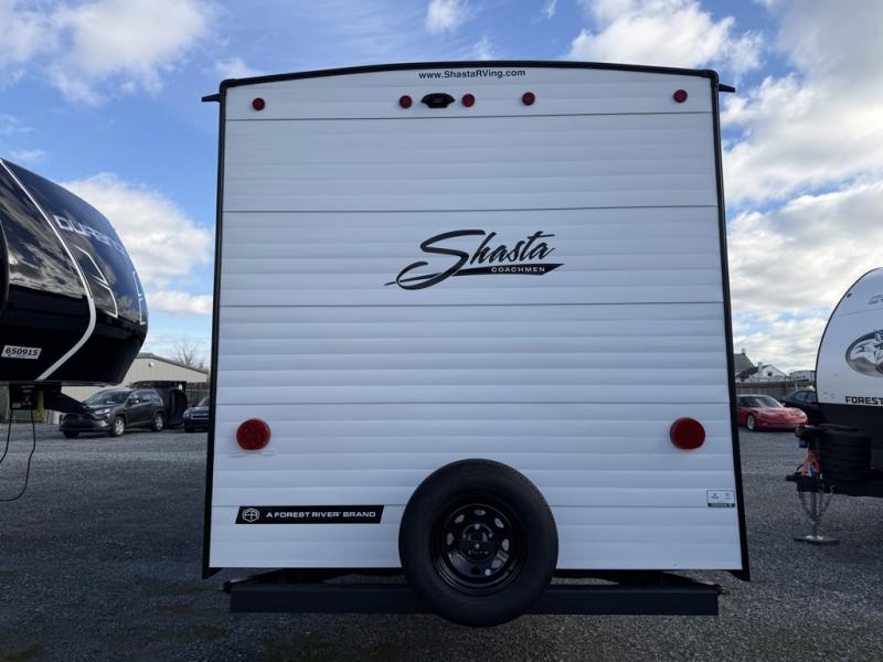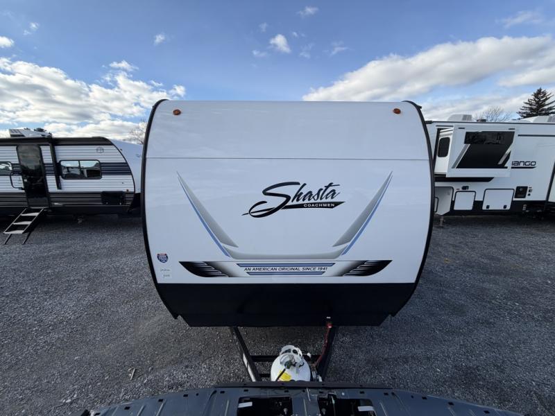 In any Shasta i-5 Edition travel trailer, you will find quality craftsmanship along with an affordable price tag. These units each feature brawn built sidewalls for sturdiness and an enclosed underbelly for added protection as you travel. The Base Camp Package provides each unit with black tank flush, a monitor panel for quick access to the functions of your unit, a 13.5K A/C unit, and a tankless water heater for added convenience. Inside, you'll find pocket-bored and screwed cabinets, skylights, a portable Bluetooth speaker, and more comforts!