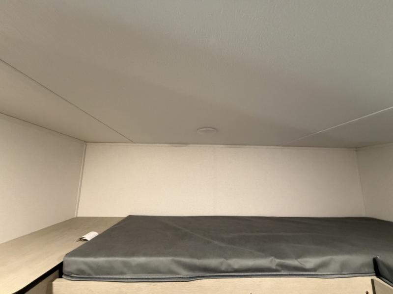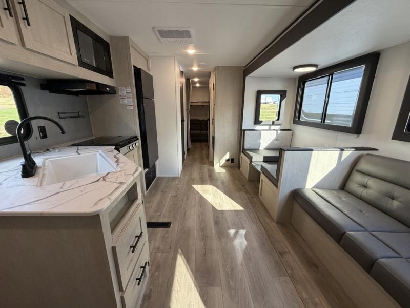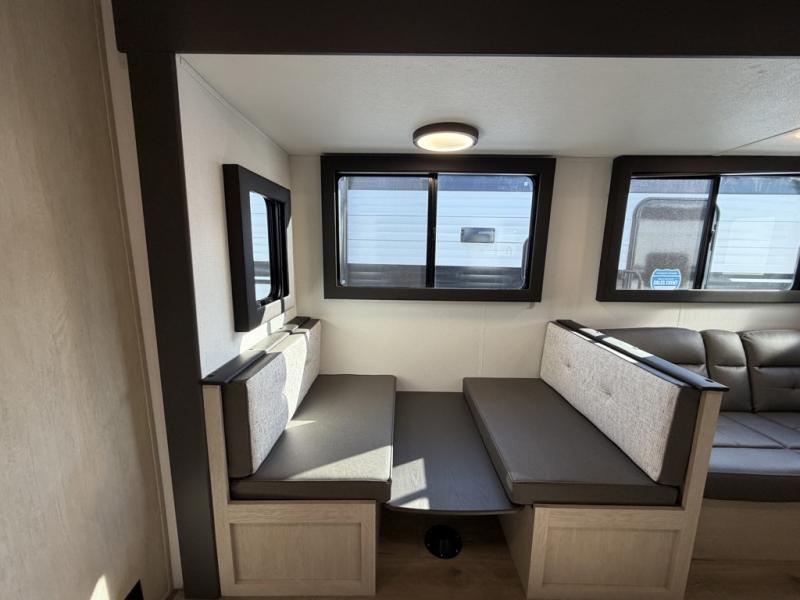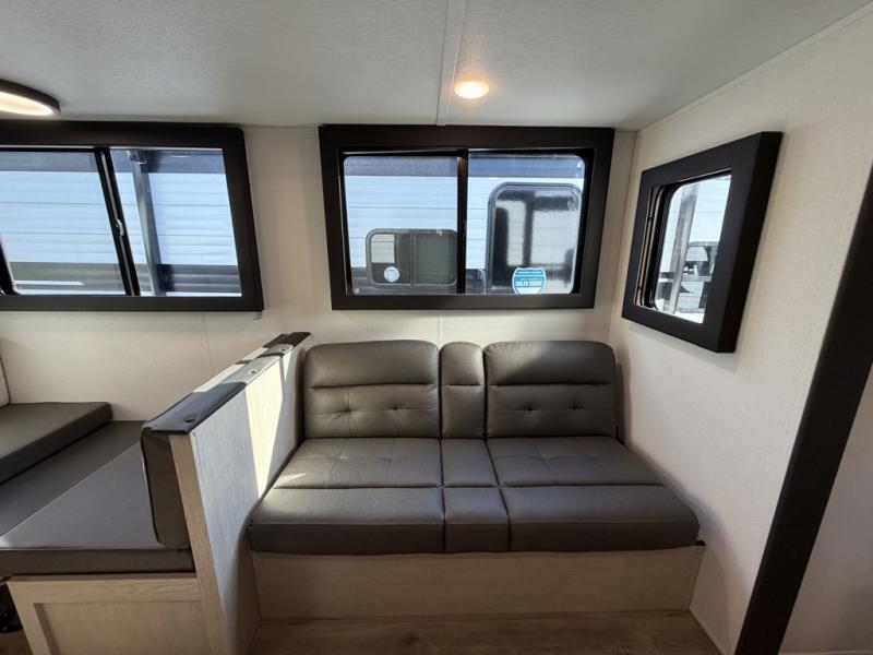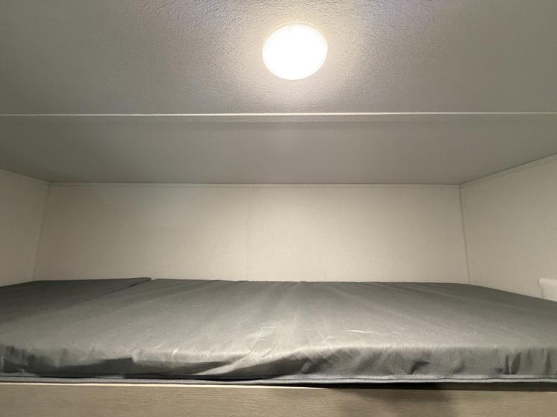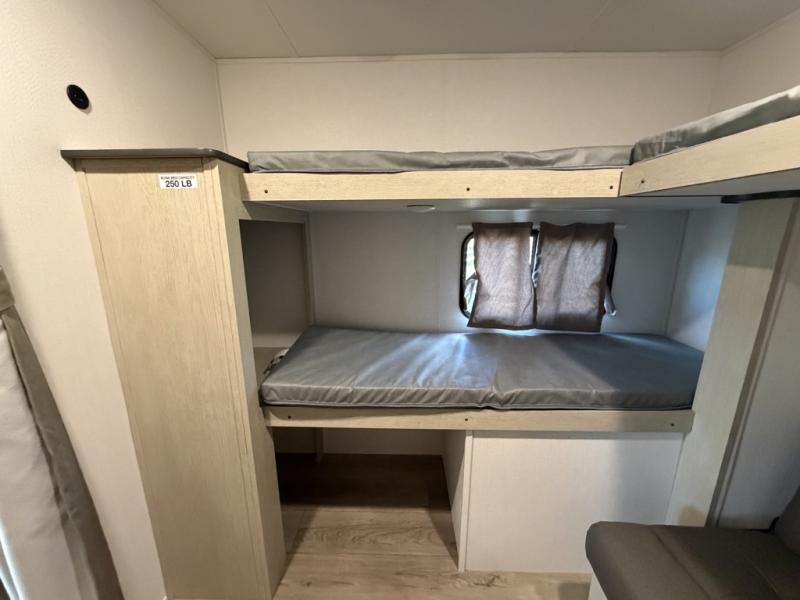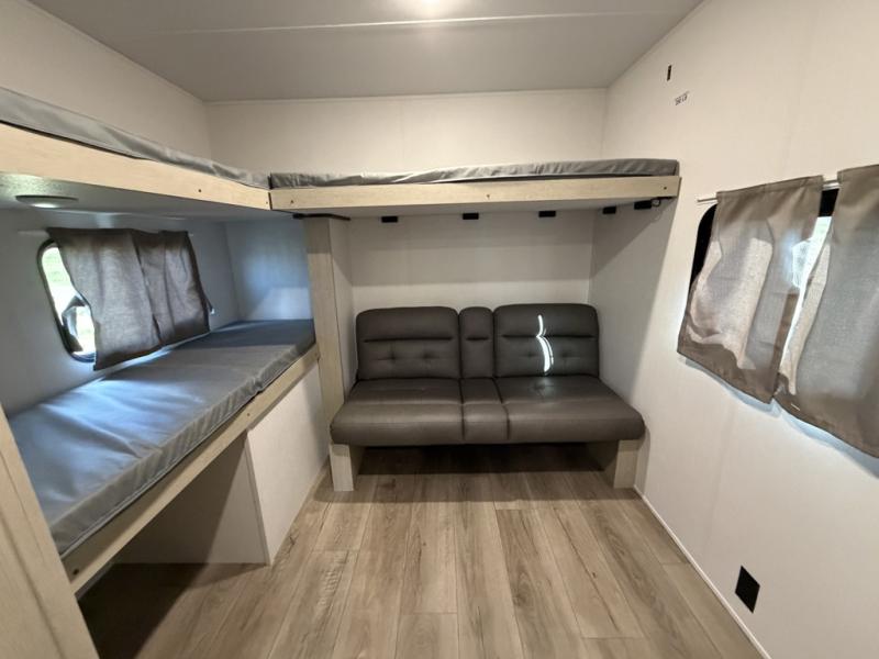 The little ones or your guests will love the bunkhouse in this spacious trailer. There are a set of 26" x 74" bunks, along with a flip-up bunk above a sofa they can sleep and relax. You'll find your own space in the front bedroom that includes a walk-around queen bed and dual wardrobes. Everyone can meet in the middle living area and kitchen to dine around the booth dinette or relax on the sofa. The chef will be able to create delicious meals each day on the three-burner cooktop, and there is a refrigerator for perishables. And the mid-coach full bath is sure to come in handy after a day of swimming or hiking!