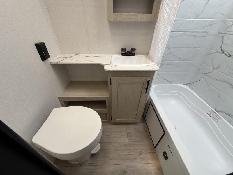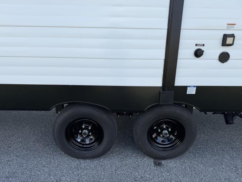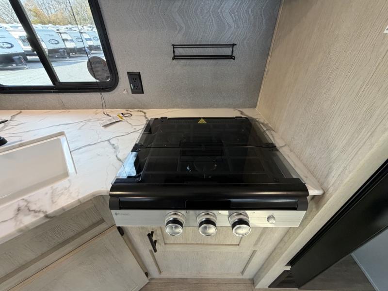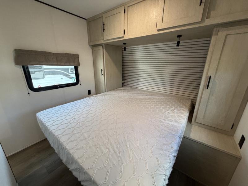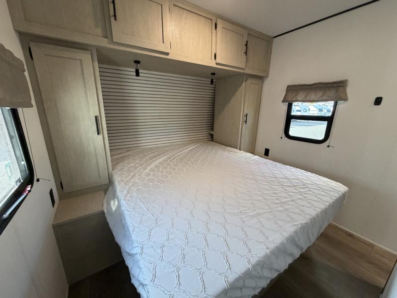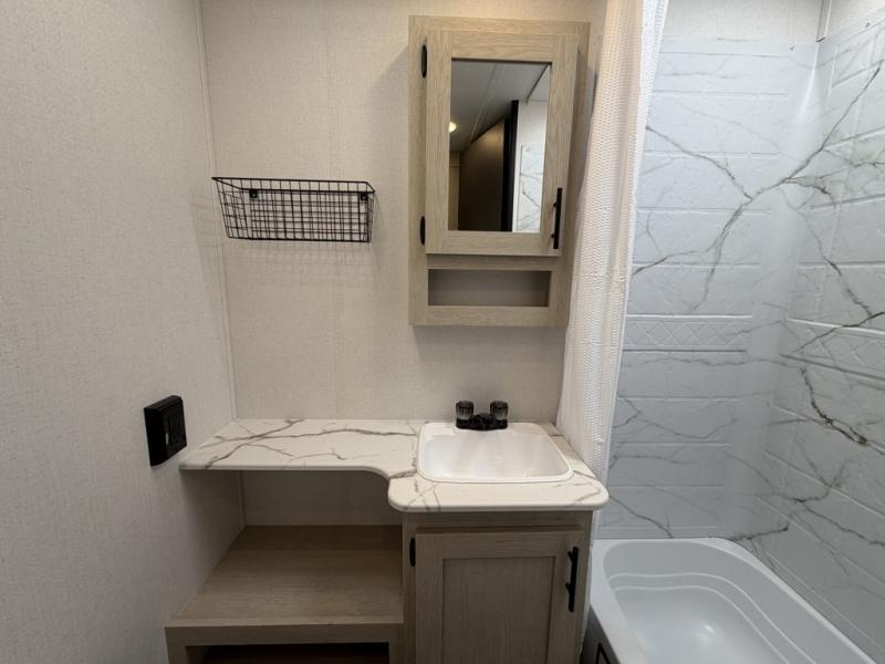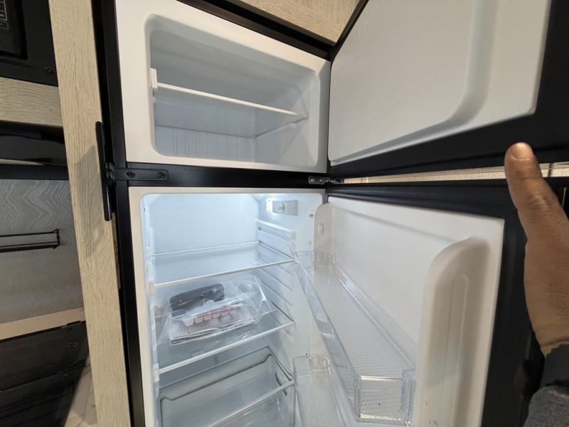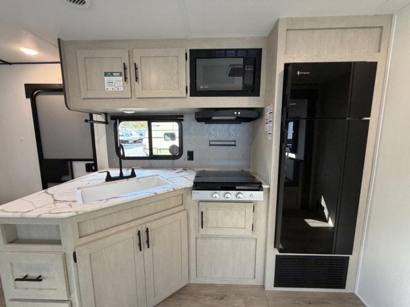 The little ones or your guests will love the bunkhouse in this spacious trailer. There are a set of 26" x 74" bunks, along with a flip-up bunk above a sofa they can sleep and relax. You'll find your own space in the front bedroom that includes a walk-around queen bed and dual wardrobes. Everyone can meet in the middle living area and kitchen to dine around the booth dinette or relax on the sofa. The chef will be able to create delicious meals each day on the three-burner cooktop, and there is a refrigerator for perishables. And the mid-coach full bath is sure to come in handy after a day of swimming or hiking!
