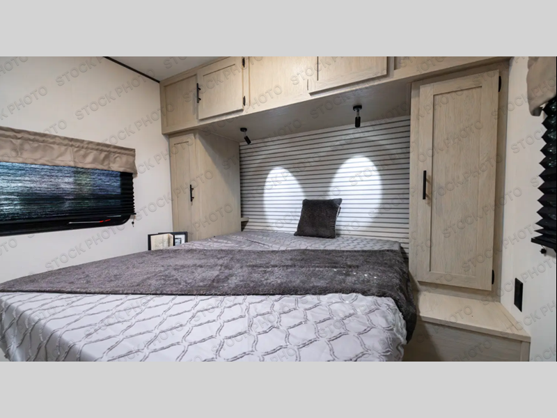 The little ones or your guests will love the bunkhouse in this spacious trailer. There are a set of 26" x 74" bunks, along with a flip-up bunk above a sofa they can sleep and relax. You'll find your own space in the front bedroom that includes a walk-around queen bed and dual wardrobes. Everyone can meet in the middle living area and kitchen to dine around the booth dinette or relax on the sofa. The chef will be able to create delicious meals each day on the three-burner cooktop, and there is a refrigerator for perishables. And the mid-coach full bath is sure to come in handy after a day of swimming or hiking!