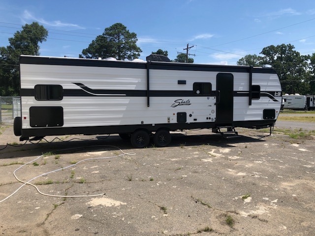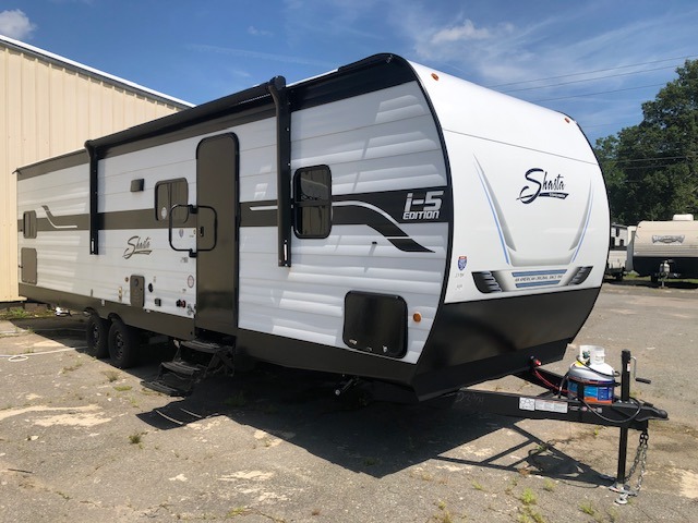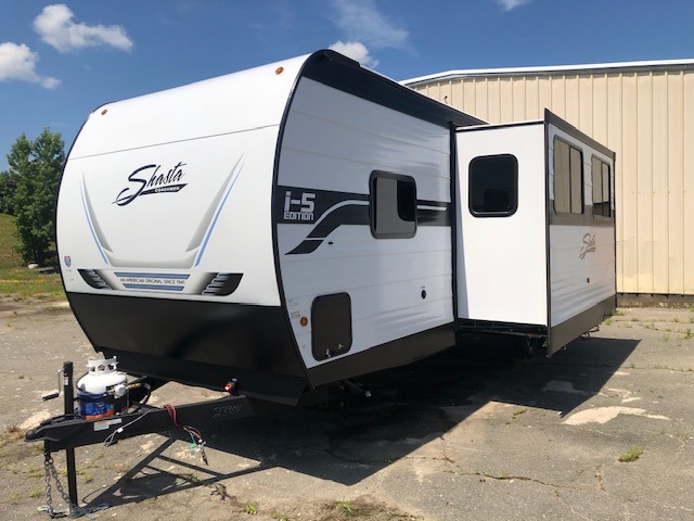 In any Shasta i-5 Edition travel trailer, you will find quality craftsmanship along with an affordable price tag. These units each feature four stabilizer jacks to make setting up easier and an enclosed underbelly for added protection as you travel. The Base Camp Package provides each unit with black tank flush, a monitor panel for quick access to the functions of your unit, a 13.5K A/C unit, and a tankless water heater for added convenience. Inside, you'll find seamless countertops, sink covers, a portable Bluetooth speaker, and more comforts!