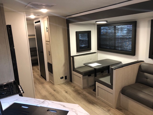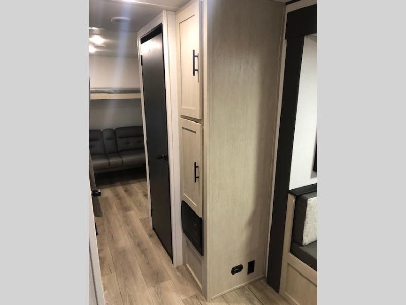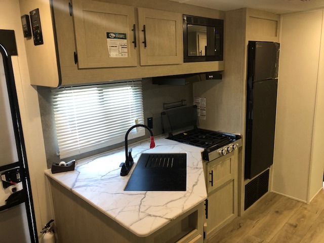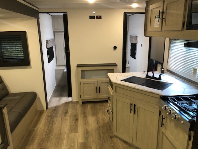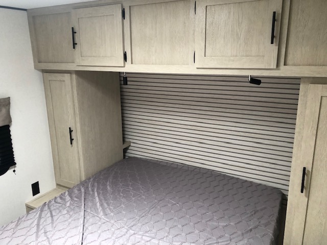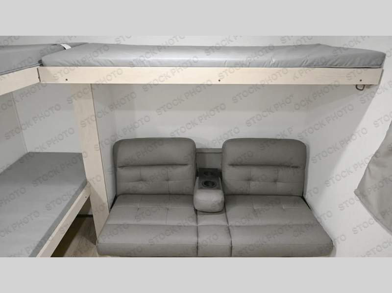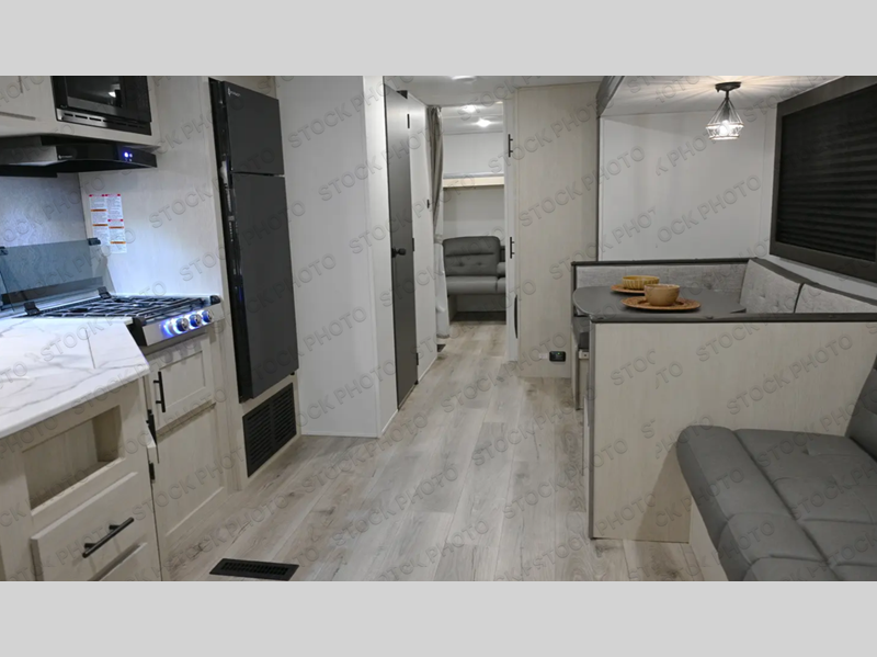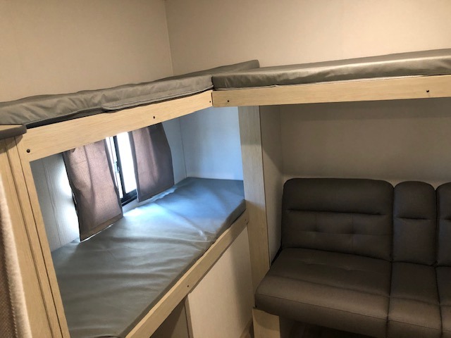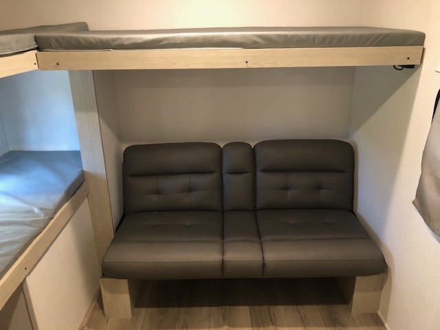 The little ones or your guests will love the bunkhouse in this spacious trailer. There area a set of 26" x 74" bunks, along with a flip-up bunk above a sofa they can sleep and relax. You'll find your own space in the front bedroom that includes a walk-around queen bed and dual wardrobes. Everyone can meet in the middle living area and kitchen to dine around the booth dinette or relax on the sofa. The chef will be able to create delicious meals each day on the three burner cooktop, and there is a residential style refrigerator for perishables. And the mid-coach full bath is sure to come in handy after a day of swimming or hiking!
