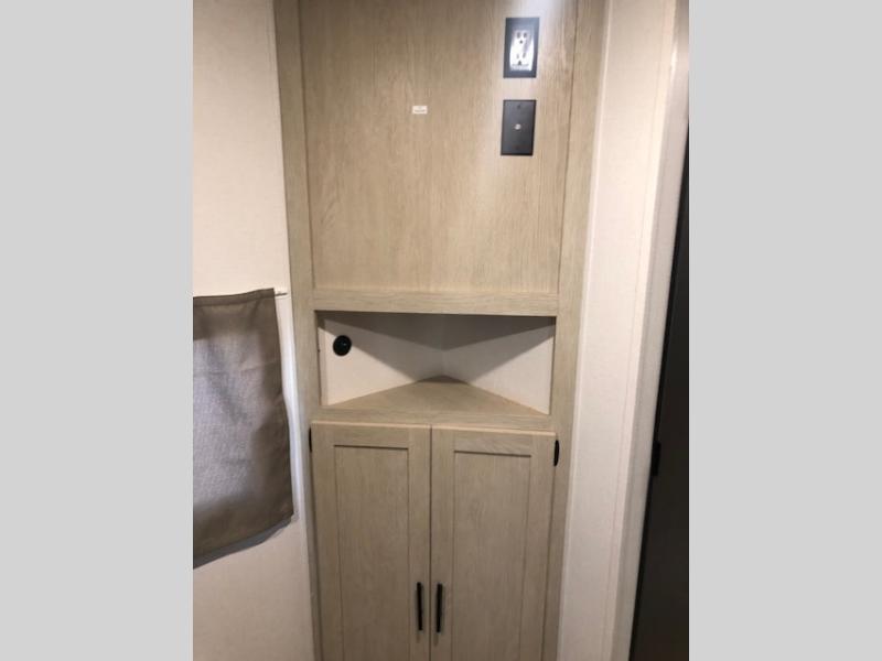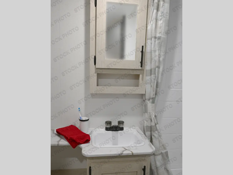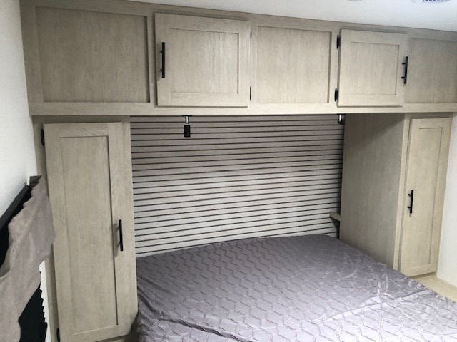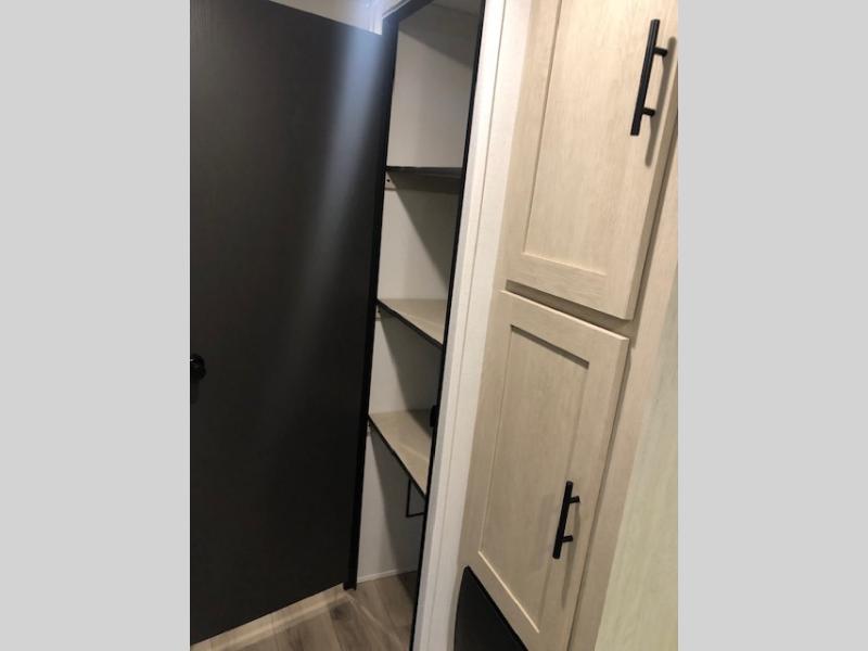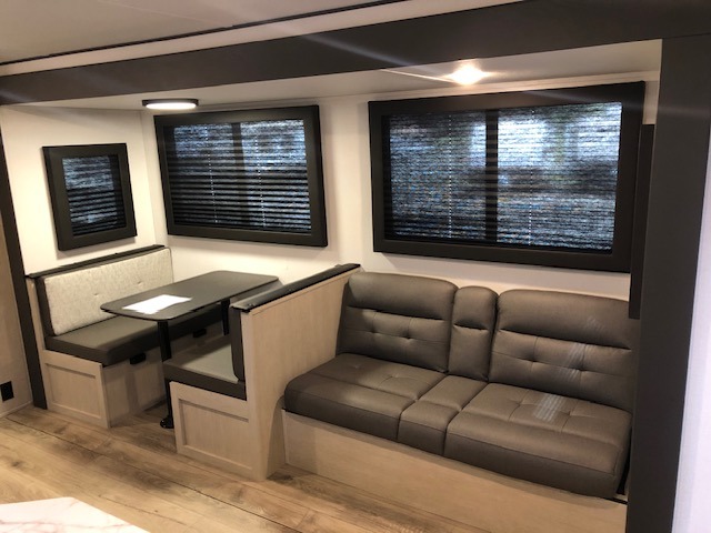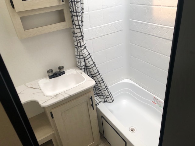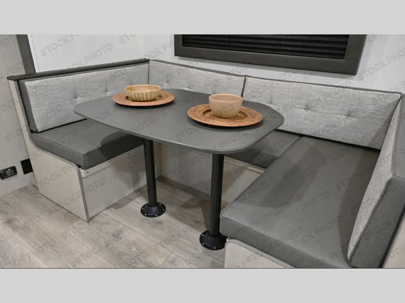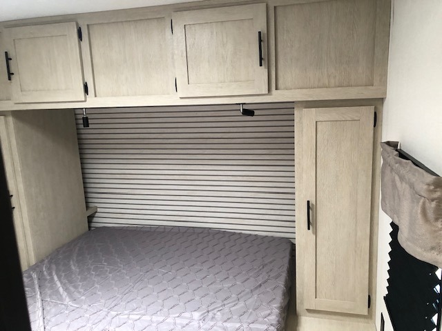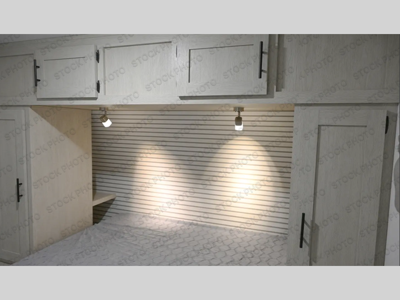 The little ones or your guests will love the bunkhouse in this spacious trailer. There area a set of 26" x 74" bunks, along with a flip-up bunk above a sofa they can sleep and relax. You'll find your own space in the front bedroom that includes a walk-around queen bed and dual wardrobes. Everyone can meet in the middle living area and kitchen to dine around the booth dinette or relax on the sofa. The chef will be able to create delicious meals each day on the three burner cooktop, and there is a residential style refrigerator for perishables. And the mid-coach full bath is sure to come in handy after a day of swimming or hiking!
