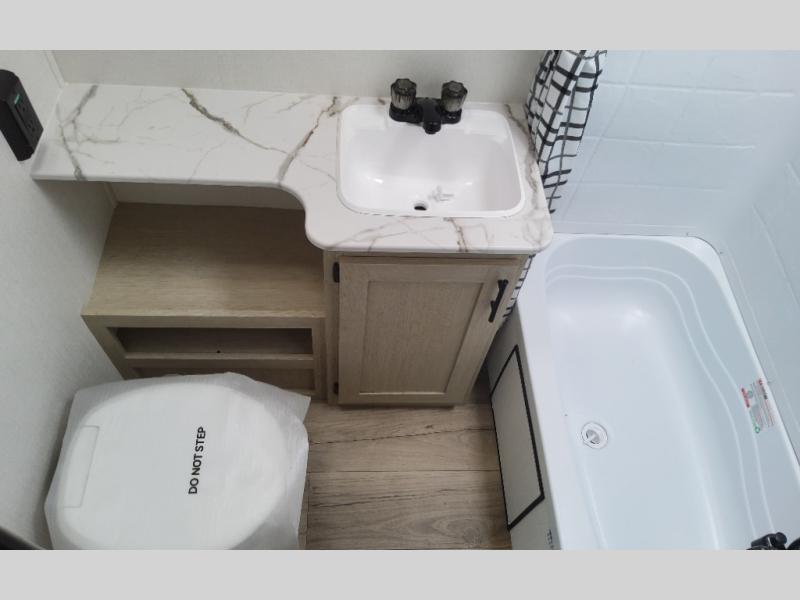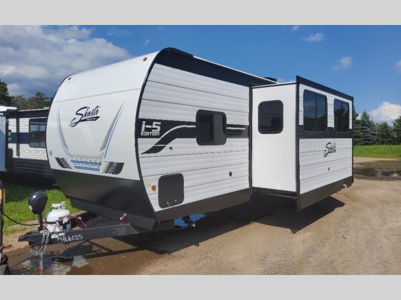 In any Shasta i-5 Edition travel trailer, you will find quality craftsmanship along with an affordable price tag. These units each feature four stabilizer jacks to make setting up easier and an enclosed underbelly for added protection as you travel. The Base Camp Package provides each unit with black tank flush, a monitor panel for quick access to the functions of your unit, a 13.5K A/C unit, and a tankless water heater for added convenience. Inside, you'll find seamless countertops, sink covers, a portable Bluetooth speaker, and more comforts!
