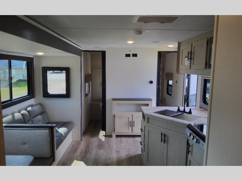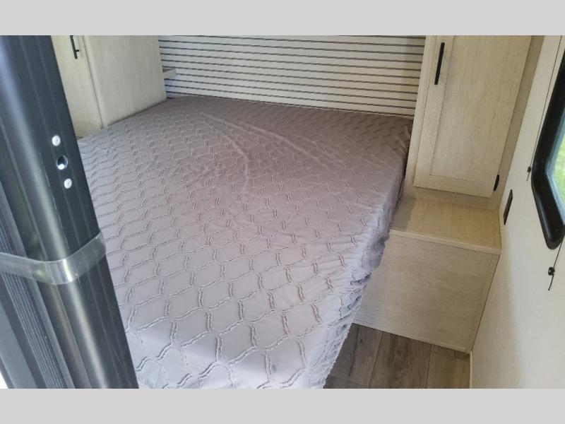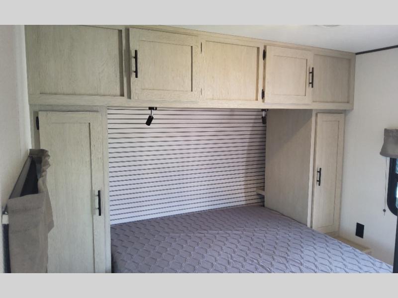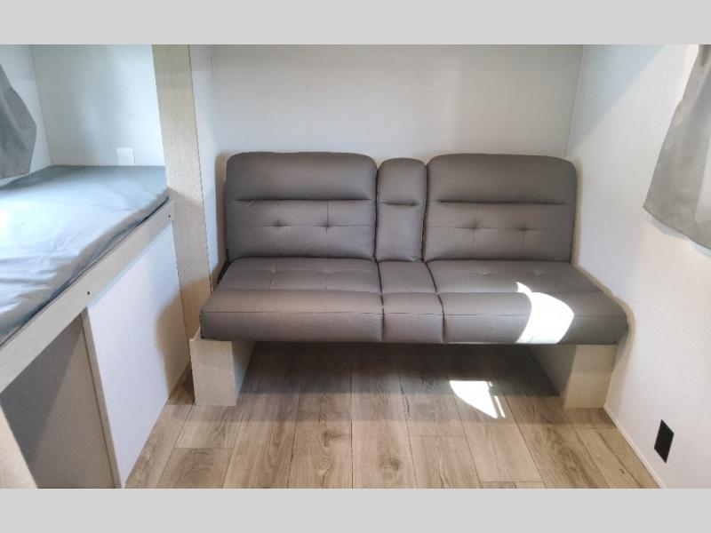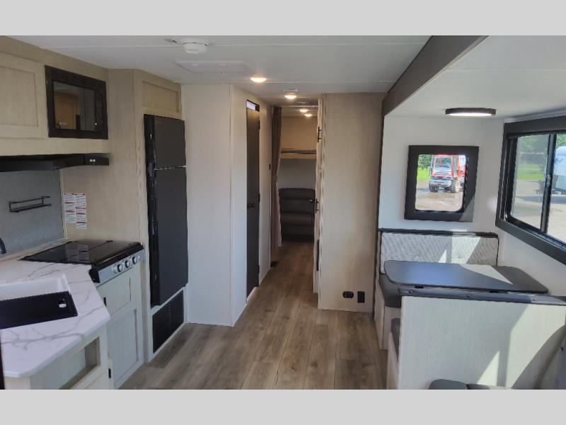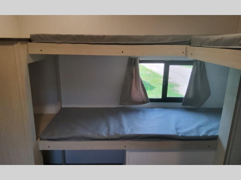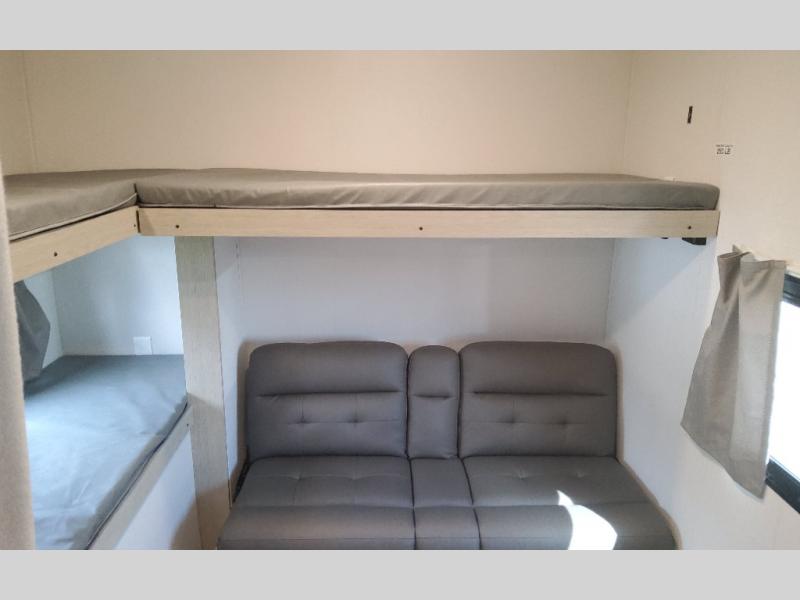 The little ones or your guests will love the bunkhouse in this spacious trailer. There area a set of 26" x 74" bunks, along with a flip-up bunk above a sofa they can sleep and relax. You'll find your own space in the front bedroom that includes a walk-around queen bed and dual wardrobes. Everyone can meet in the middle living area and kitchen to dine around the booth dinette or relax on the sofa. The chef will be able to create delicious meals each day on the three burner cooktop, and there is a residential style refrigerator for perishables. And the mid-coach full bath is sure to come in handy after a day of swimming or hiking!