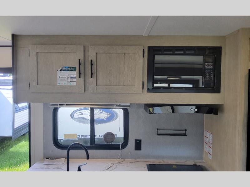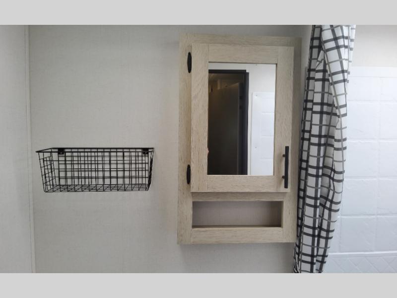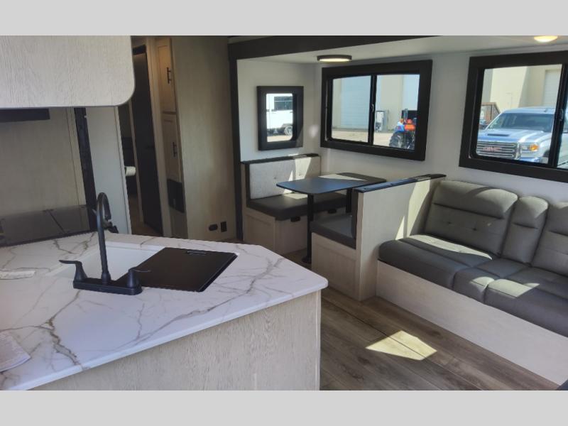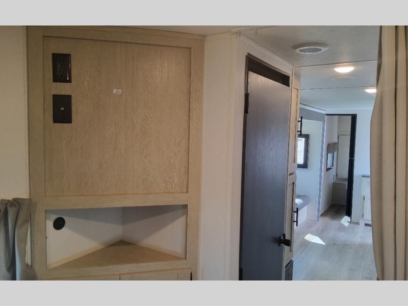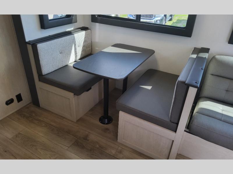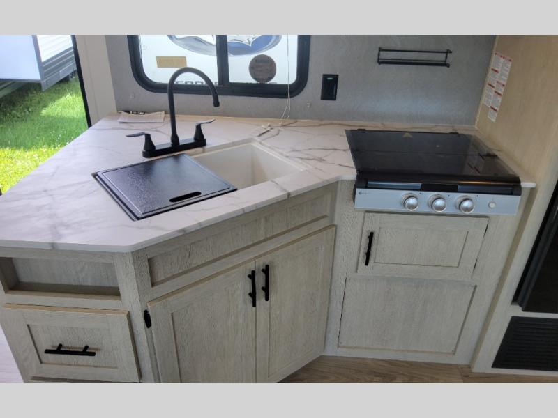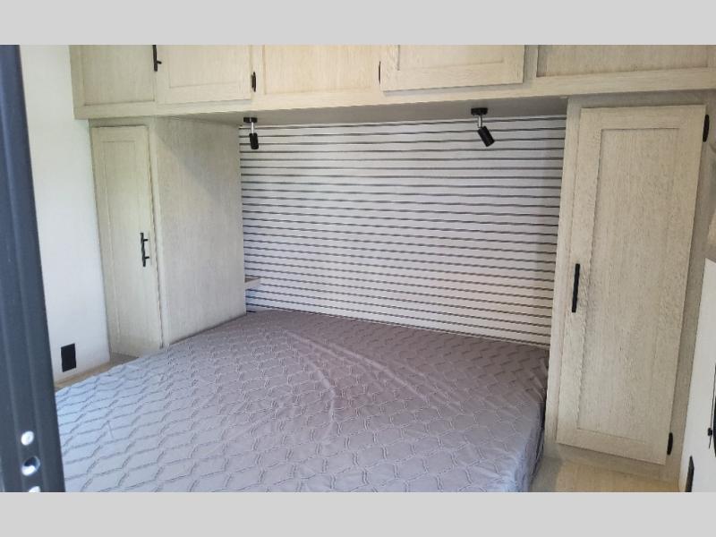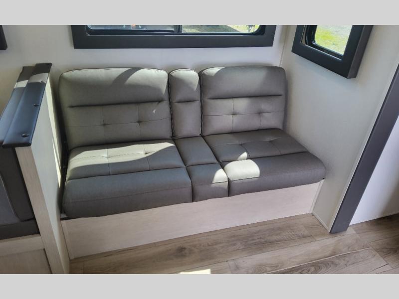 The little ones or your guests will love the bunkhouse in this spacious trailer. There area a set of 26" x 74" bunks, along with a flip-up bunk above a sofa they can sleep and relax. You'll find your own space in the front bedroom that includes a walk-around queen bed and dual wardrobes. Everyone can meet in the middle living area and kitchen to dine around the booth dinette or relax on the sofa. The chef will be able to create delicious meals each day on the three burner cooktop, and there is a residential style refrigerator for perishables. And the mid-coach full bath is sure to come in handy after a day of swimming or hiking!