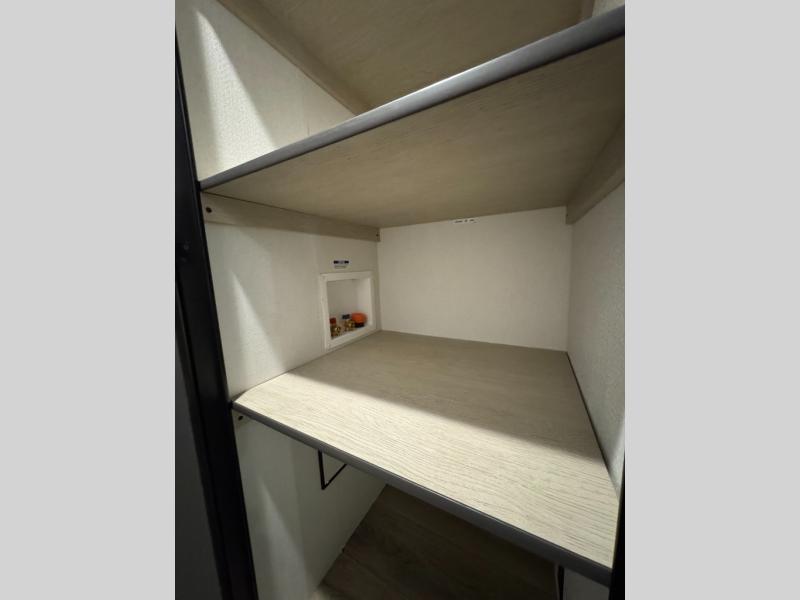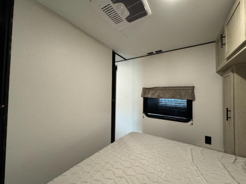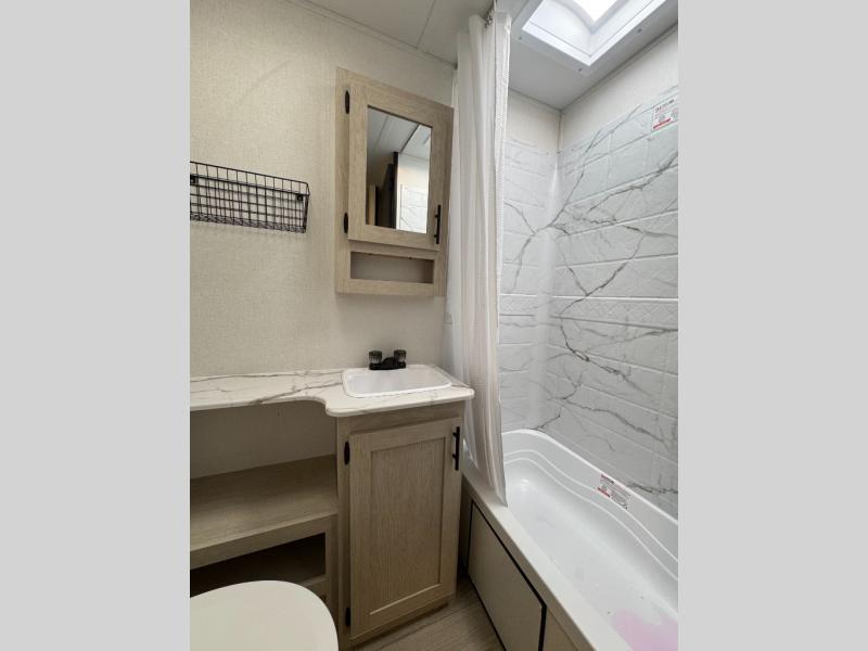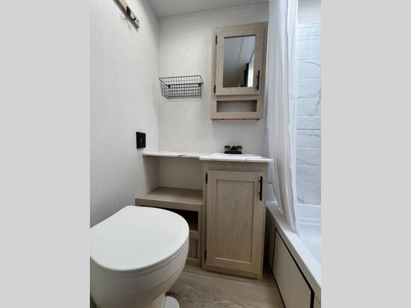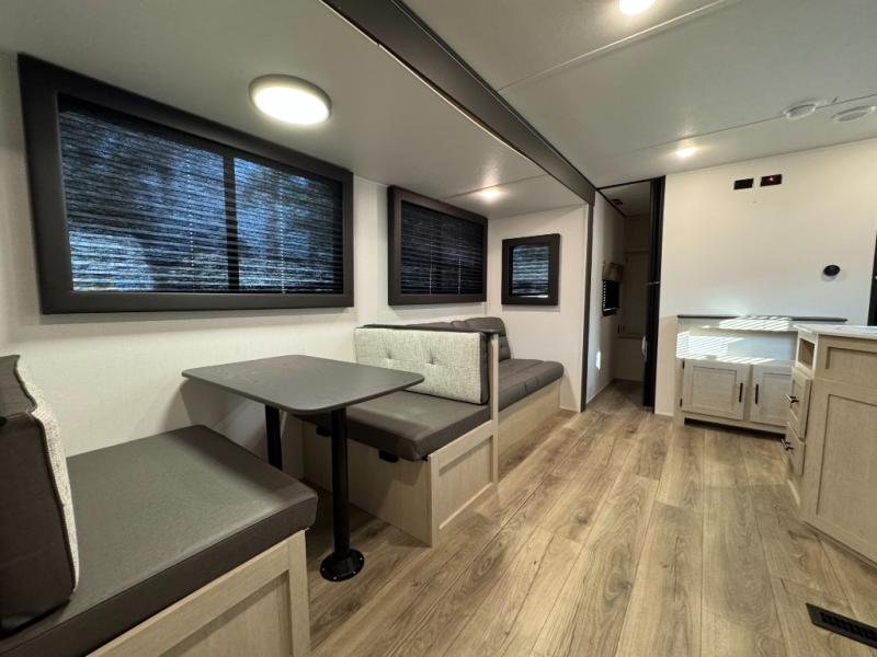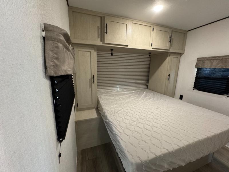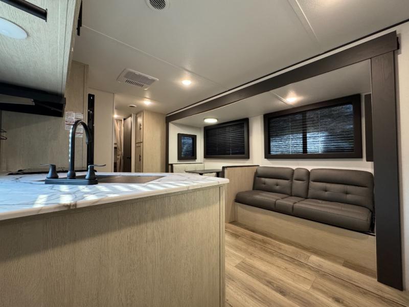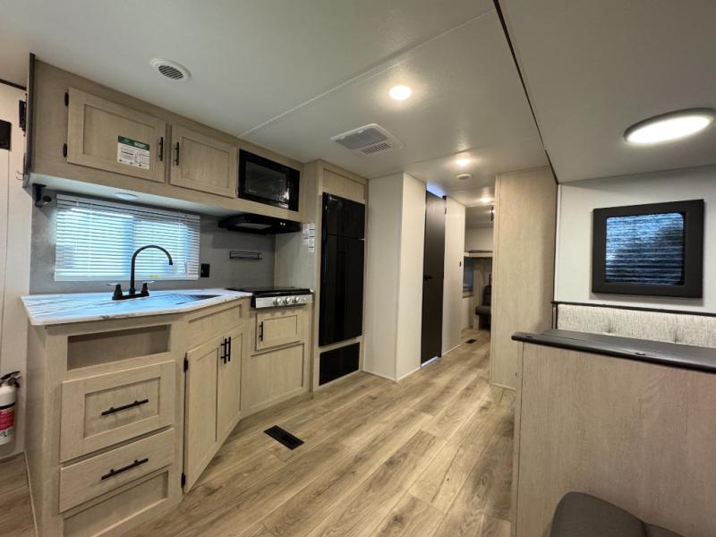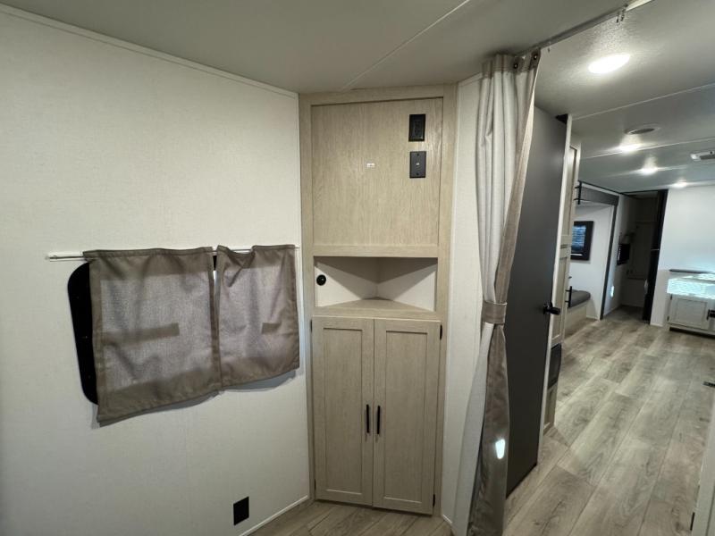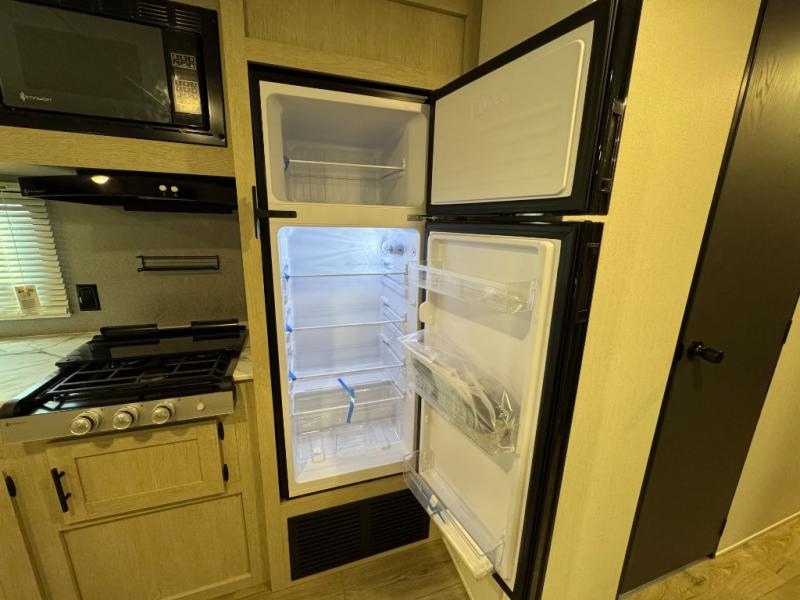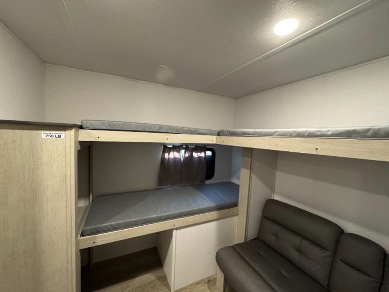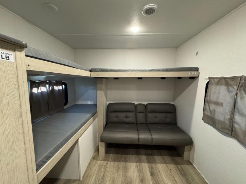 The little ones or your guests will love the bunkhouse in this spacious trailer. There area a set of 26" x 74" bunks, along with a flip-up bunk above a sofa they can sleep and relax. You'll find your own space in the front bedroom that includes a walk-around queen bed and dual wardrobes. Everyone can meet in the middle living area and kitchen to dine around the booth dinette or relax on the sofa. The chef will be able to create delicious meals each day on the three burner cooktop, and there is a residential style refrigerator for perishables. And the mid-coach full bath is sure to come in handy after a day of swimming or hiking!