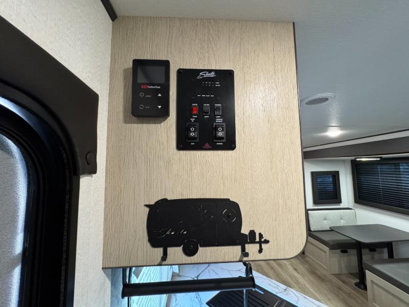 In any Shasta i-5 Edition travel trailer, you will find quality craftsmanship along with an affordable price tag. These units each feature four stabilizer jacks to make setting up easier and an enclosed underbelly for added protection as you travel. The Base Camp Package provides each unit with black tank flush, a monitor panel for quick access to the functions of your unit, a 13.5K A/C unit, and a tankless water heater for added convenience. Inside, you'll find seamless countertops, sink covers, a portable Bluetooth speaker, and more comforts!