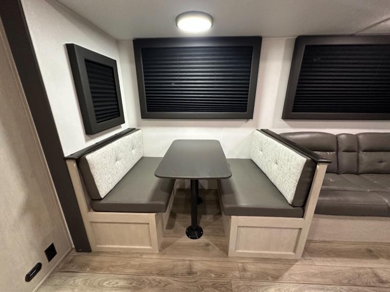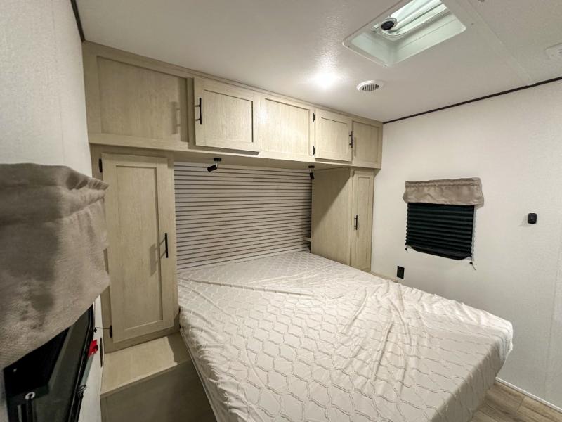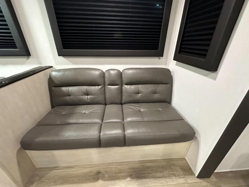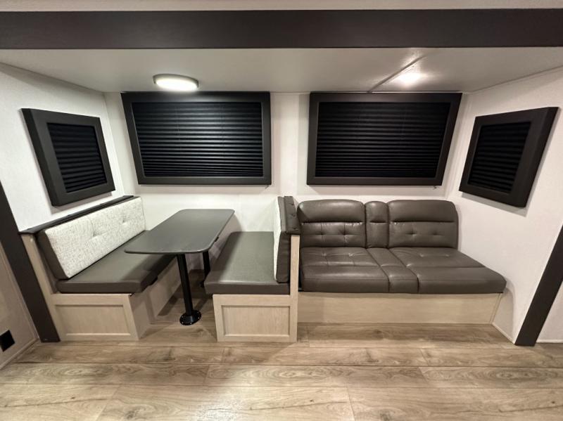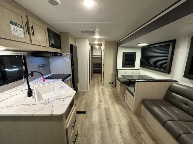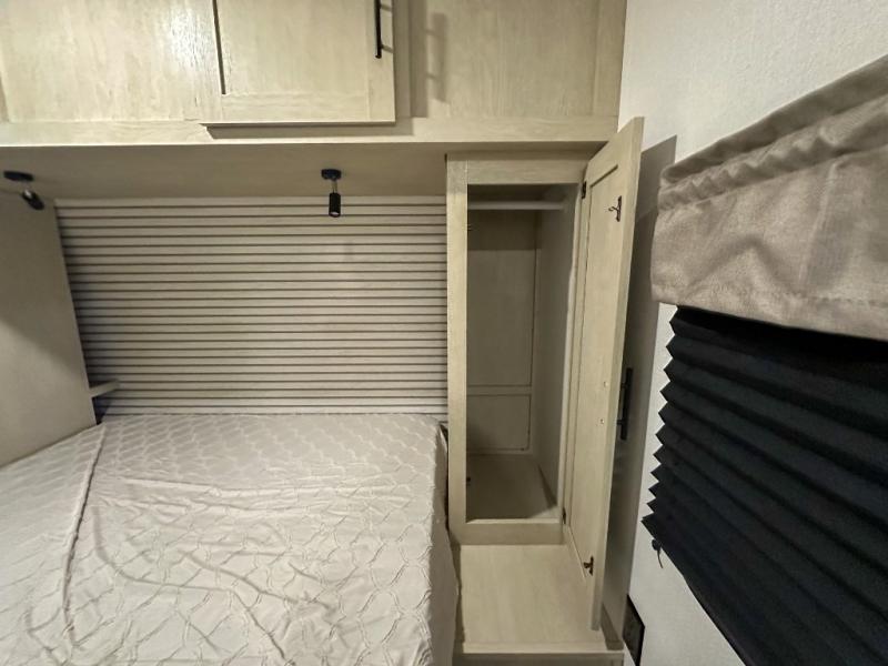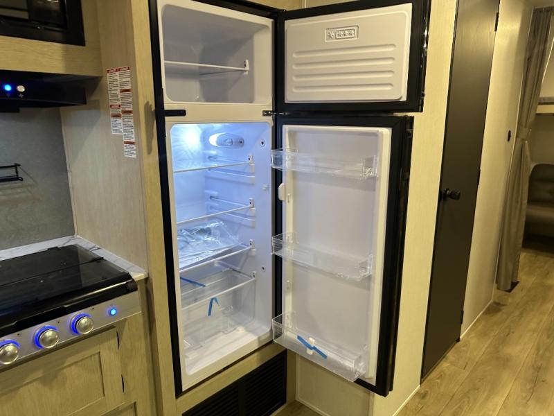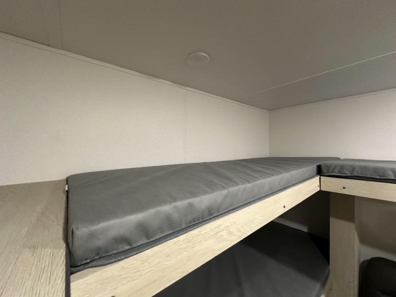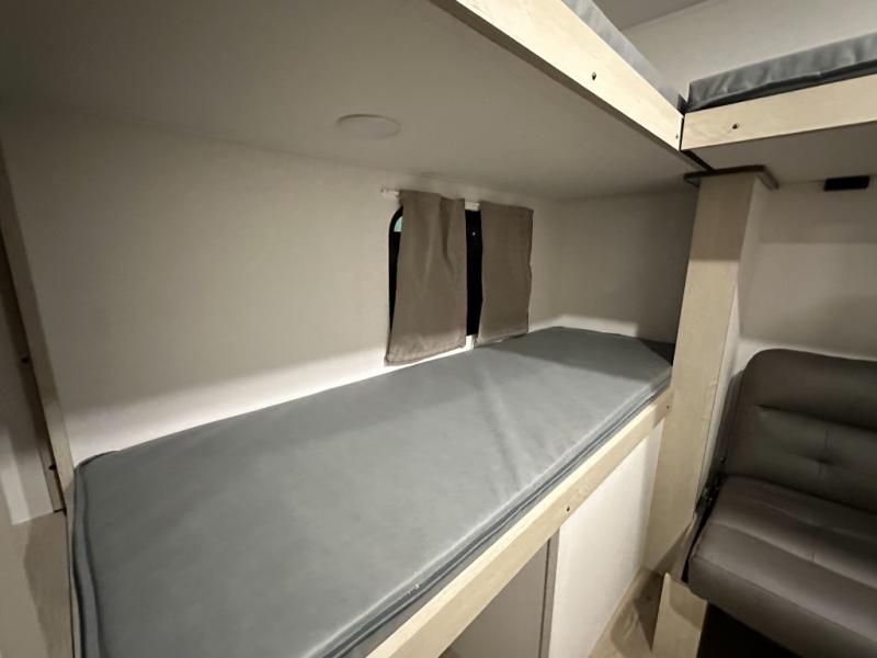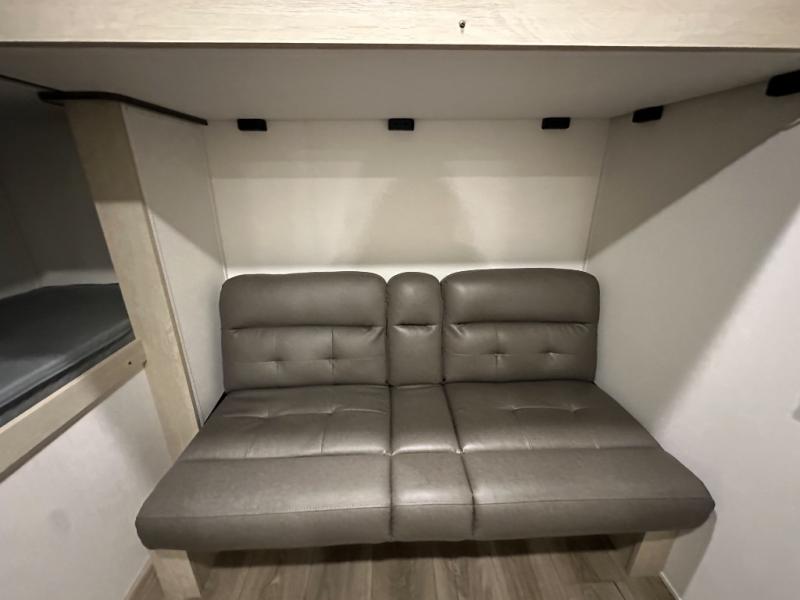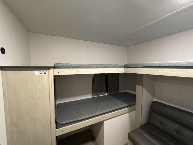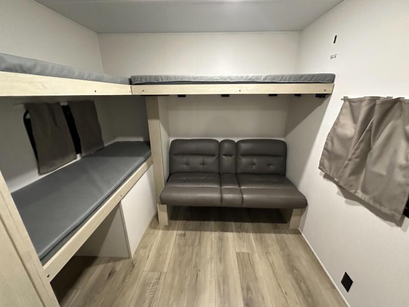 The little ones or your guests will love the bunkhouse in this spacious trailer. There area a set of 26" x 74" bunks, along with a flip-up bunk above a sofa they can sleep and relax. You'll find your own space in the front bedroom that includes a walk-around queen bed and dual wardrobes. Everyone can meet in the middle living area and kitchen to dine around the booth dinette or relax on the sofa. The chef will be able to create delicious meals each day on the three burner cooktop, and there is a residential style refrigerator for perishables. And the mid-coach full bath is sure to come in handy after a day of swimming or hiking!