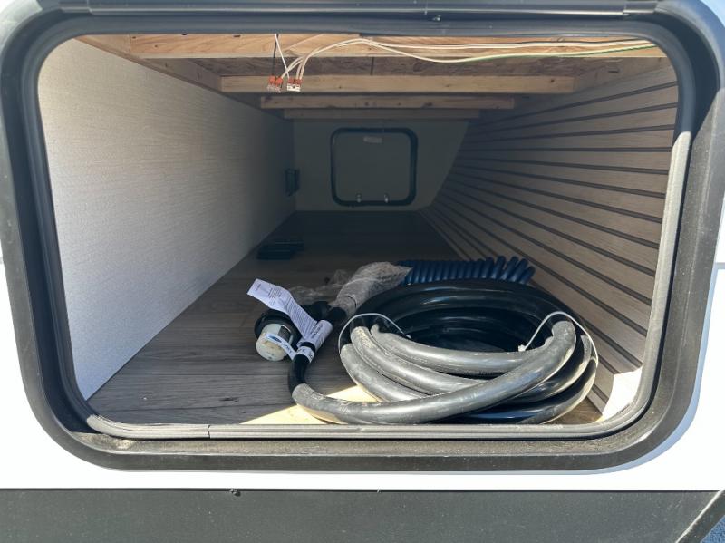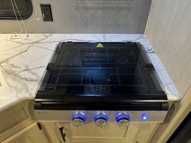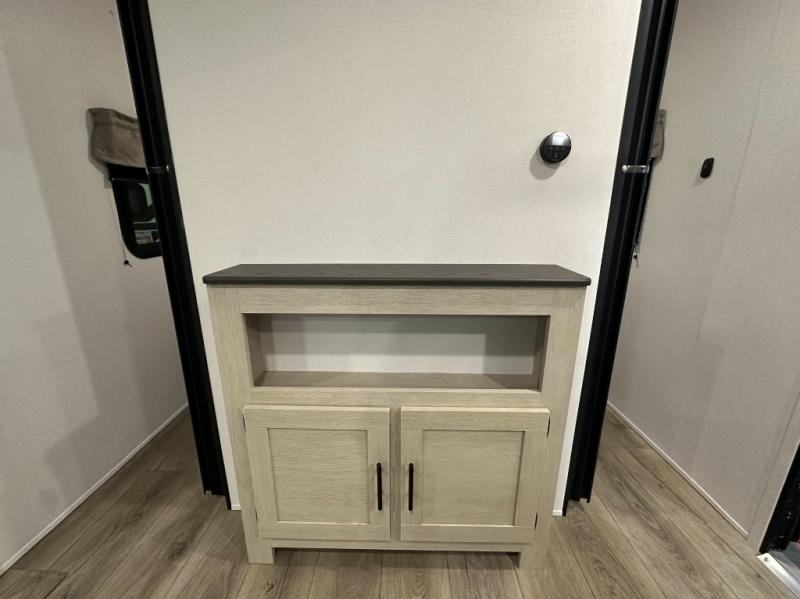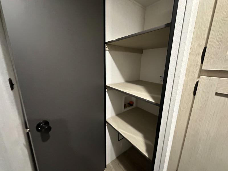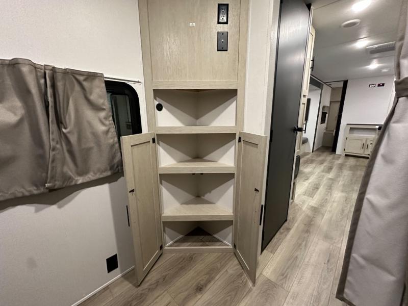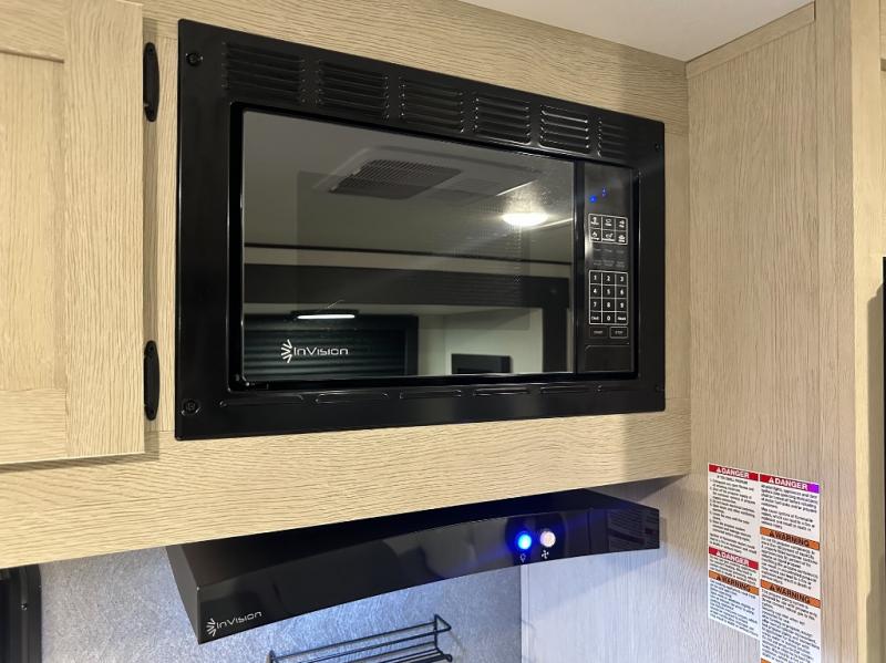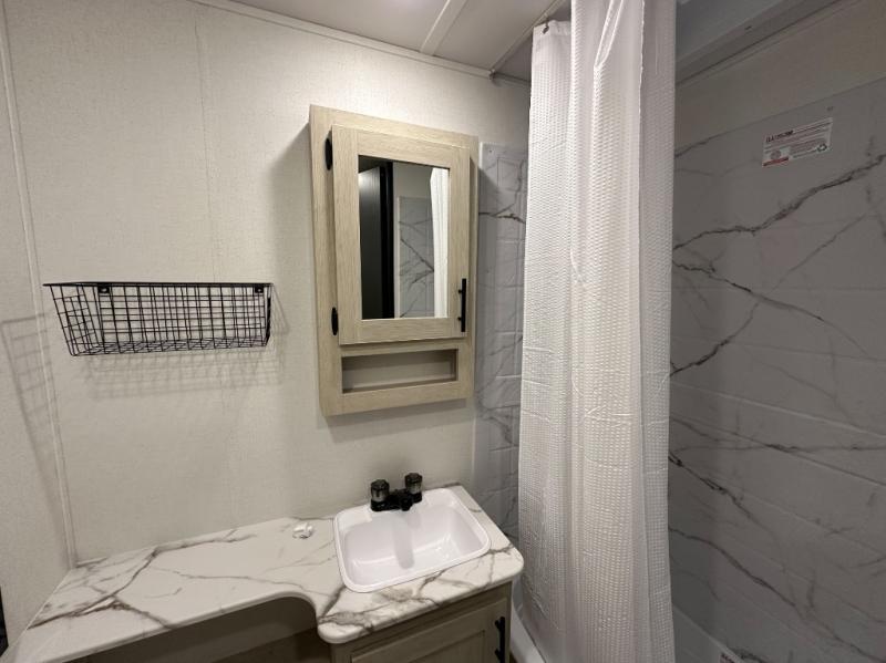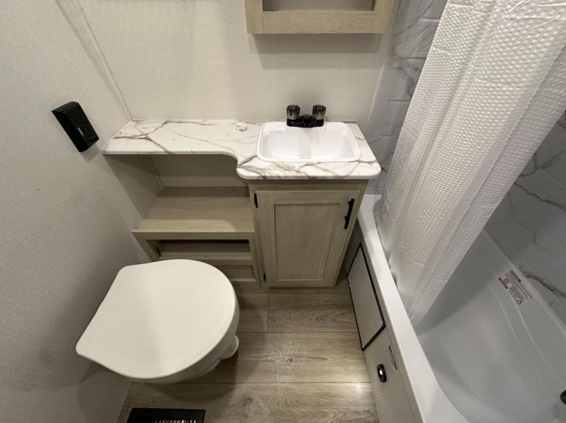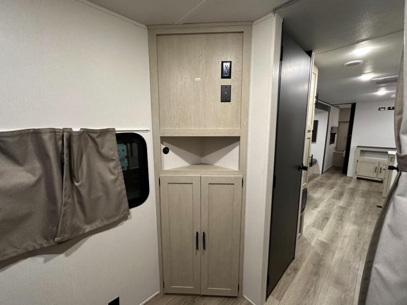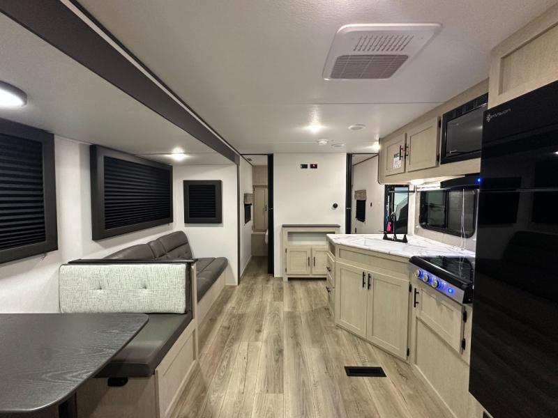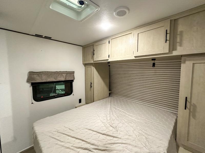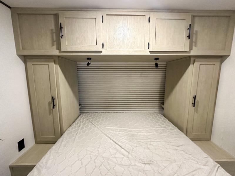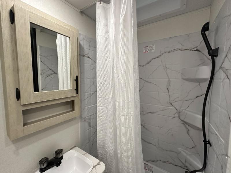 The little ones or your guests will love the bunkhouse in this spacious trailer. There area a set of 26" x 74" bunks, along with a flip-up bunk above a sofa they can sleep and relax. You'll find your own space in the front bedroom that includes a walk-around queen bed and dual wardrobes. Everyone can meet in the middle living area and kitchen to dine around the booth dinette or relax on the sofa. The chef will be able to create delicious meals each day on the three burner cooktop, and there is a residential style refrigerator for perishables. And the mid-coach full bath is sure to come in handy after a day of swimming or hiking!