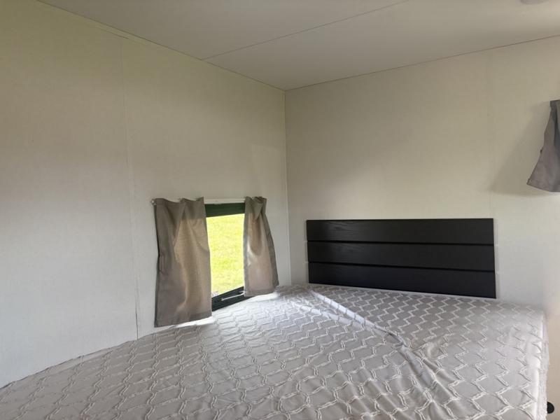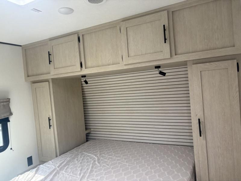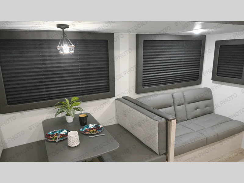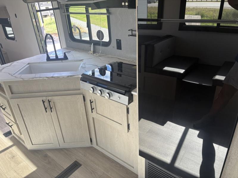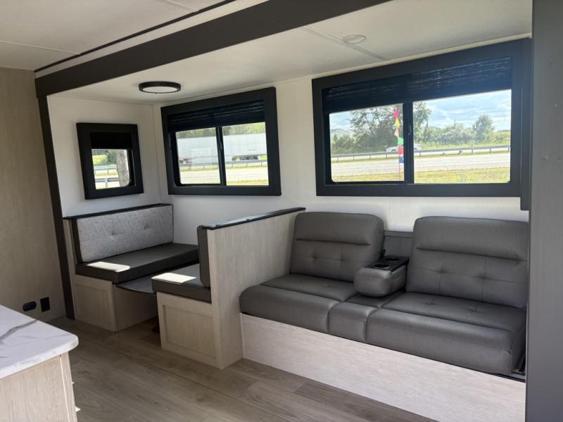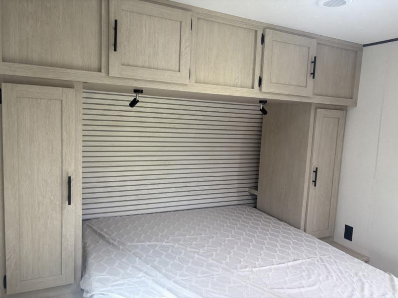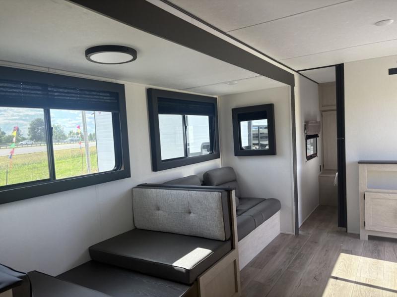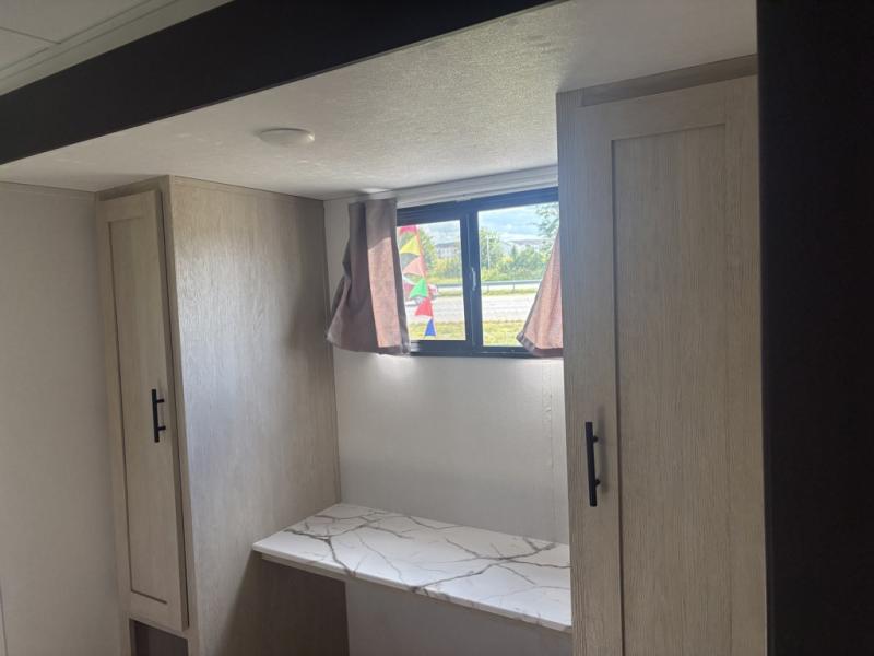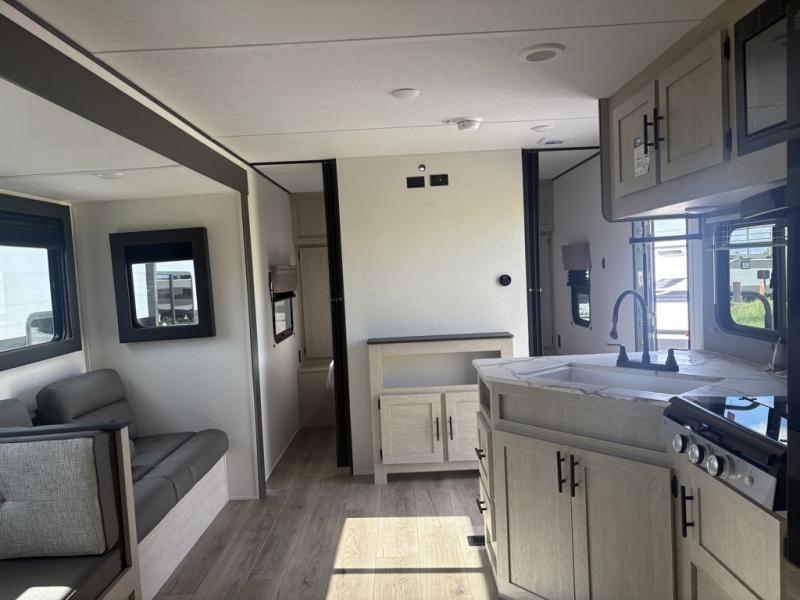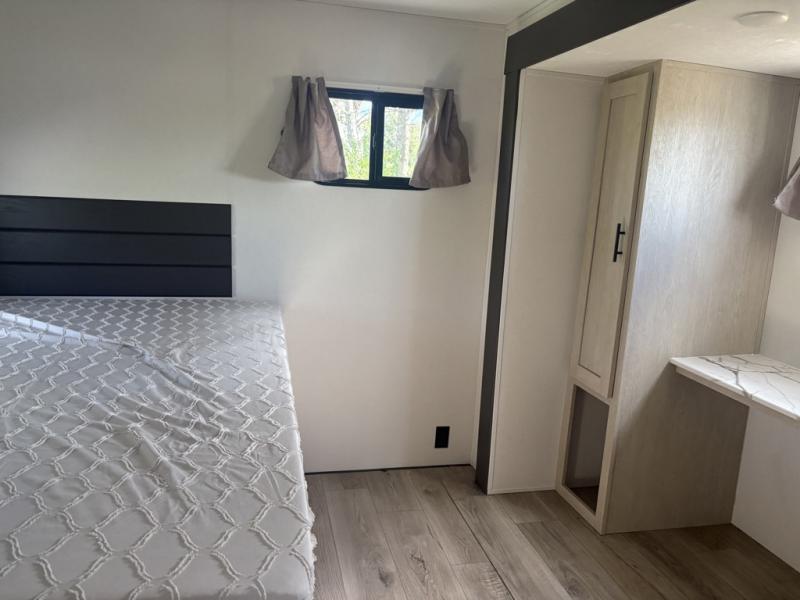 There are a set of 38" x 74" bunks and a set of 26" x 74" bunks in this trailer for lots of sleeping space! This bunkroom also includes a slide out for more space, and you can choose the optional double suite with a 54" x 74" bed if you don't need the bunks. The kitchen is fully equipped for your camping trips featuring a three burner cooktop, an overhead microwave oven, a large sink, and plenty of storage space. You will also love the pantry for all of your canned goods and snacks. The bath features a 24" x 40" shower, toilet, and vanity/sink. In the front of this unit, a private bedroom provides a quiet retreat from the rest of the unit with dual entry doors, and you'll appreciate having dual bedroom wardrobes to keep your clothes organized. Outside, enjoy pass-through storage for all of your outdoor camping gear plus more.