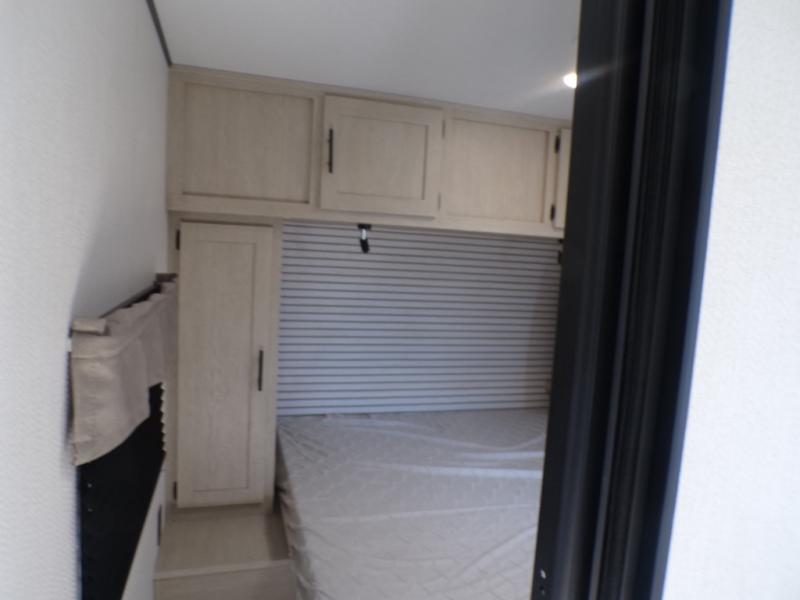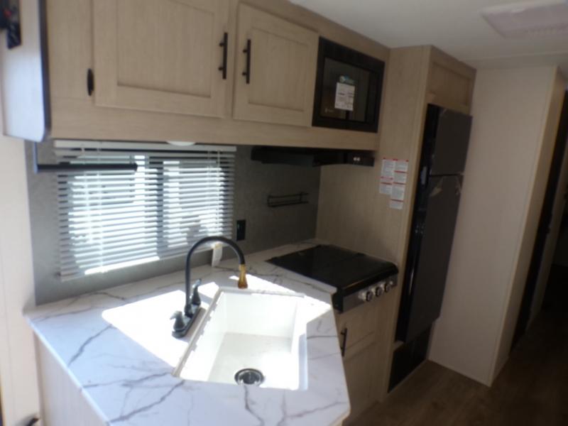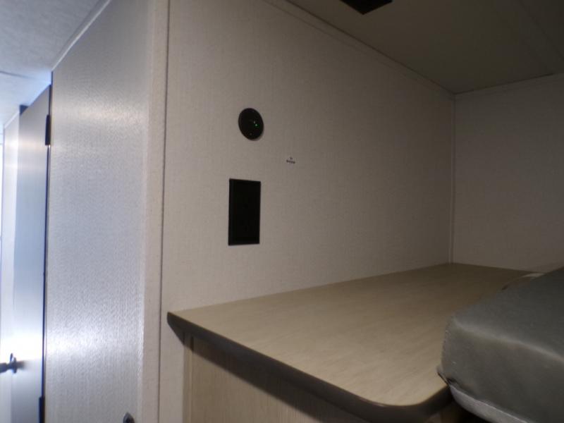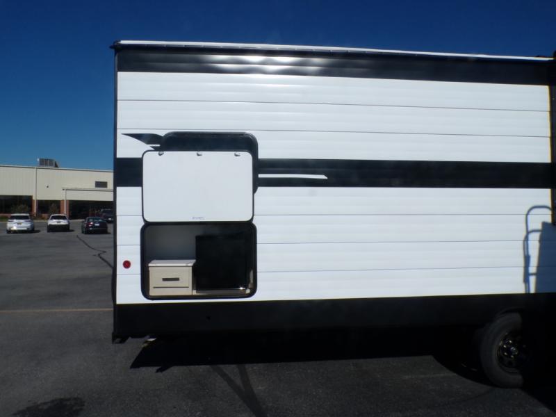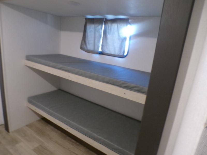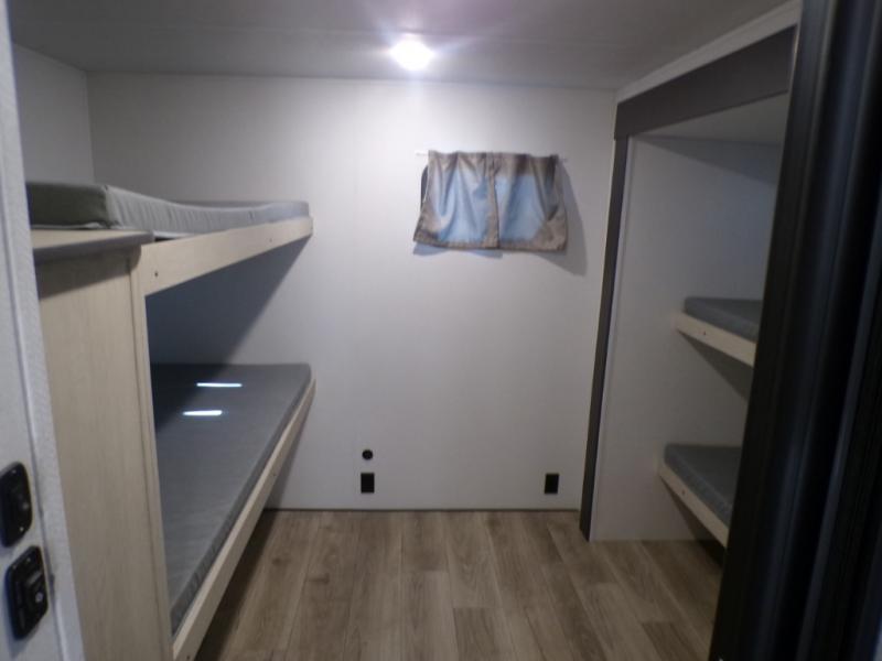 There are a set of 38" x 74" bunks and a set of 26" x 74" bunks in this trailer for lots of sleeping space! This bunkroom also includes a slide out for more space, and you can choose the optional double suite with a 54" x 74" bed if you don't need the bunks. The kitchen is fully equipped for your camping trips featuring a three burner cooktop, an overhead microwave oven, a large sink, and plenty of storage space. You will also love the pantry for all of your canned goods and snacks. The bath features a 24" x 40" shower, toilet, and vanity/sink. In the front of this unit, a private bedroom provides a quiet retreat from the rest of the unit with dual entry doors, and you'll appreciate having dual bedroom wardrobes to keep your clothes organized. Outside, enjoy pass-through storage for all of your outdoor camping gear plus more.