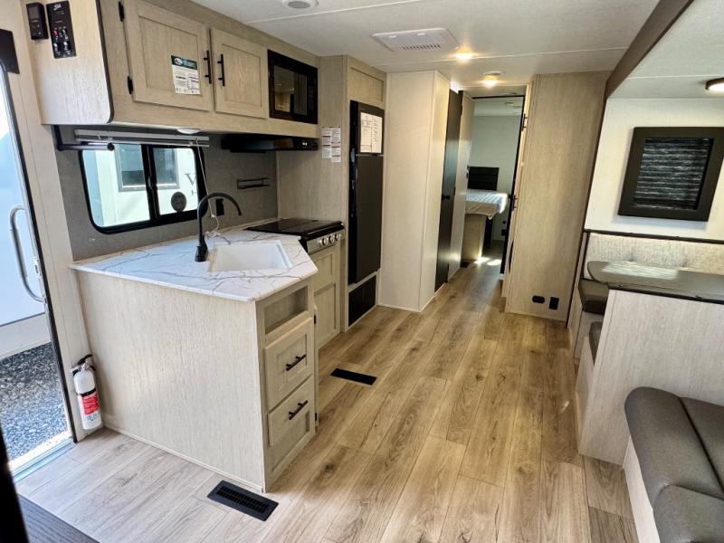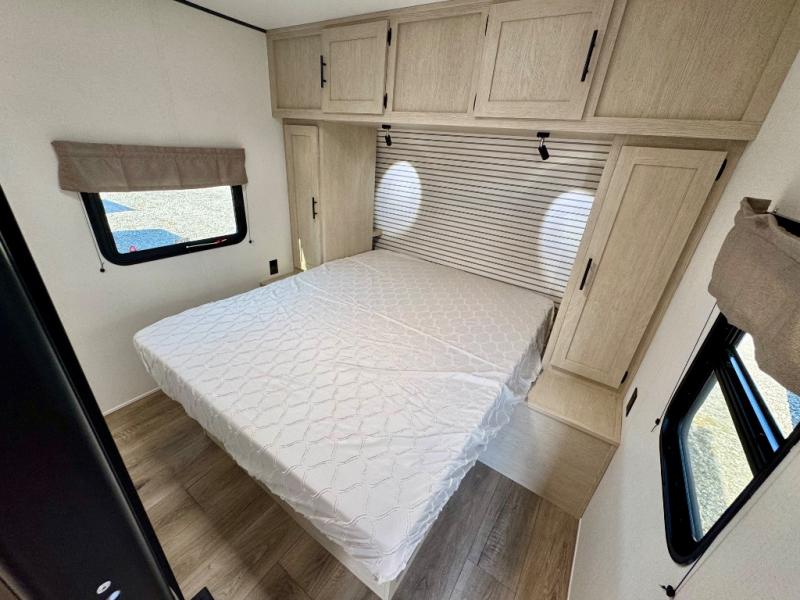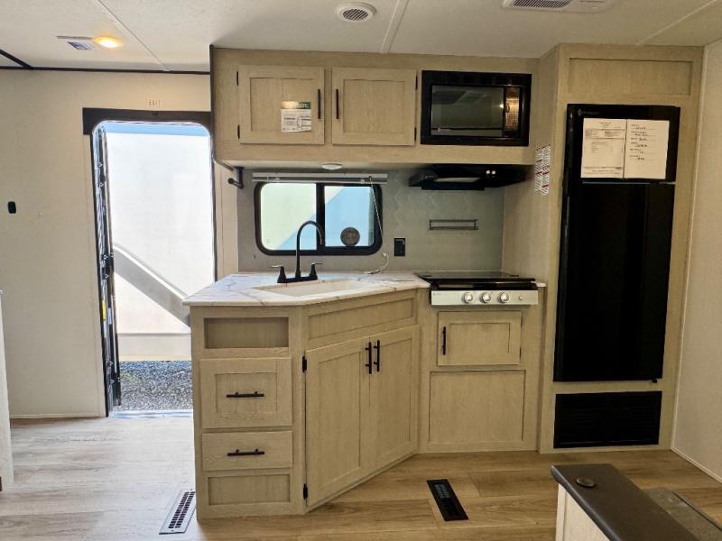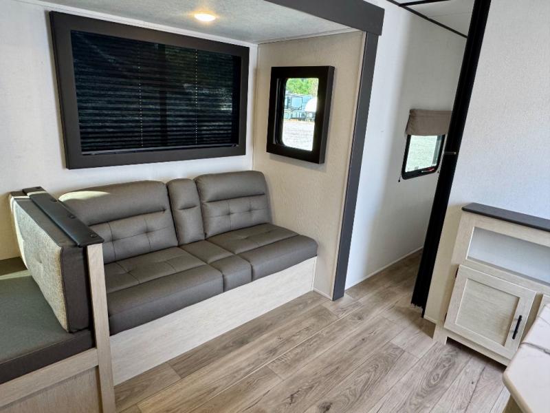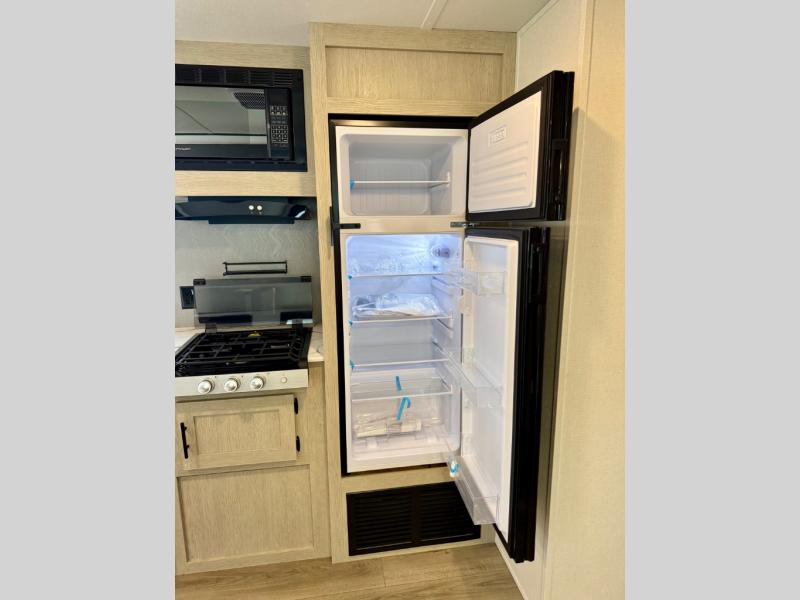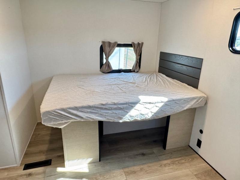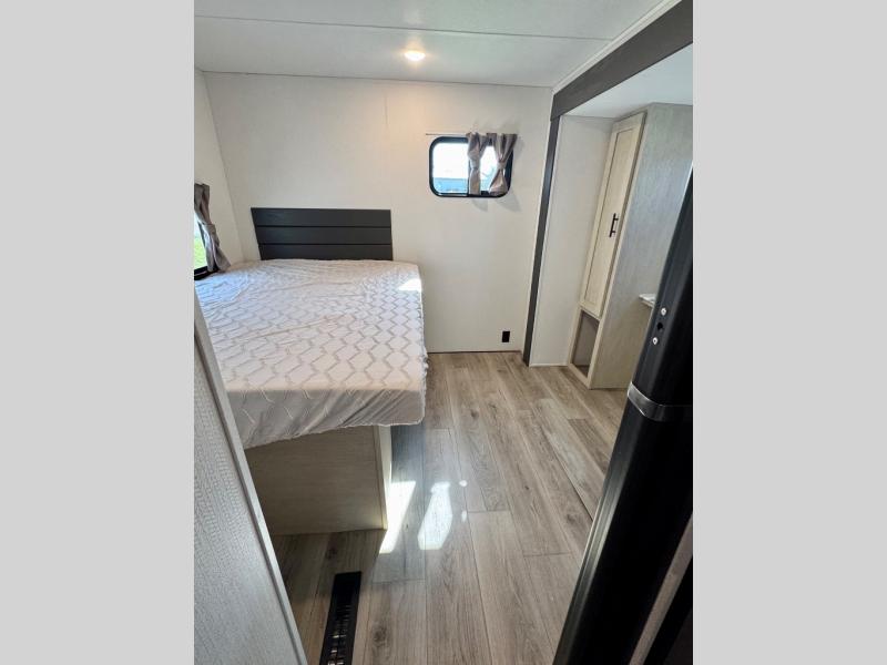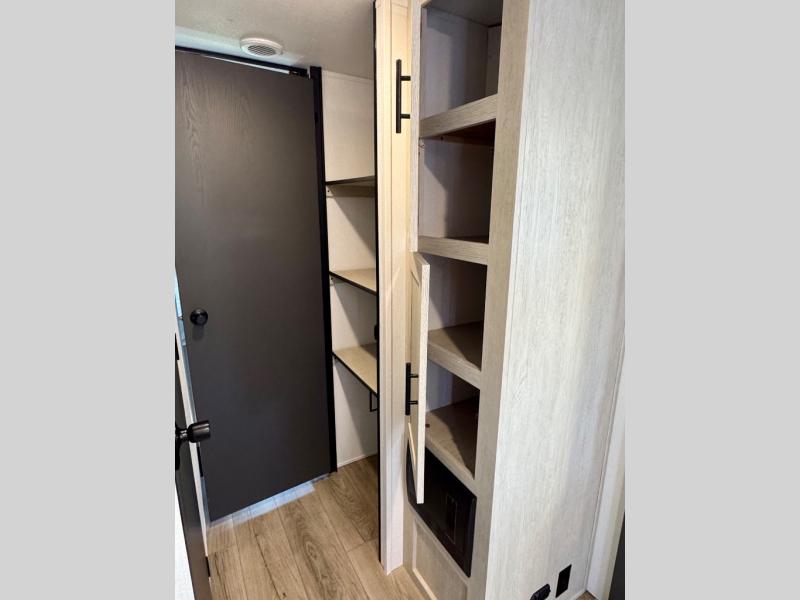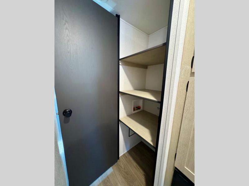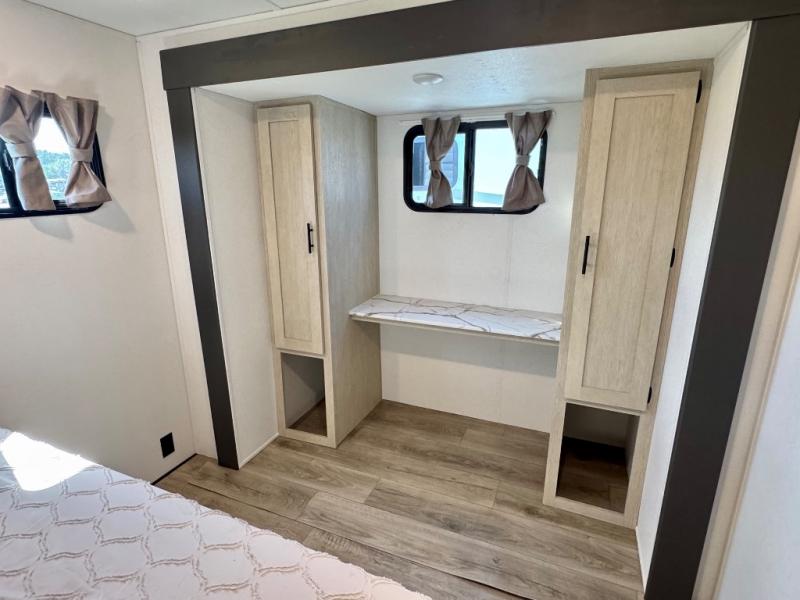 There are a set of 38" x 74" bunks and a set of 26" x 74" bunks in this trailer for lots of sleeping space! This bunkroom also includes a slide out for more space, and you can choose the optional double suite with a 54" x 74" bed if you don't need the bunks. The kitchen is fully equipped for your camping trips featuring a three burner cooktop, an overhead microwave oven, a large sink, and plenty of storage space. You will also love the pantry for all of your canned goods and snacks. The bath features a 24" x 40" shower, toilet, and vanity/sink. In the front of this unit, a private bedroom provides a quiet retreat from the rest of the unit with dual entry doors, and you'll appreciate having dual bedroom wardrobes to keep your clothes organized. Outside, enjoy pass-through storage for all of your outdoor camping gear plus more.