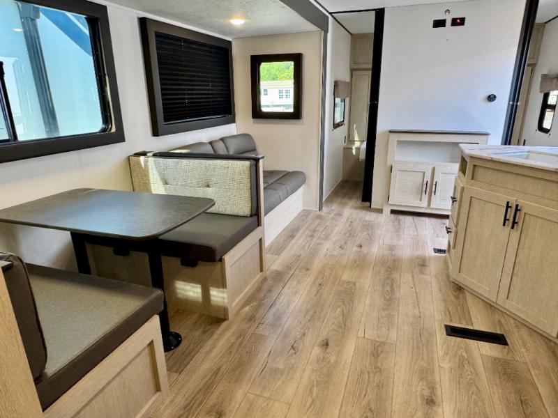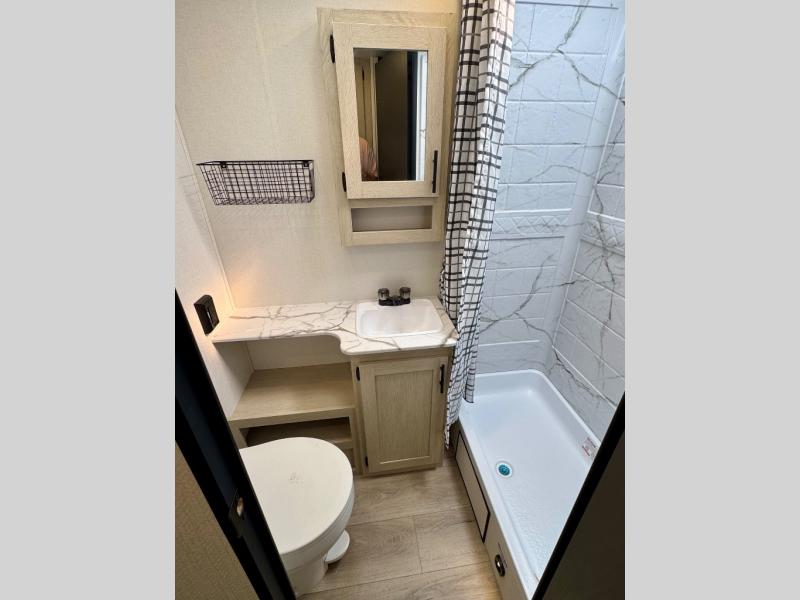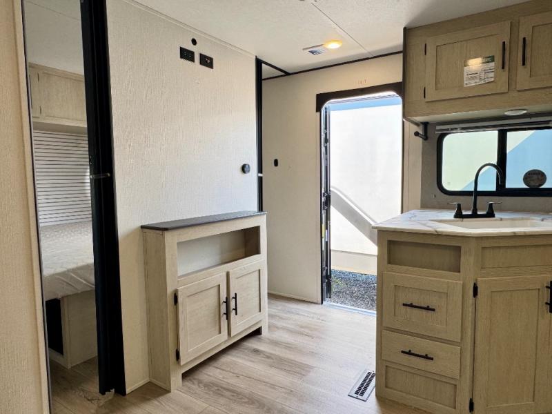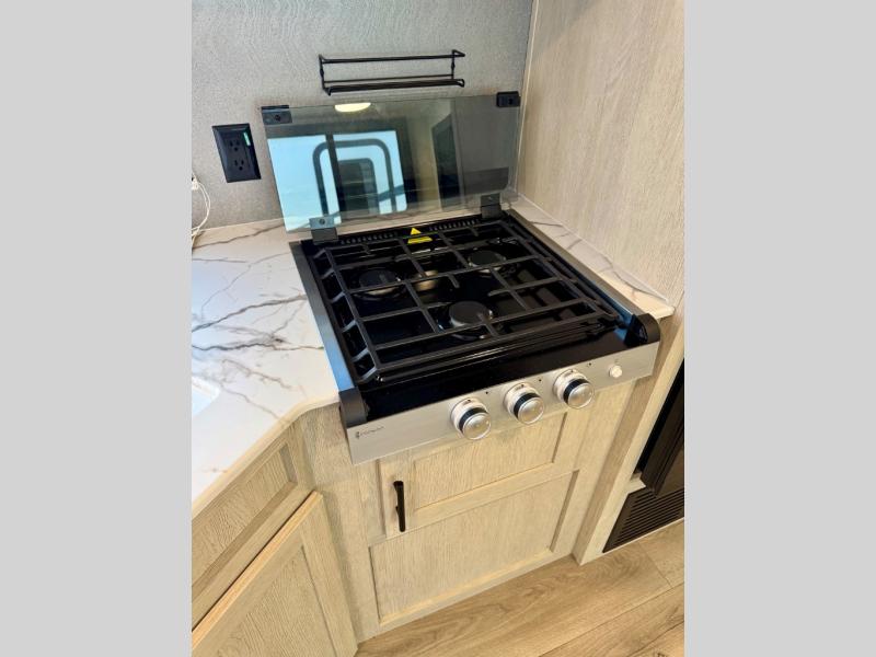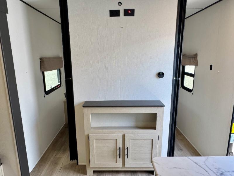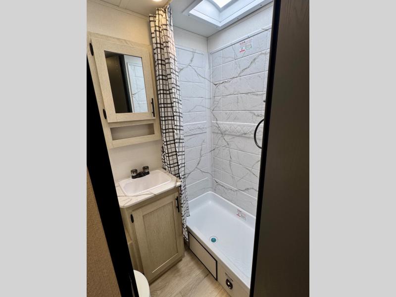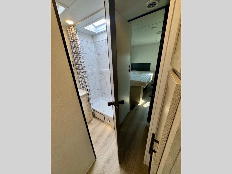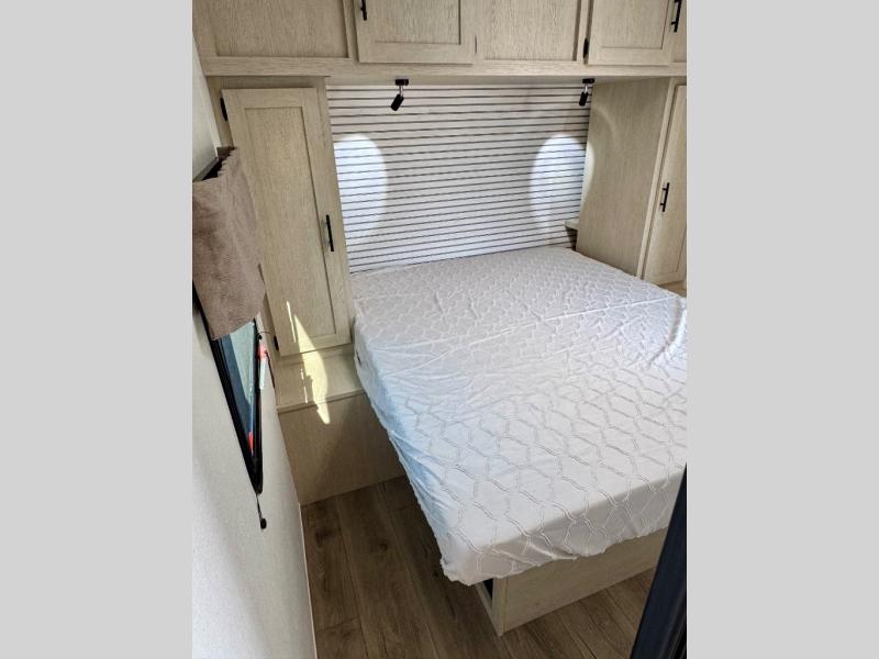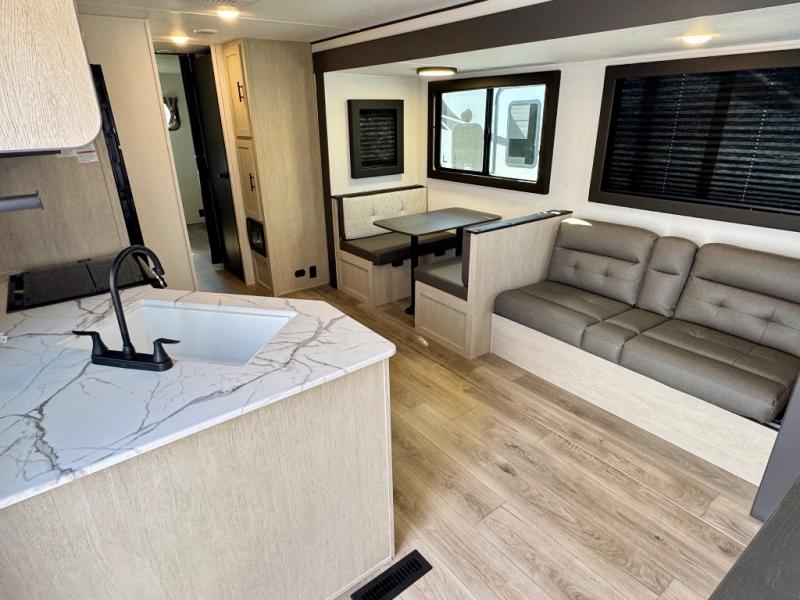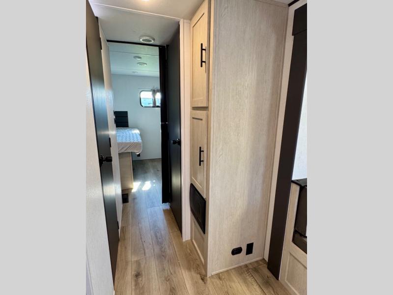 There are a set of 38" x 74" bunks and a set of 26" x 74" bunks in this trailer for lots of sleeping space! This bunkroom also includes a slide out for more space, and you can choose the optional double suite with a 54" x 74" bed if you don't need the bunks. The kitchen is fully equipped for your camping trips featuring a three burner cooktop, an overhead microwave oven, a large sink, and plenty of storage space. You will also love the pantry for all of your canned goods and snacks. The bath features a 24" x 40" shower, toilet, and vanity/sink. In the front of this unit, a private bedroom provides a quiet retreat from the rest of the unit with dual entry doors, and you'll appreciate having dual bedroom wardrobes to keep your clothes organized. Outside, enjoy pass-through storage for all of your outdoor camping gear plus more.