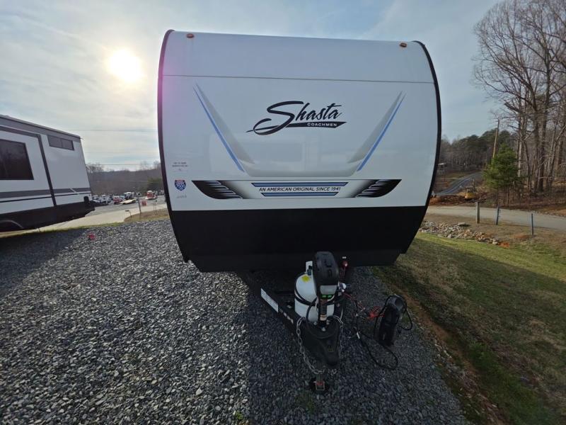 In any Shasta i-5 Edition travel trailer, you will find quality craftsmanship along with an affordable price tag. These units each feature brawn built sidewalls for sturdiness and an enclosed underbelly for added protection as you travel. The Base Camp Package provides each unit with black tank flush, a monitor panel for quick access to the functions of your unit, a 13.5K A/C unit, and a tankless water heater for added convenience. Inside, you'll find pocket-bored and screwed cabinets, skylights, a portable Bluetooth speaker, and more comforts!