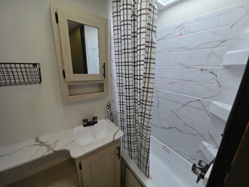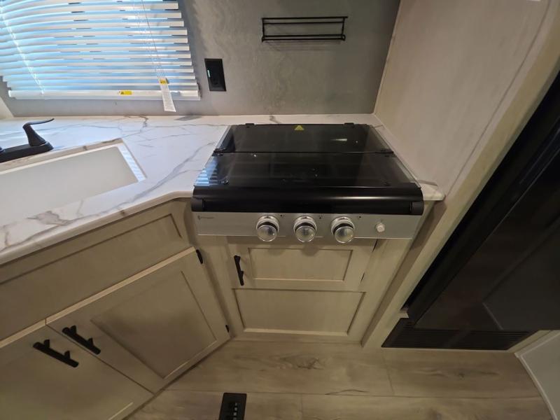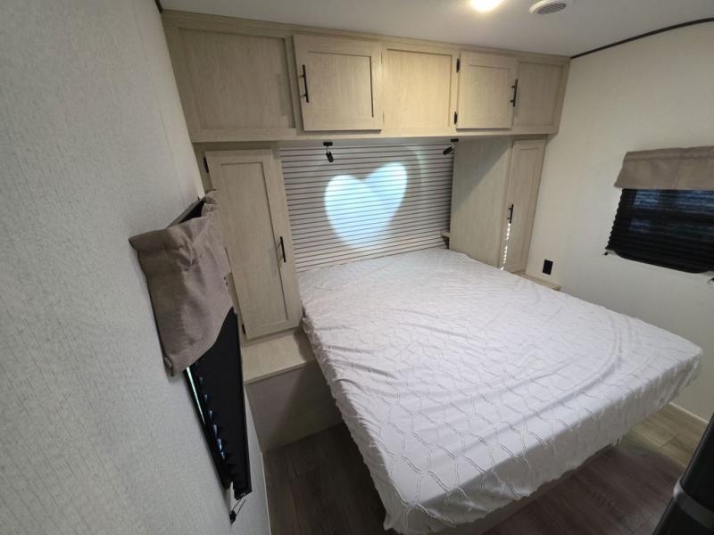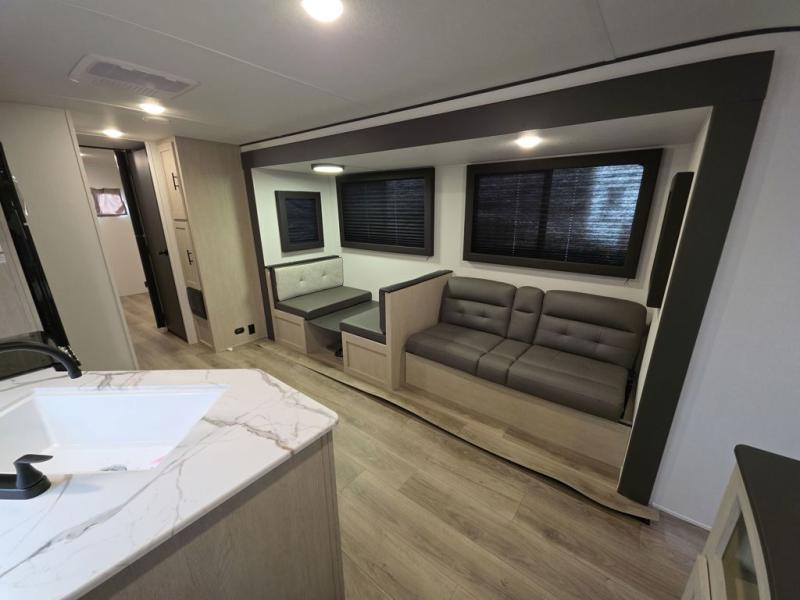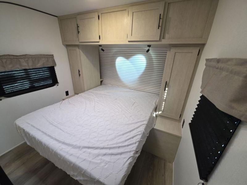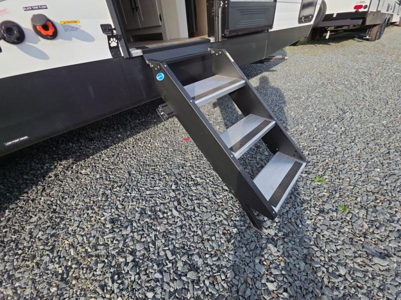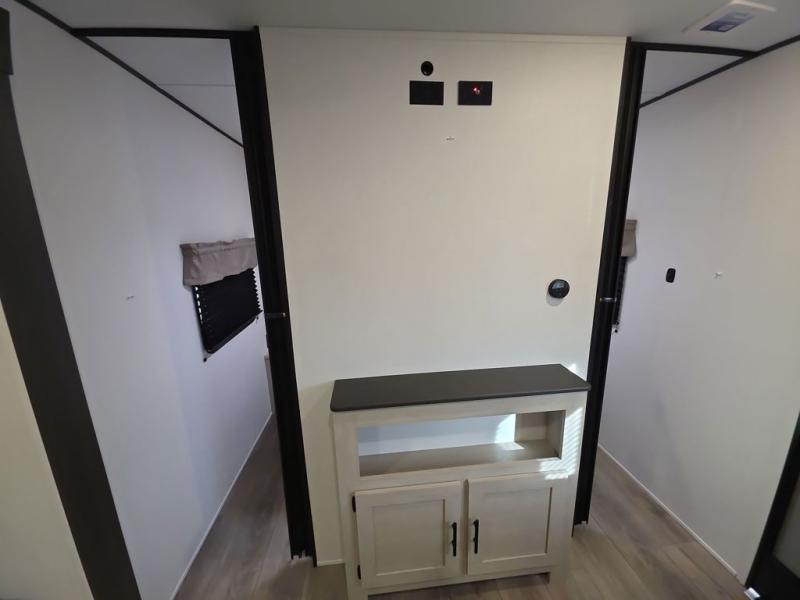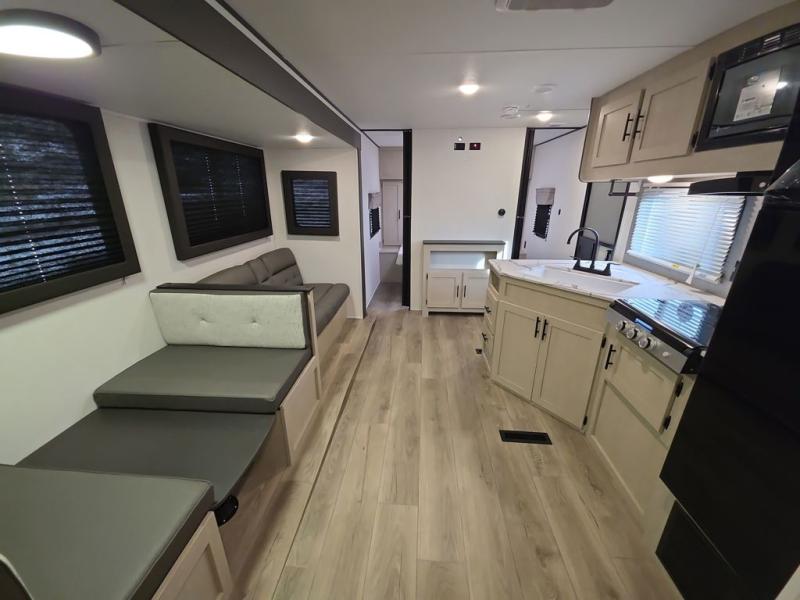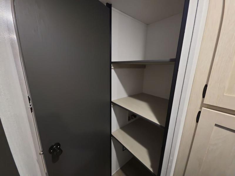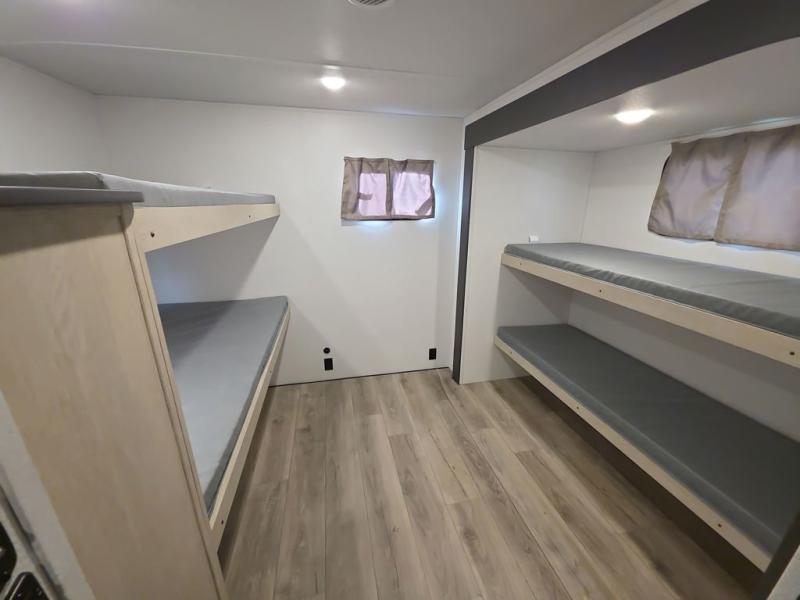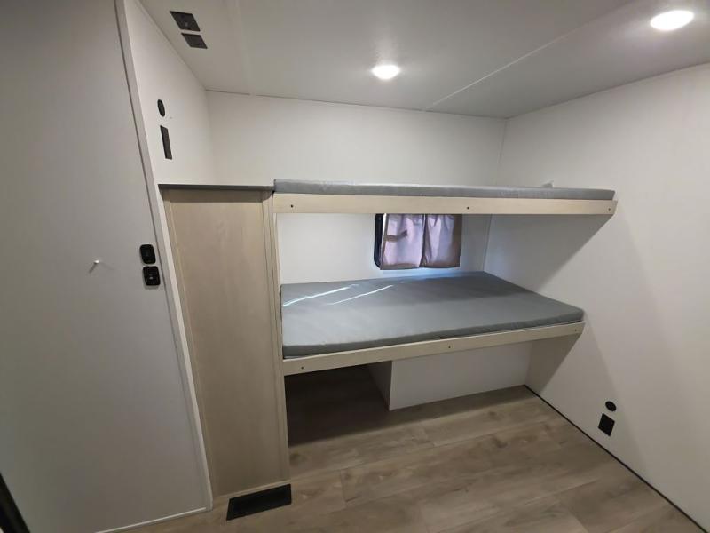 There are a set of 38" x 74" bunks and a set of 26" x 74" bunks in this trailer for lots of sleeping space! This bunkroom also includes a slide out for more space, and you can choose the optional double suite with a 54" x 74" bed if you don't need the bunks. The kitchen is fully equipped for your camping trips featuring a three burner cooktop, an overhead microwave oven, a large sink, and plenty of storage space. You will also love the pantry for all of your canned goods and snacks. The bath features a 24" x 40" shower, toilet, and vanity/sink. In the front of this unit, a private bedroom provides a quiet retreat from the rest of the unit with dual entry doors, and you'll appreciate having dual bedroom wardrobes to keep your clothes organized. Outside, enjoy pass-through storage for all of your outdoor camping gear plus more.