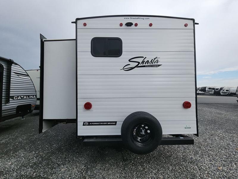 In any Shasta i-5 Edition travel trailer, you will find quality craftsmanship along with an affordable price tag. These units each feature brawn built sidewalls for sturdiness and an enclosed underbelly for added protection as you travel. The Base Camp Package provides each unit with black tank flush, a monitor panel for quick access to the functions of your unit, a 13.5K A/C unit, and a tankless water heater for added convenience. Inside, you'll find pocket-bored and screwed cabinets, skylights, a portable Bluetooth speaker, and more comforts!